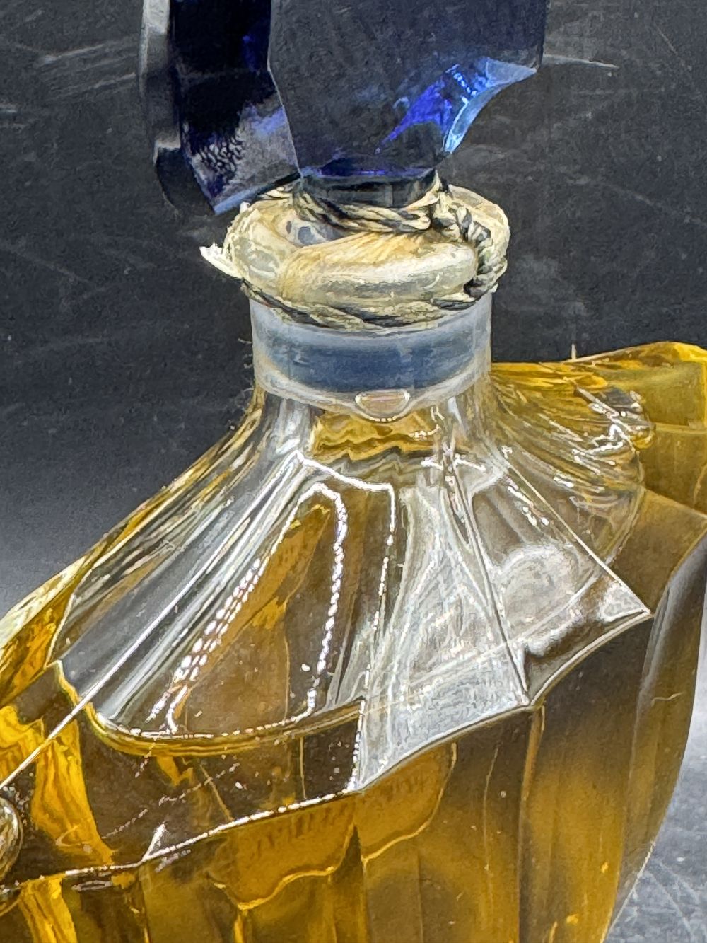 Modèle Chauve Souris des années 80 en verre incolore pressé moulé – Bouchon éventail en verre teinté bleu Bosphore et inscrit Guerlain Paris en or