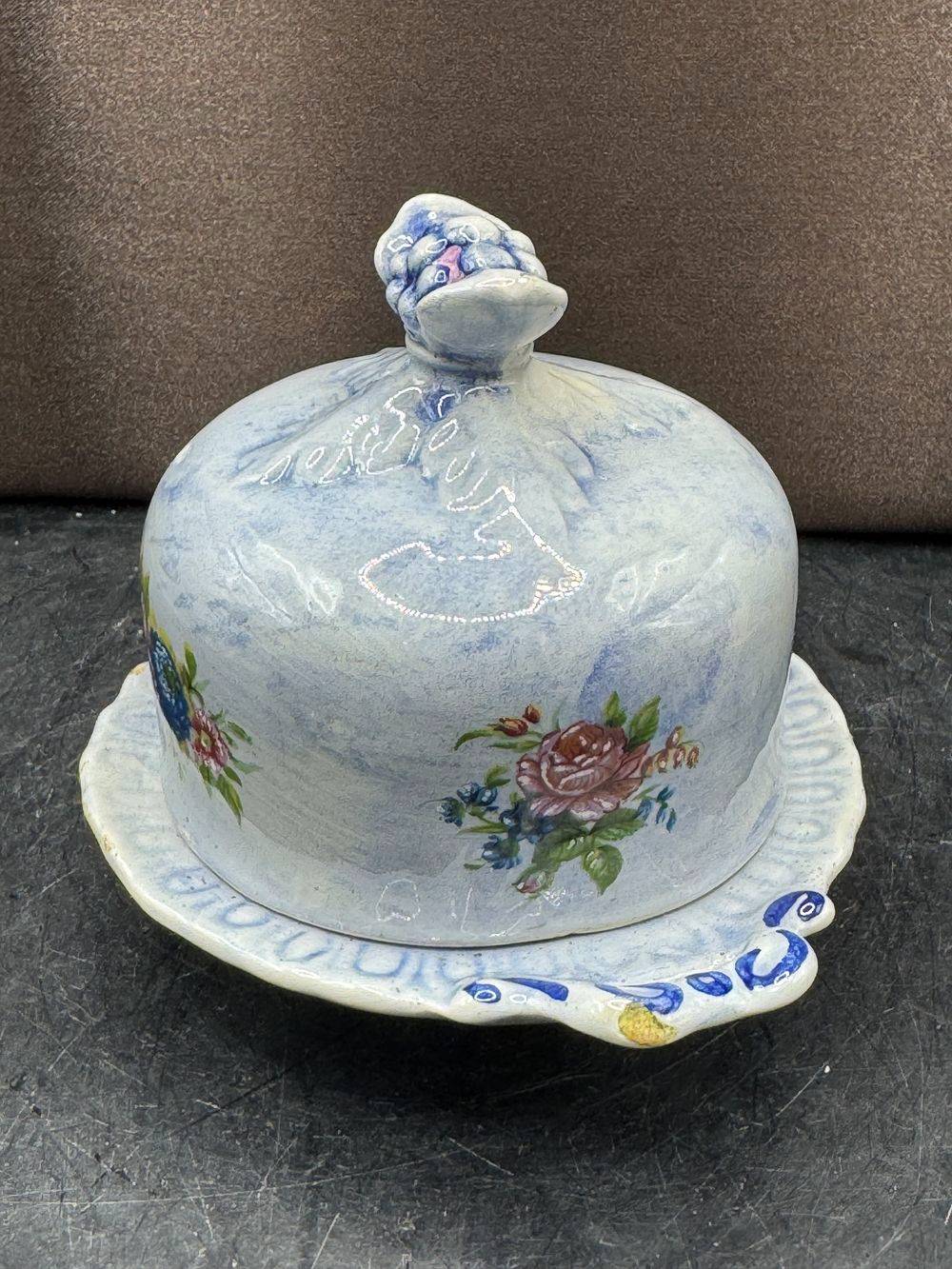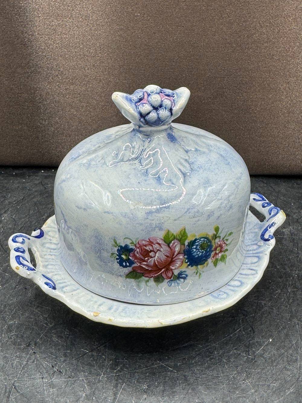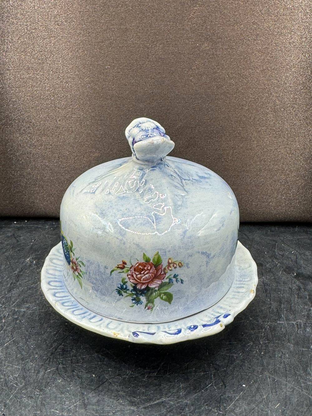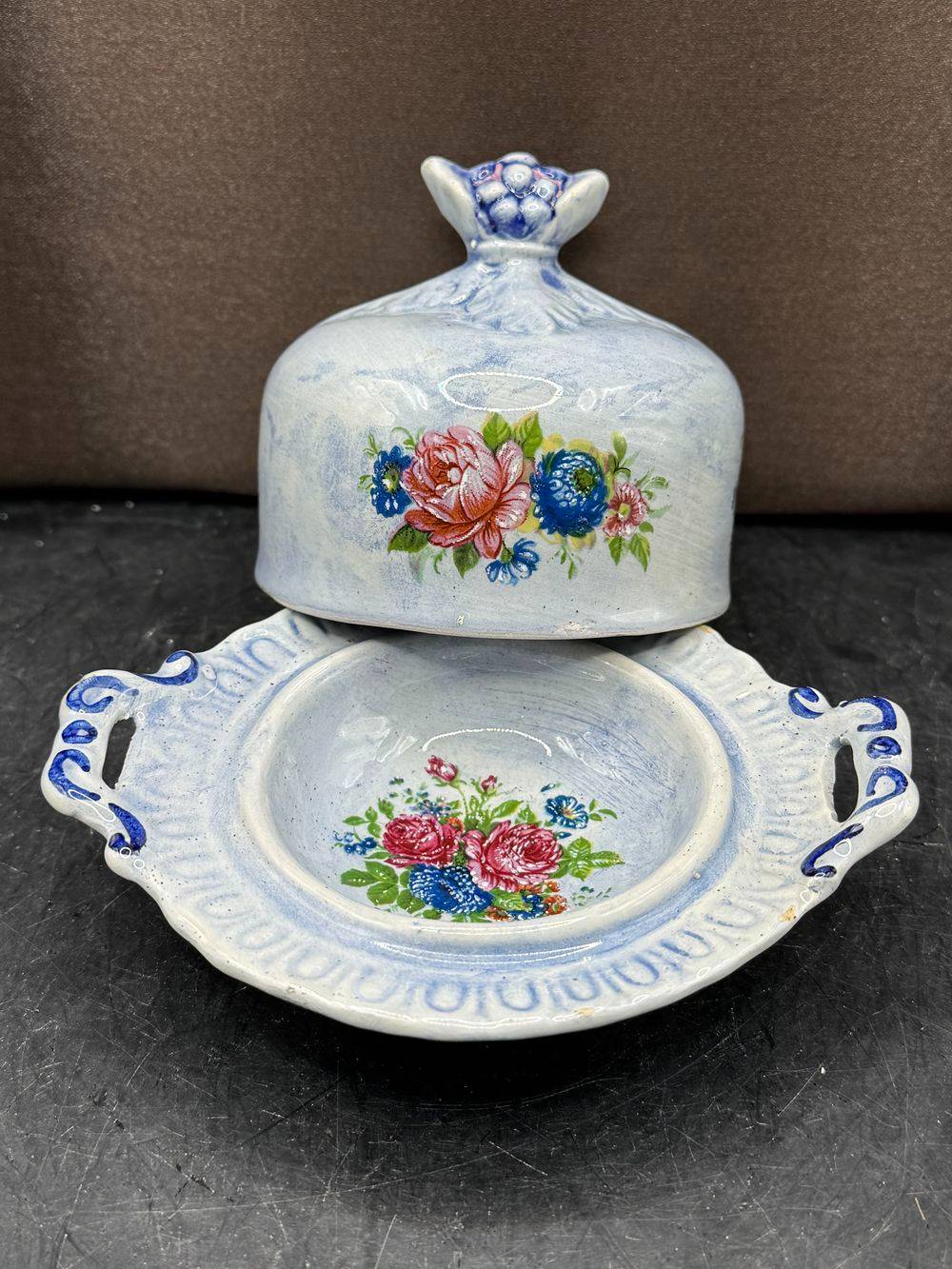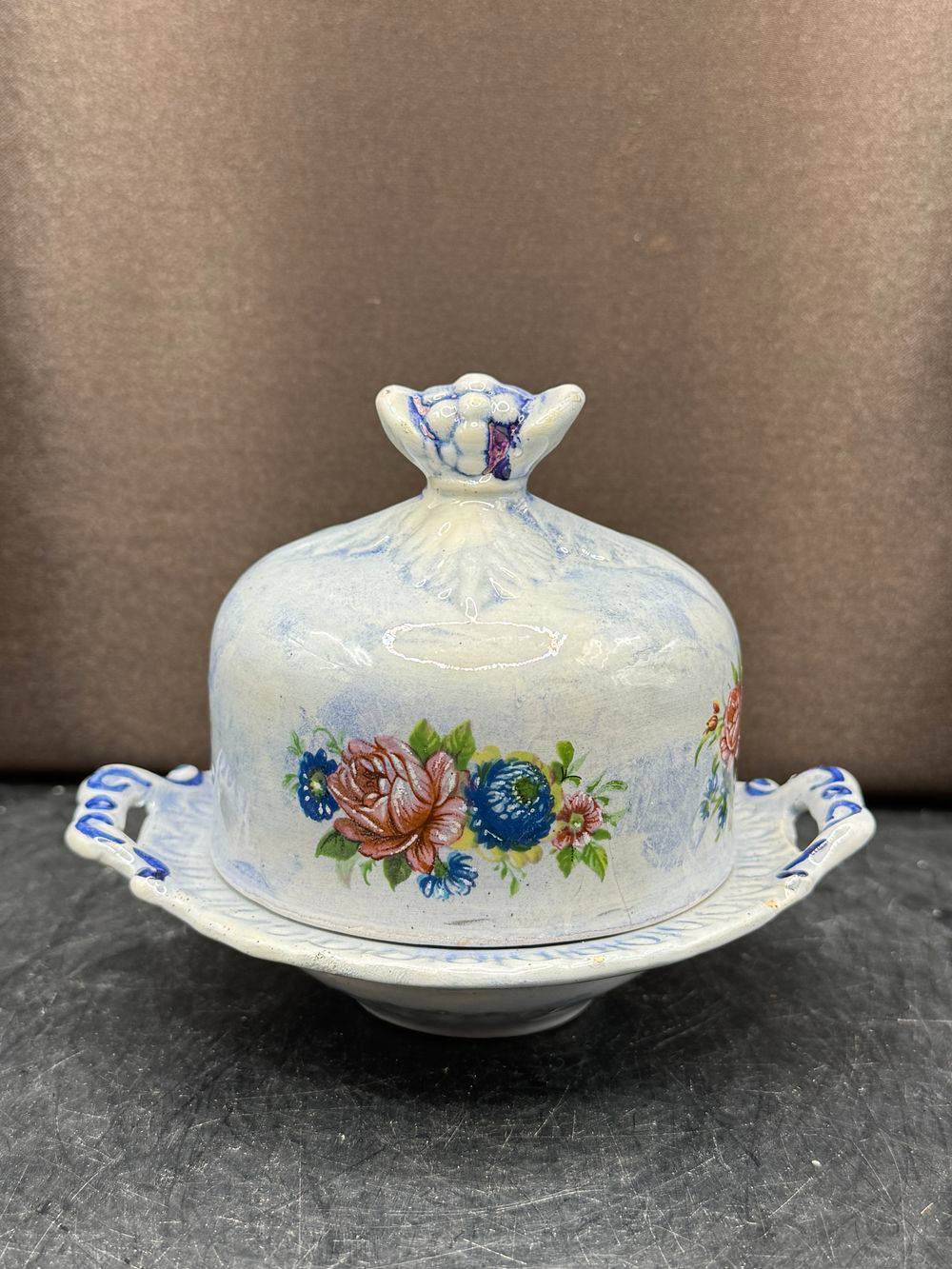 Ancien et rare beurrier et son couvercle – En céramique et décor floral peint à la main