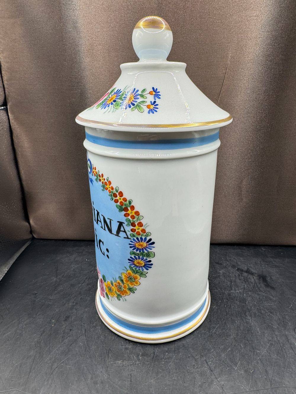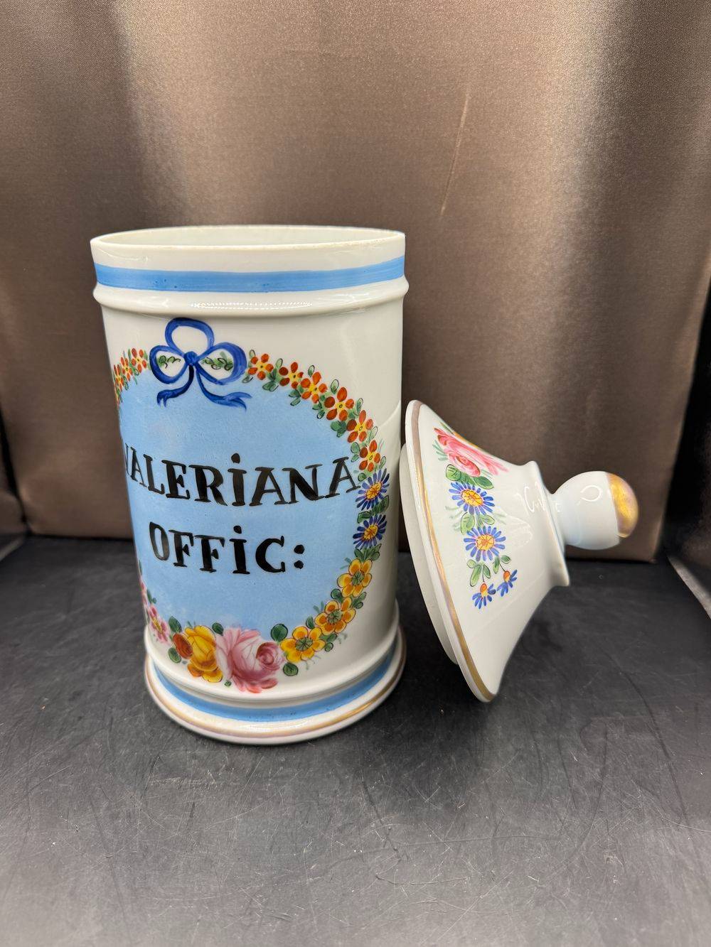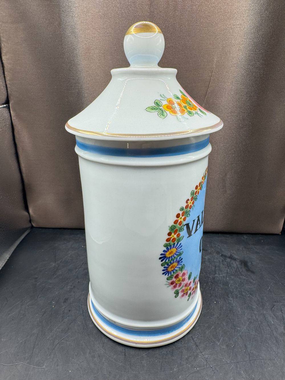 Ancien grand pot à Pharmacie – pot d’Apothicaire – Valeriana Offic – En Porcelaine de Limoges – Décor Floral