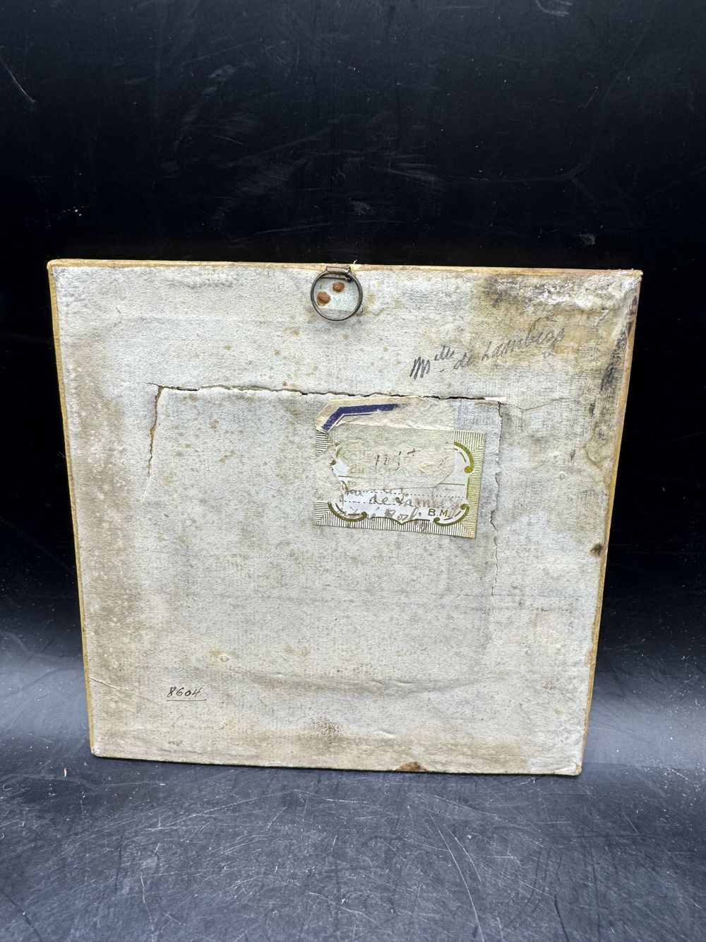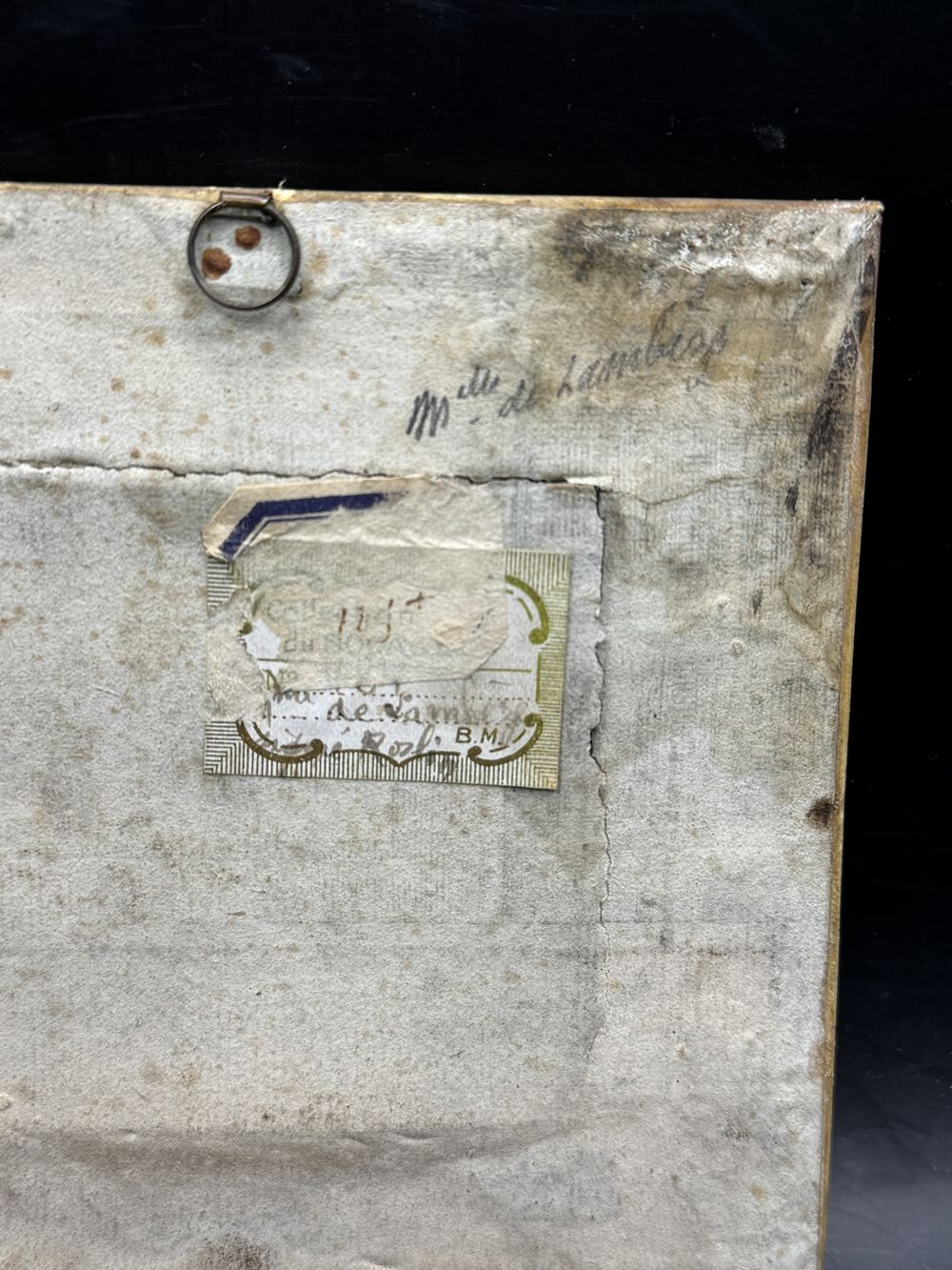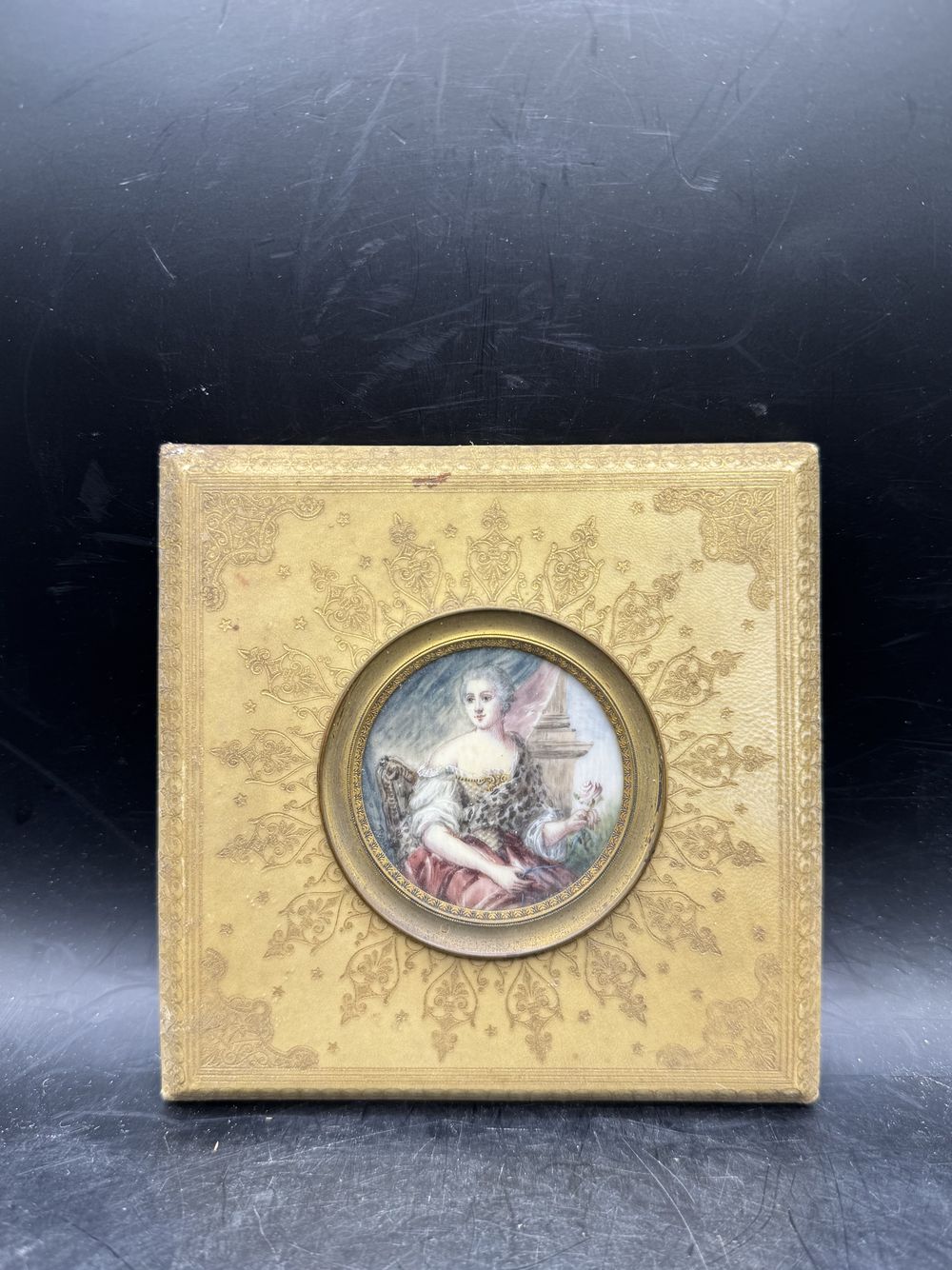 Ancien et rare Portrait – Miniature d’une « Elégante – Mme de Lamblas » en médaillon peint à la main – 19ème – Signé Roslin – Cadre recouvert de toile beige/doré travaillée