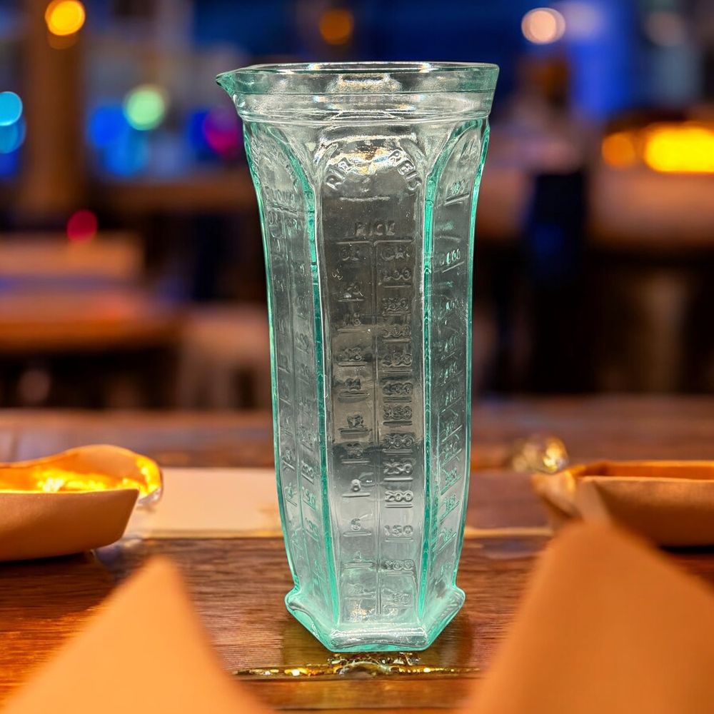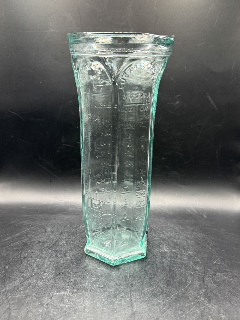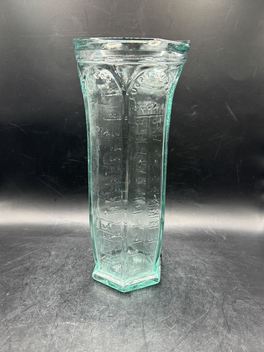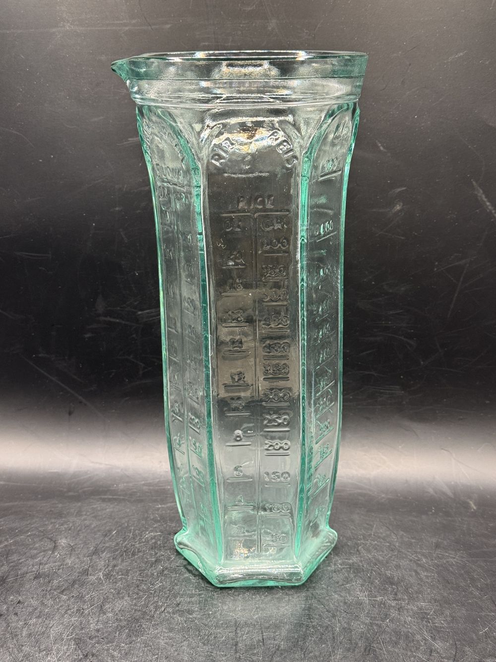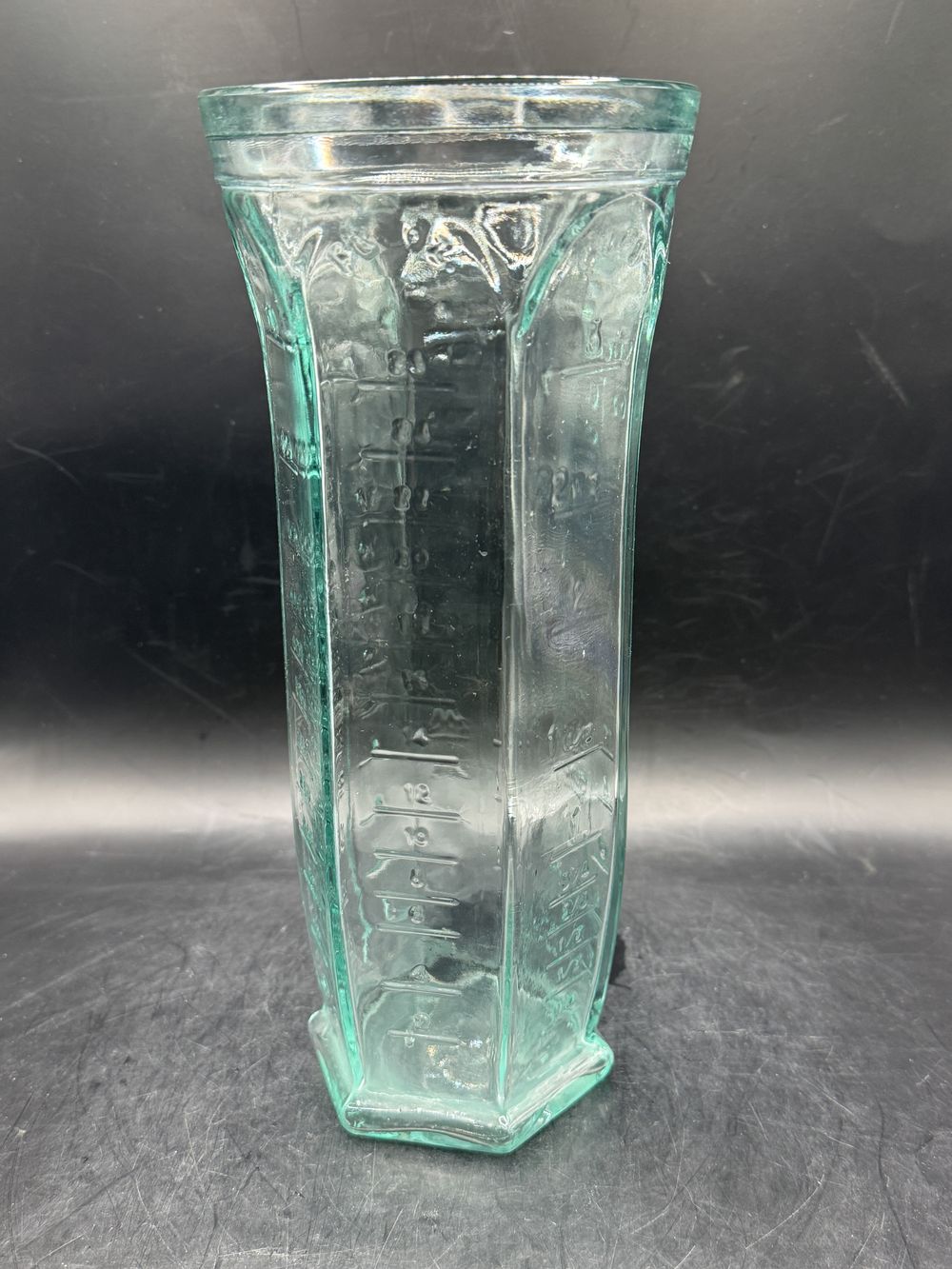 Ancien grand mesureur/doseur (avec bec verseur) en verre moulé (de couleur vert) – A 6 cotés