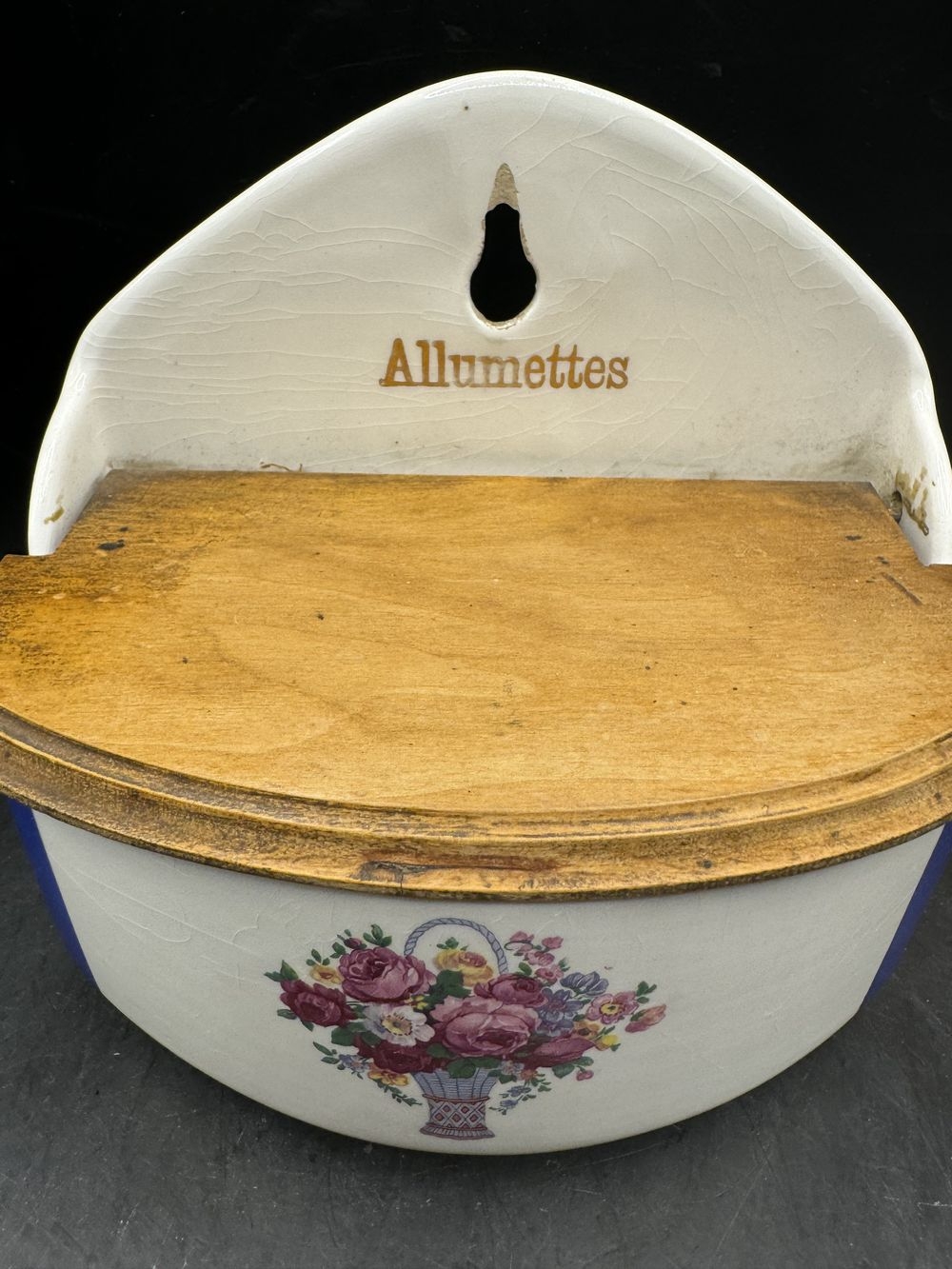 Ancien porte allumette mural en faïence et bois – décor floral (roses)