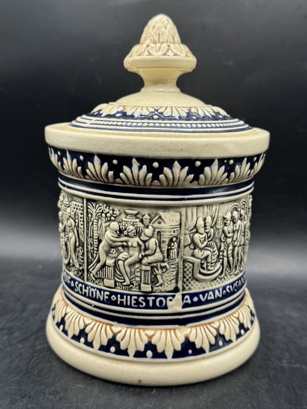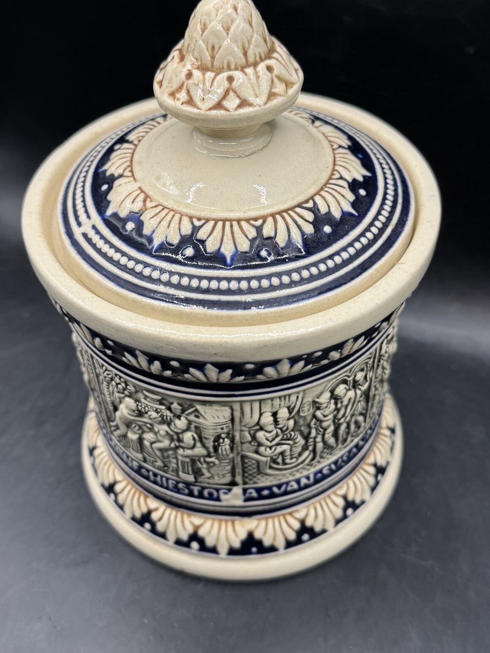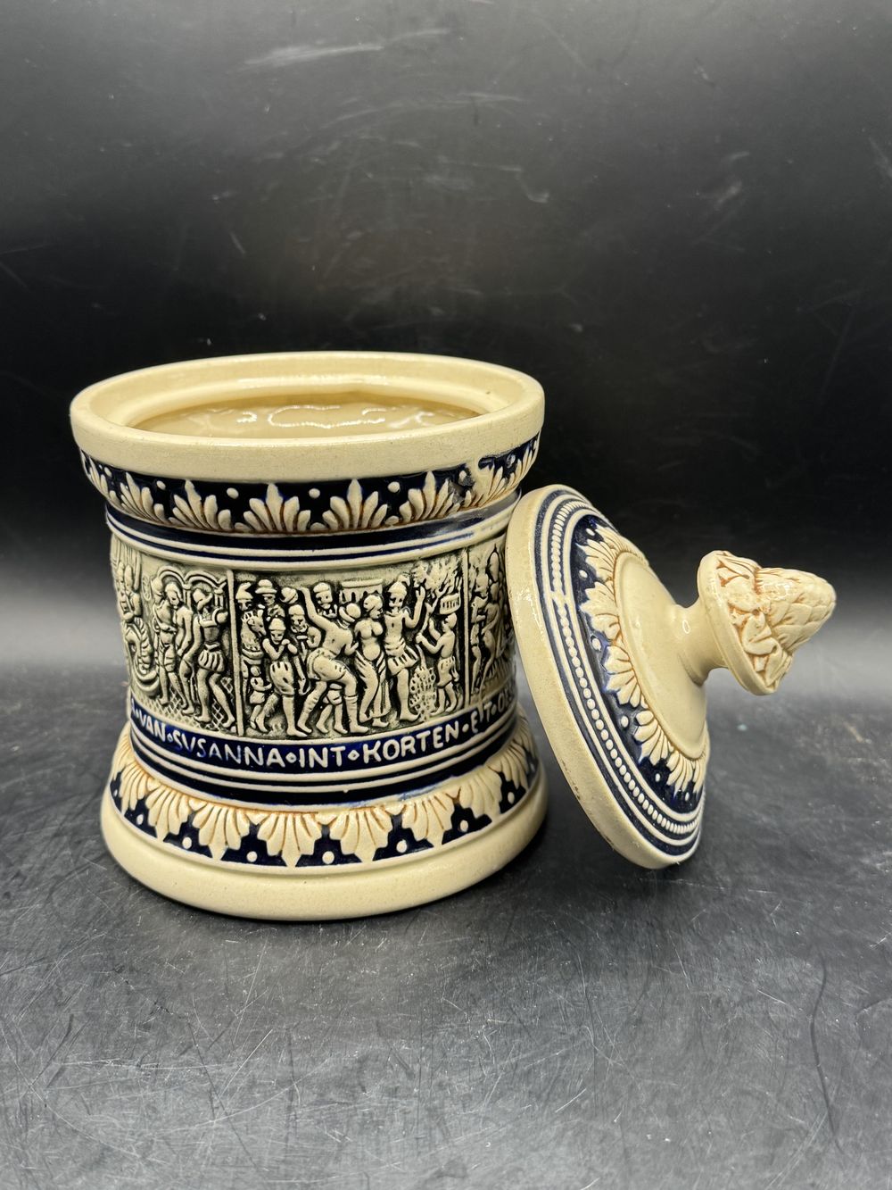 Ancien Pot à tabac en grès de la manufacture Allemande Marzi et Rémy – Signé en creux – Bleu et beige à décors de scènes bibliques – Collection – Décoration