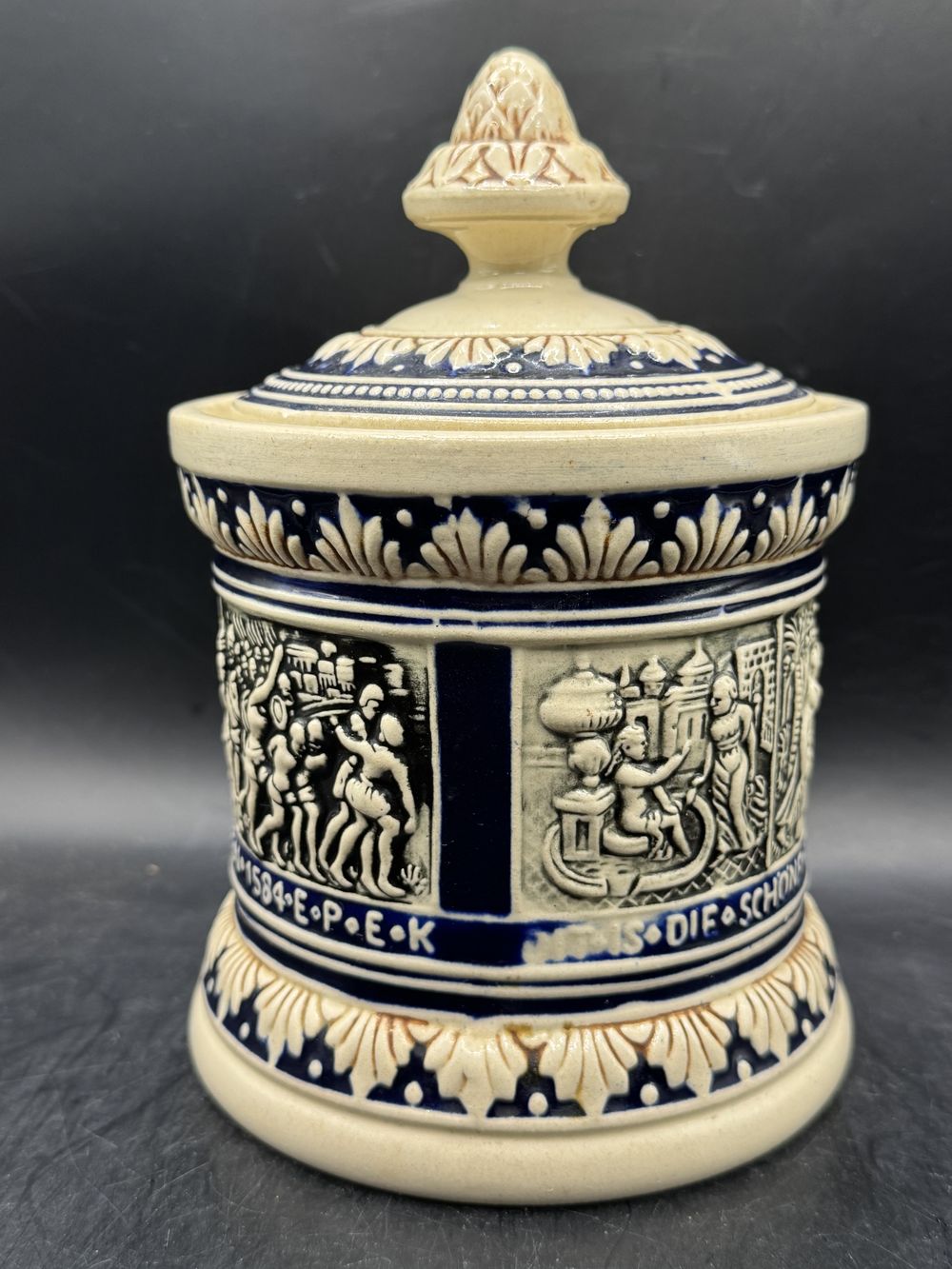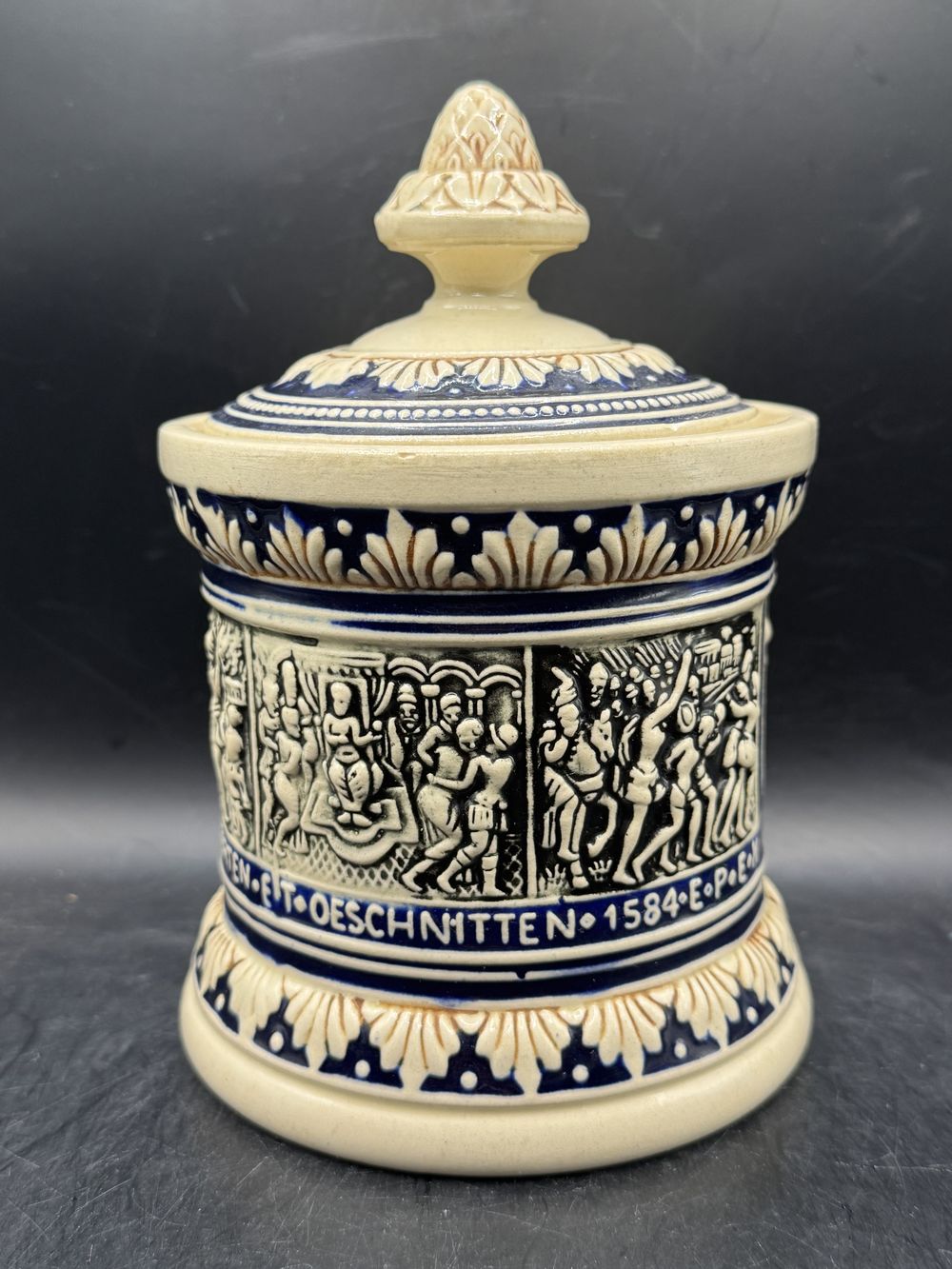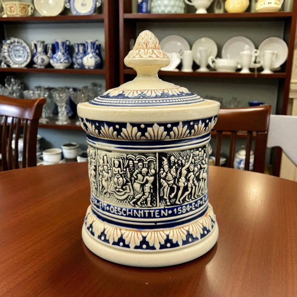 Ancien Pot à tabac en grès de la manufacture Allemande Marzi et Rémy – Signé en creux – Bleu et beige à décors de scènes bibliques – Collection – Décoration