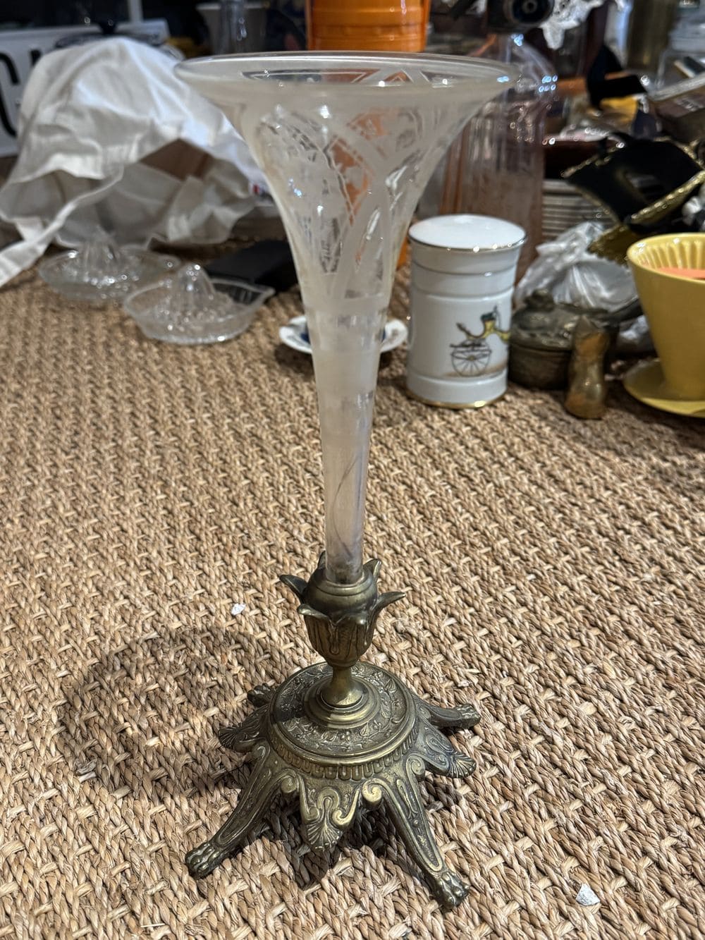 Ancien Vase cornet et verre en cristal gravé sur piètement en métal doré (bronze vu le poids) datant du 19ème
