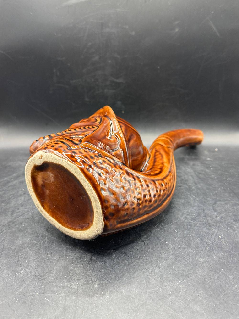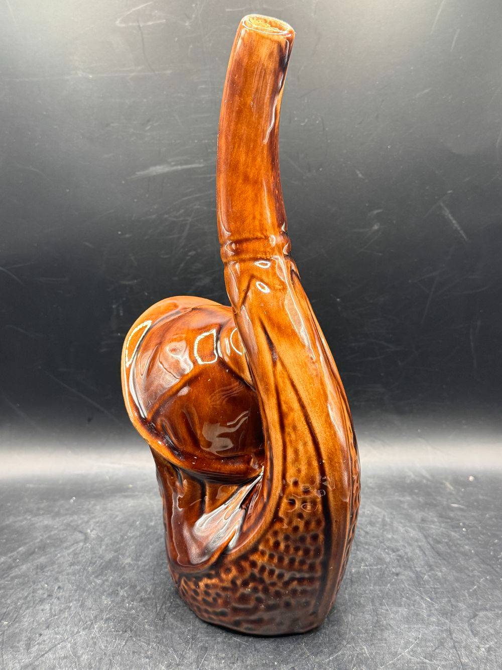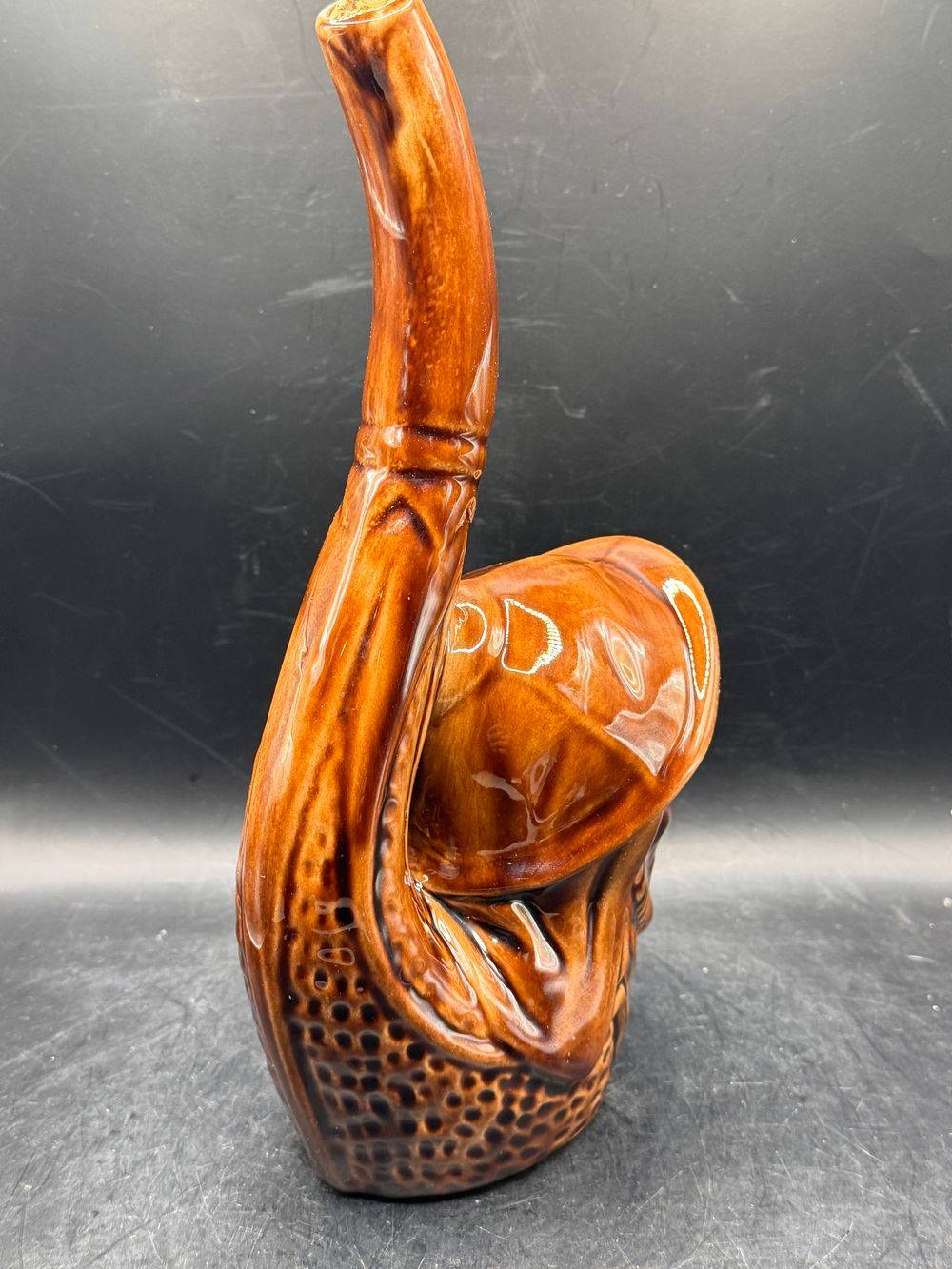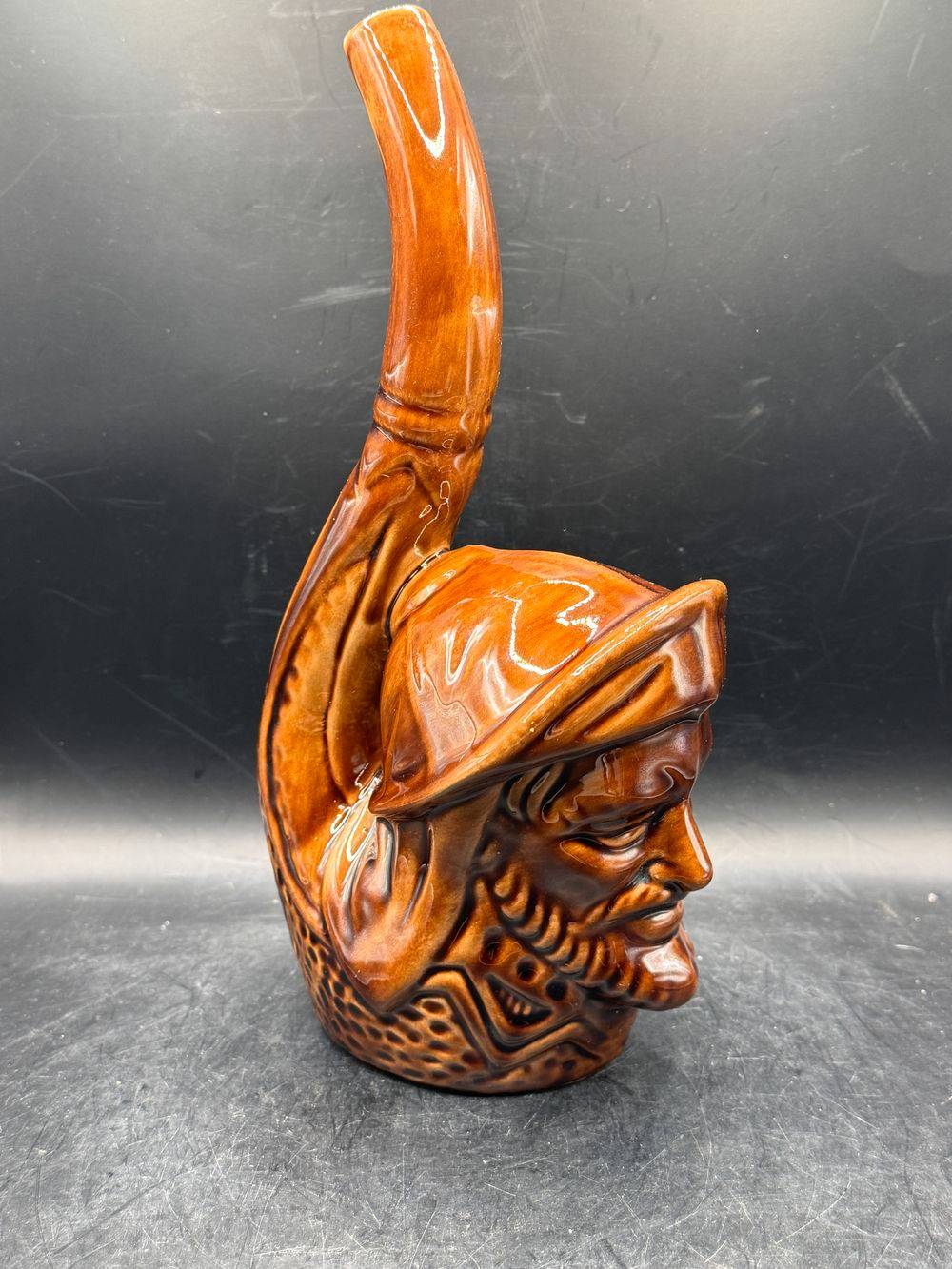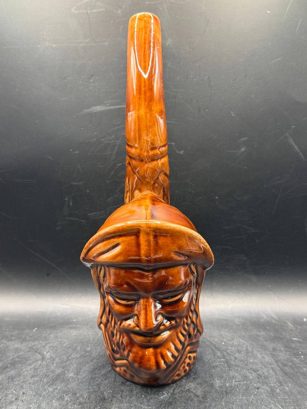 Ancienne bouteille à liqueur en forme de visage – En céramique marron vernissée – Circa 1970 – Décoration bar bistrot – Collection – Vintage