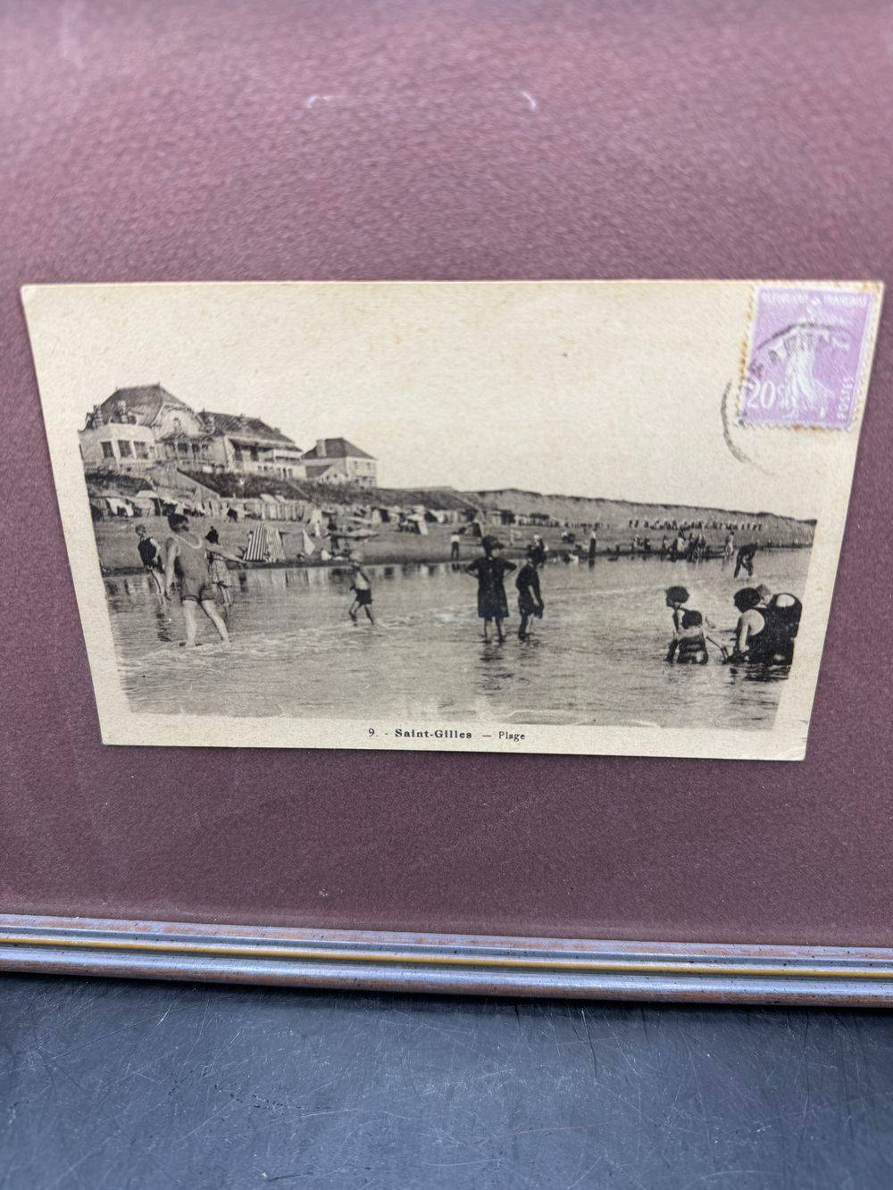 Ancienne carte postale oblitérée et encadrée représentant la grande plage de Saint-Gilles-Croix-de-Vie (Vendée 85) au début du 20ème siècle