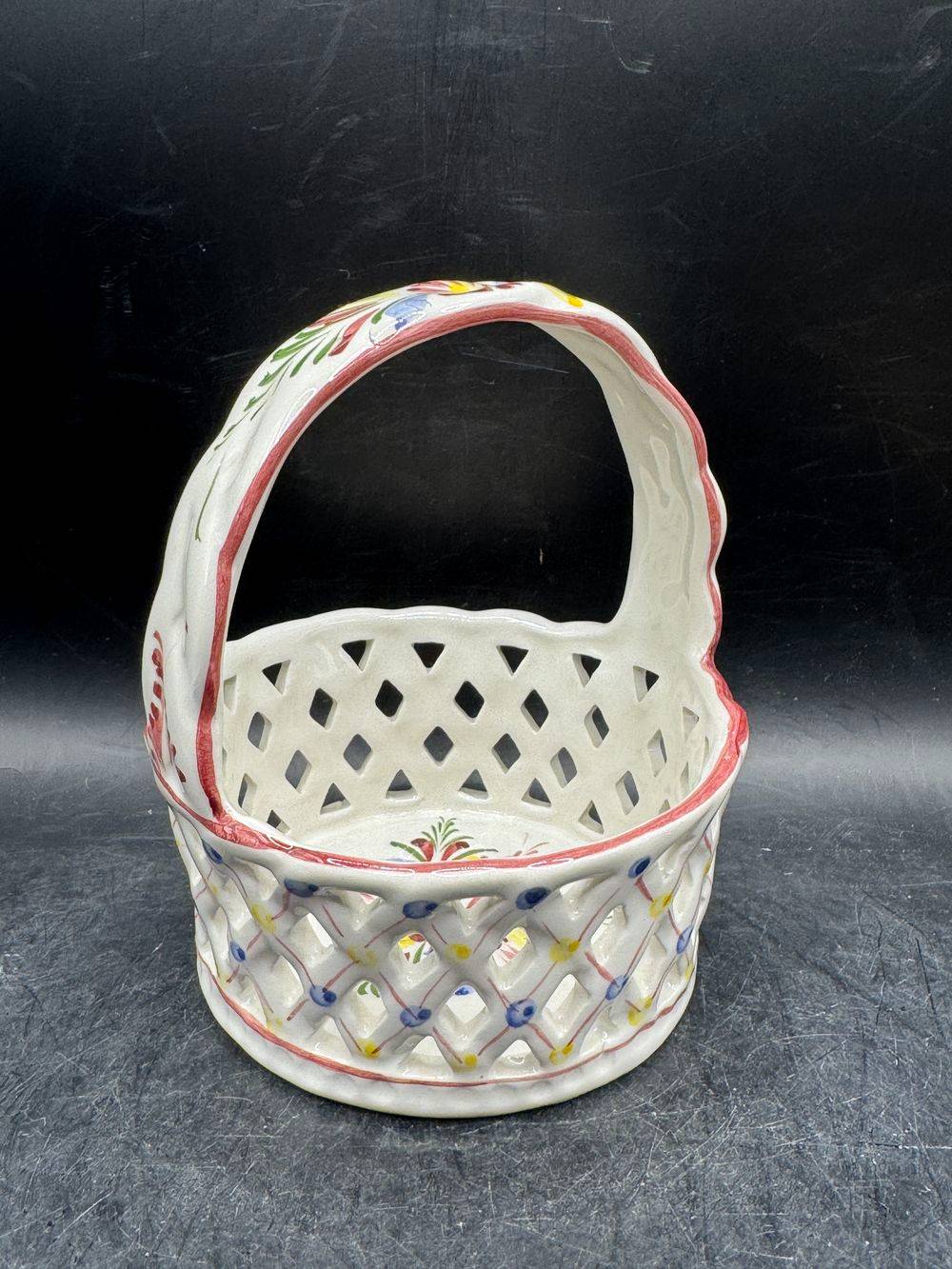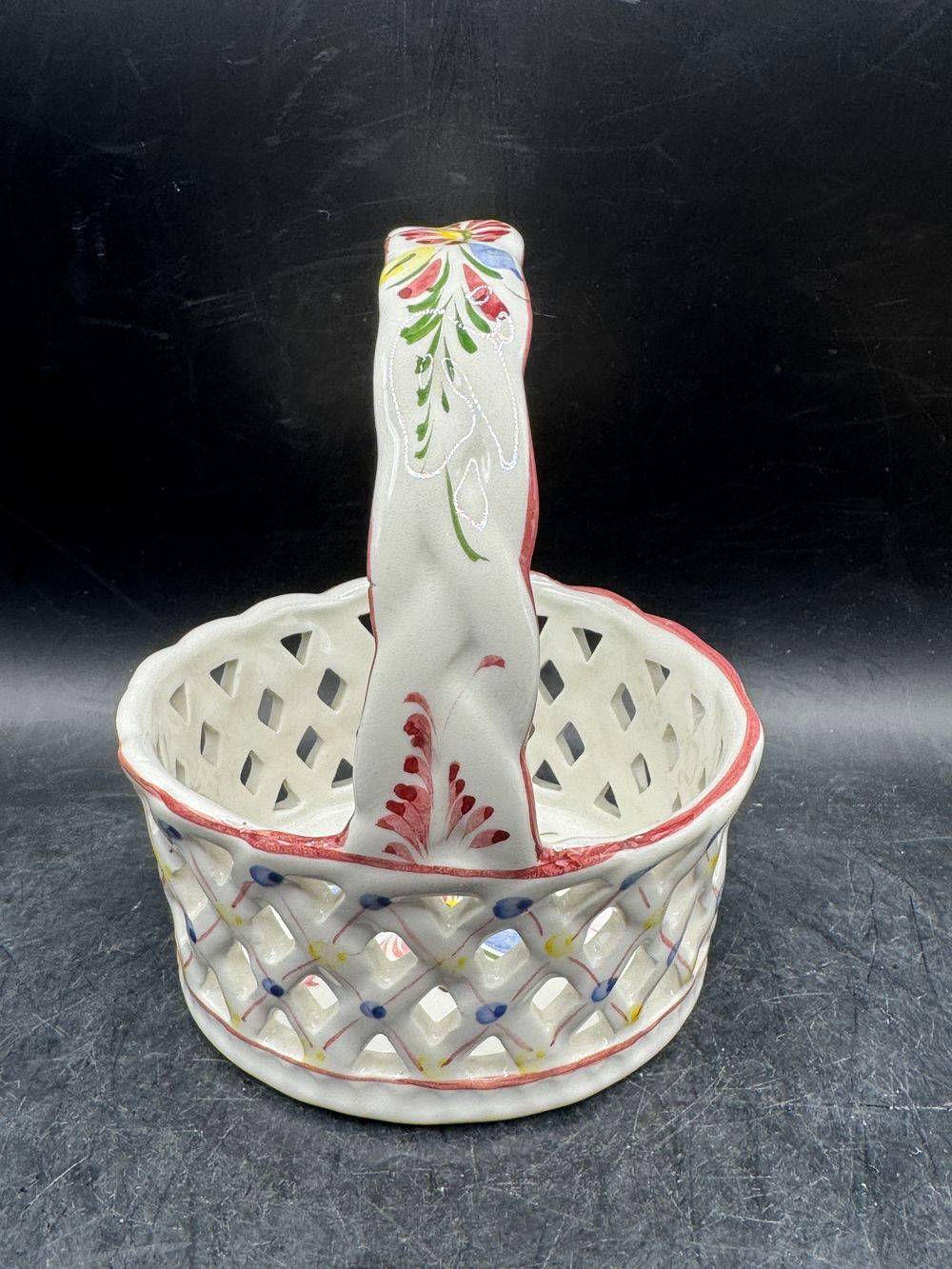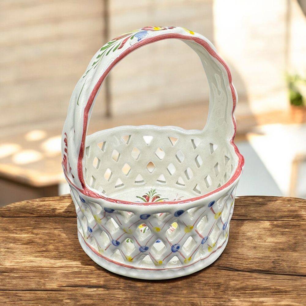Ancienne corbeille/panier rond en faïence ajourée et décorée à la main – Signé-