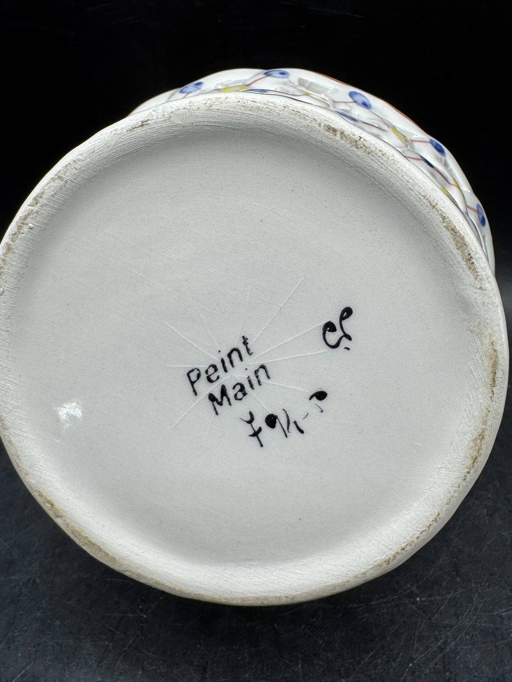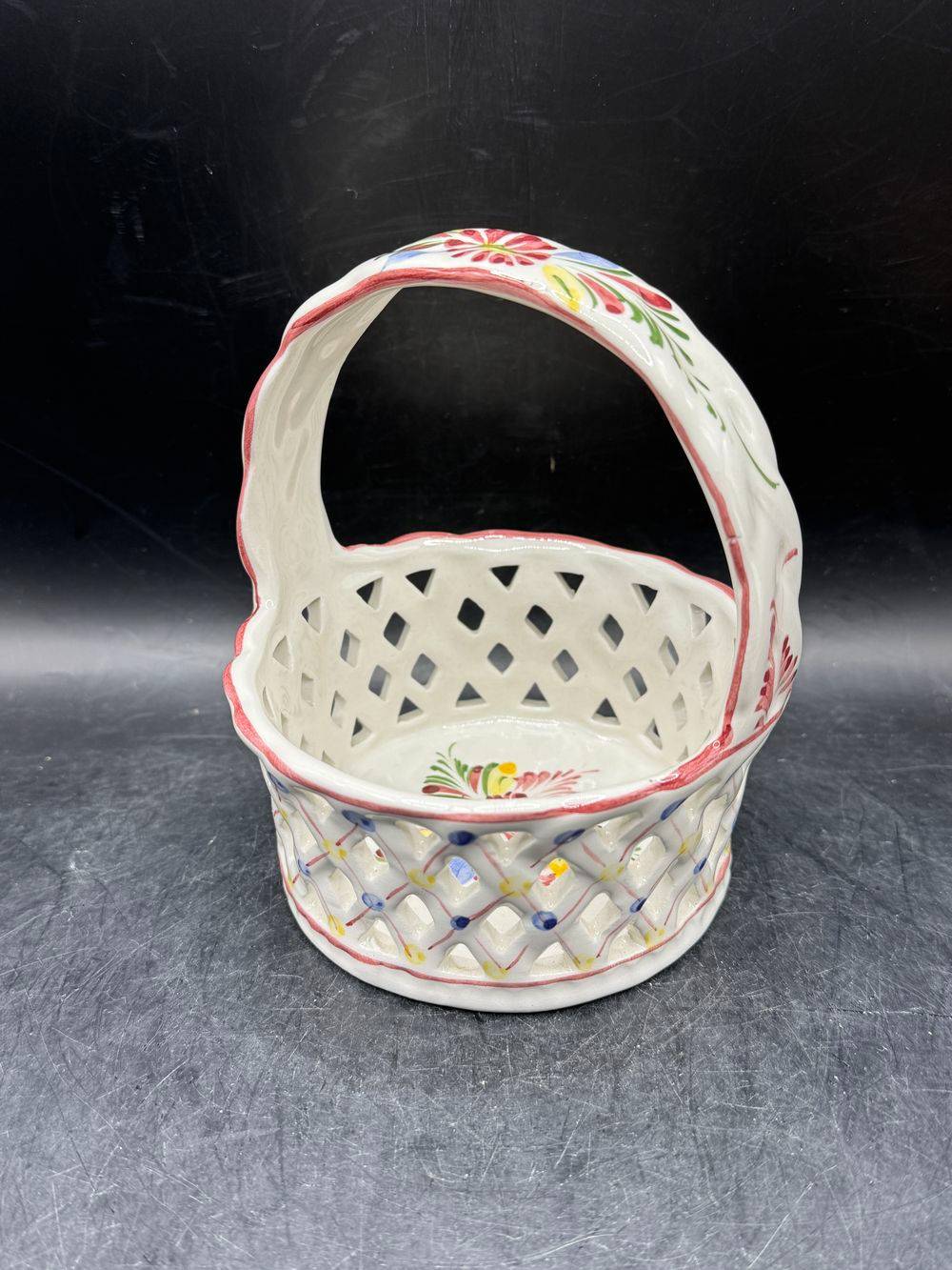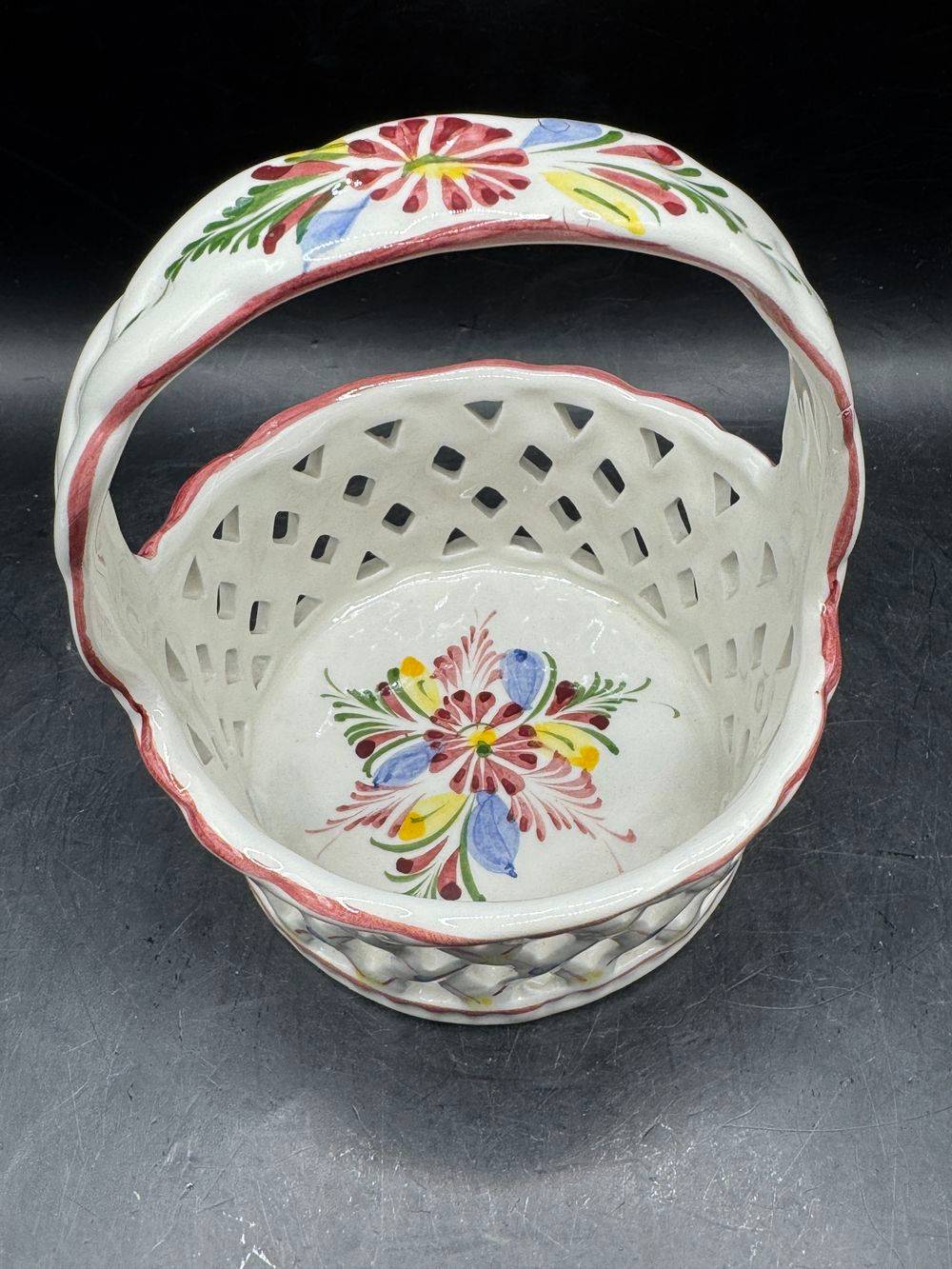 Ancienne corbeille/panier rond en faïence ajourée et décorée à la main – Signé-