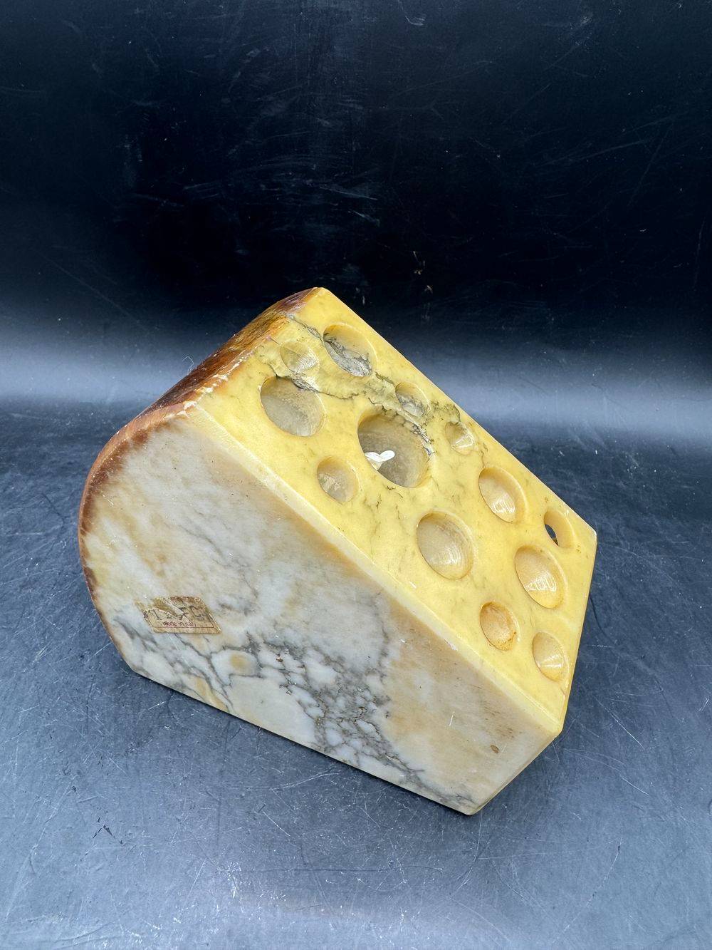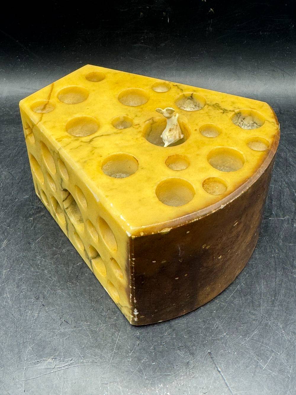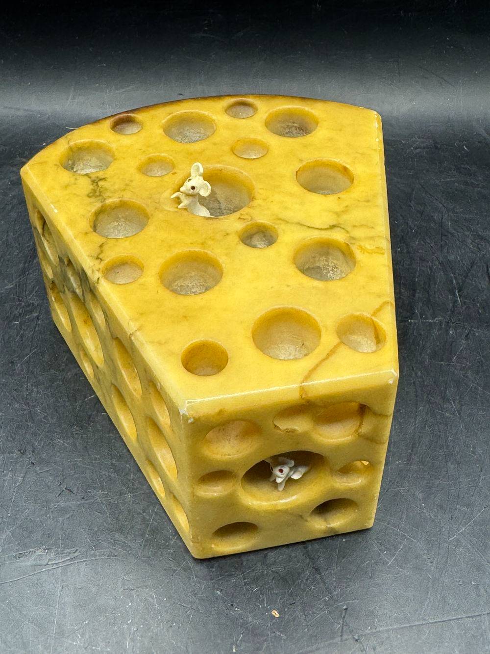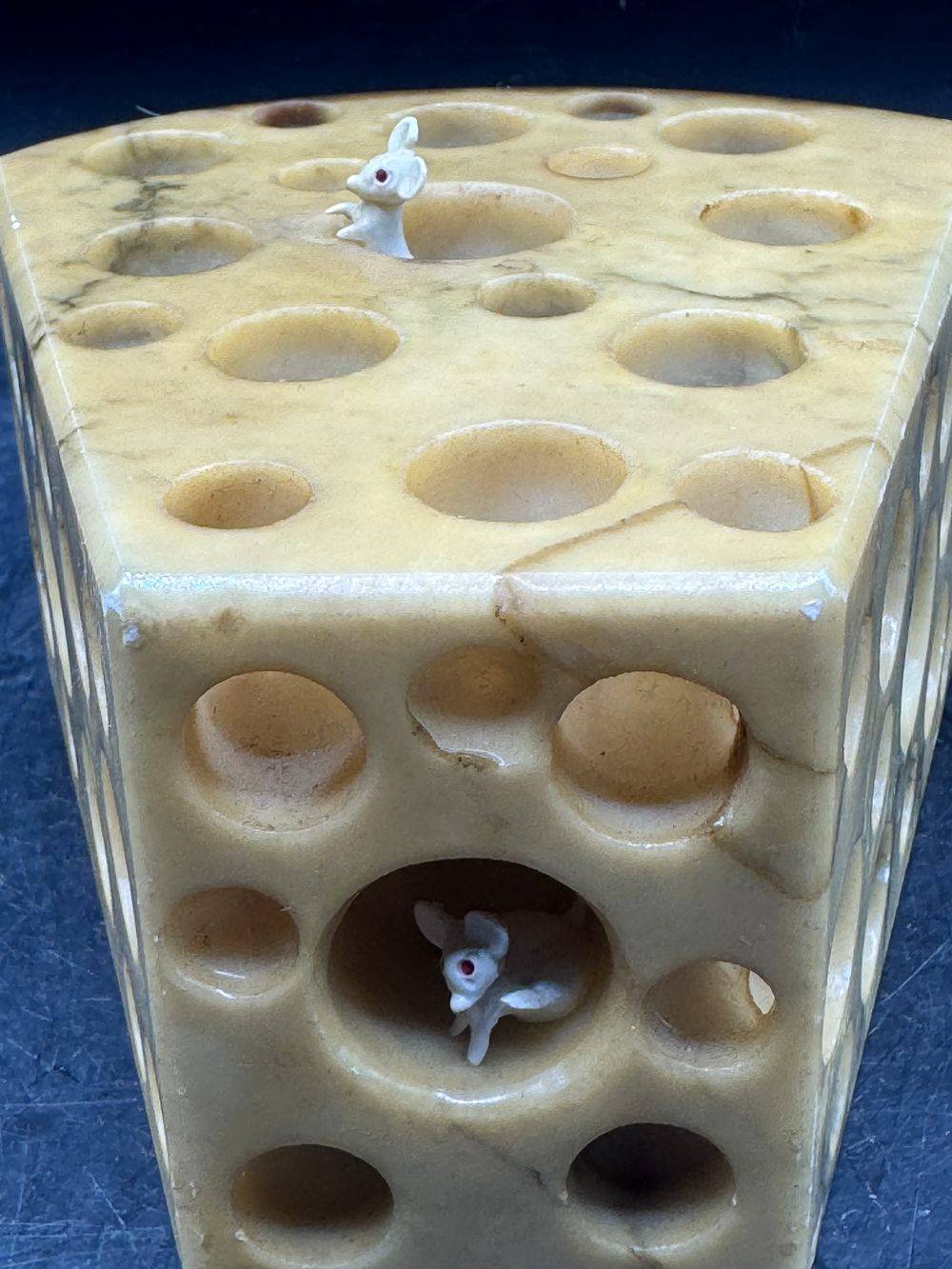 Ancienne et incroyable pièce en Albâtre représentant un morceau de fromage (Gruyère) orné de plusieurs souris – Datant des années 50 – Italian Alabaster Stone Cheese “ Wedge” — Italie – Collection – Décoration – Vintage