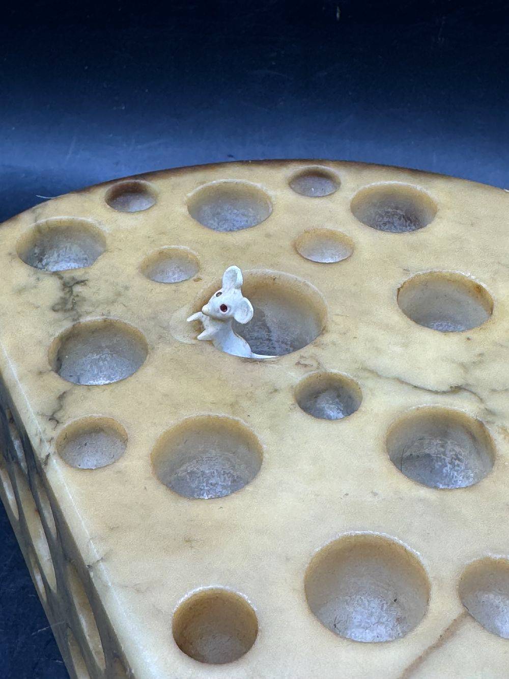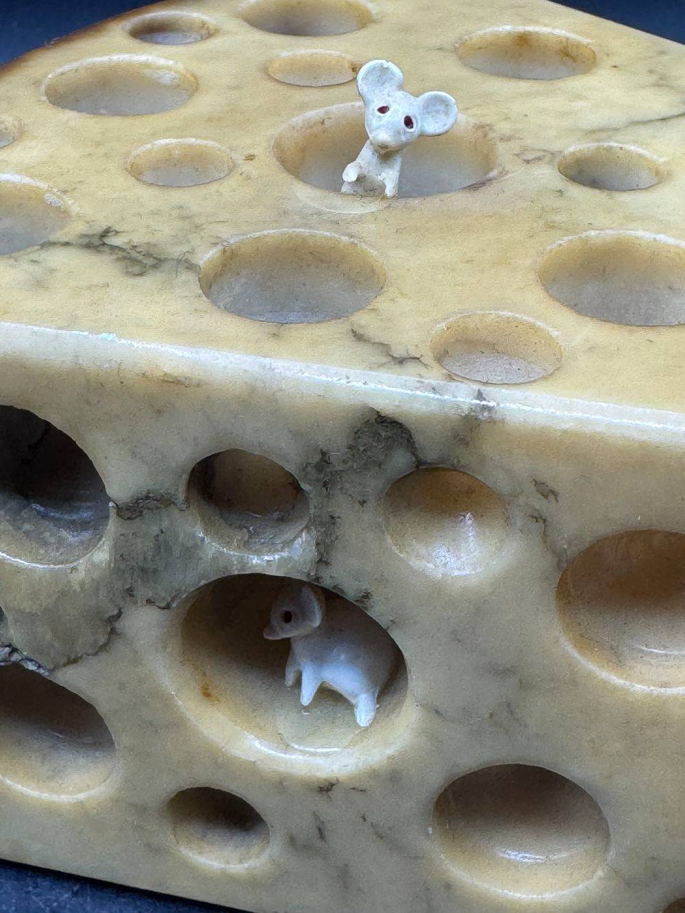 Ancienne et incroyable pièce en Albâtre représentant un morceau de fromage (Gruyère) orné de plusieurs souris