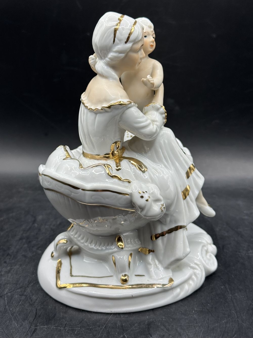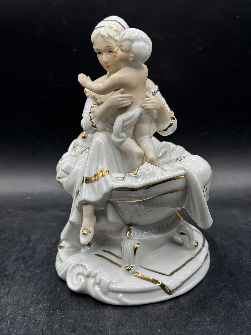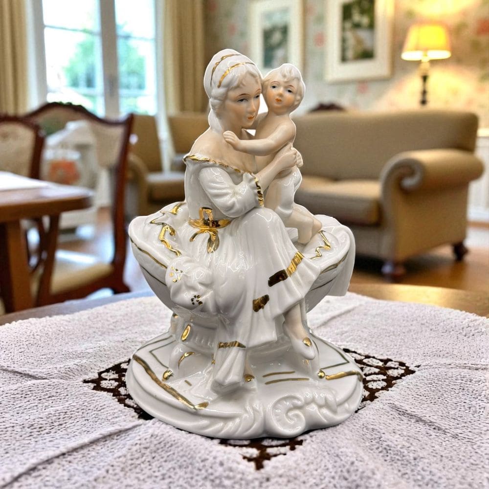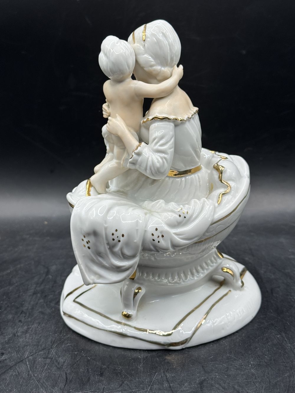 Ancienne et jolie sculpture en biscuit de porcelaine peinte et dorée à la main représentant une mère avec un enfant – Début du 20ème siècle – Décoration – Collection