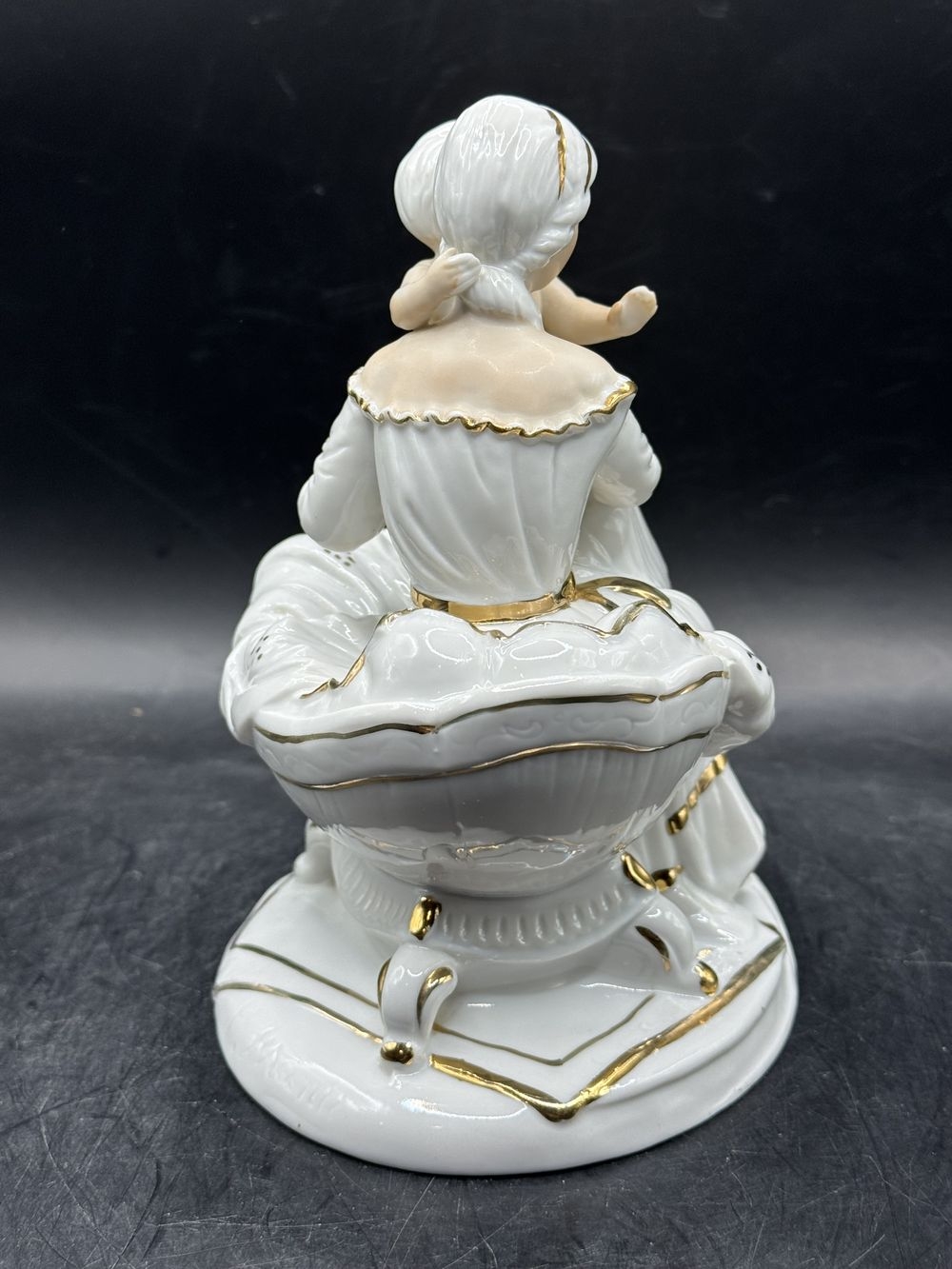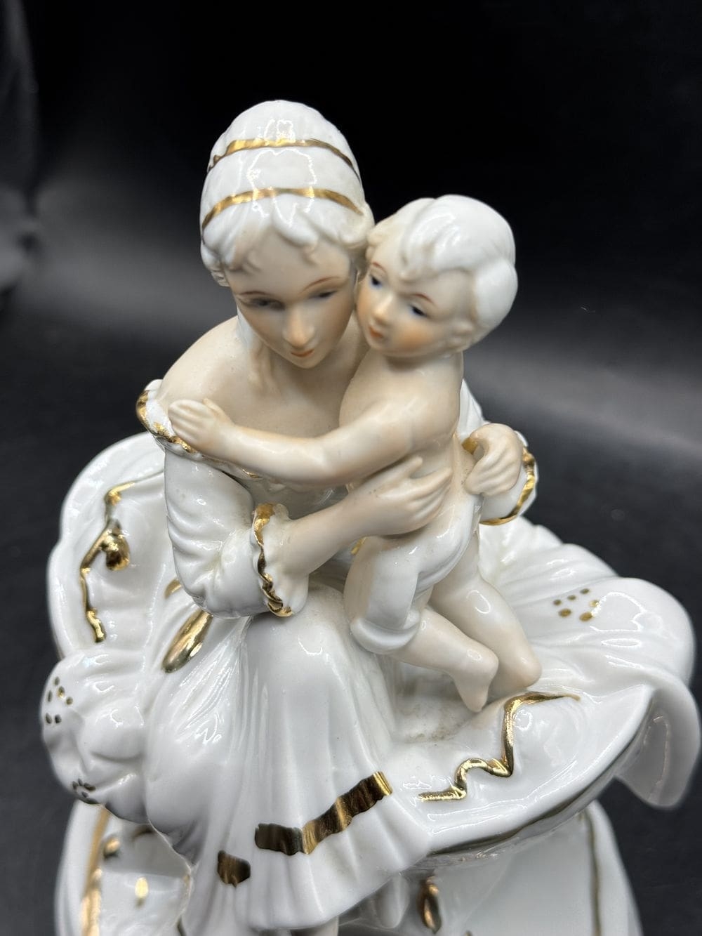 Ancienne et jolie sculpture en biscuit de porcelaine peinte et dorée à la main représentant une mère avec un enfant