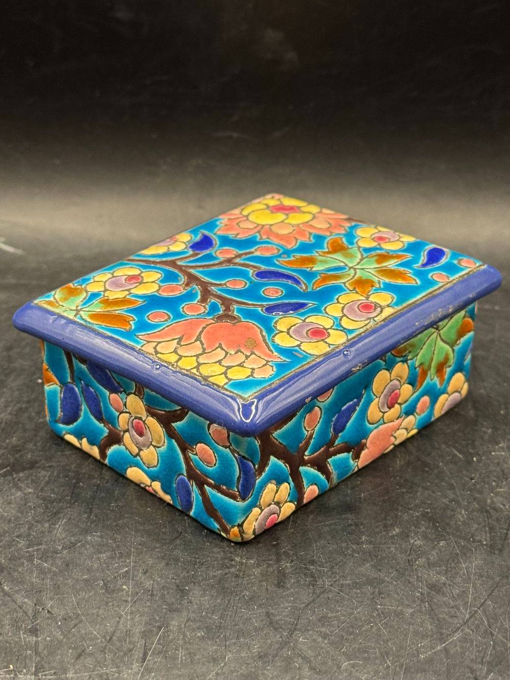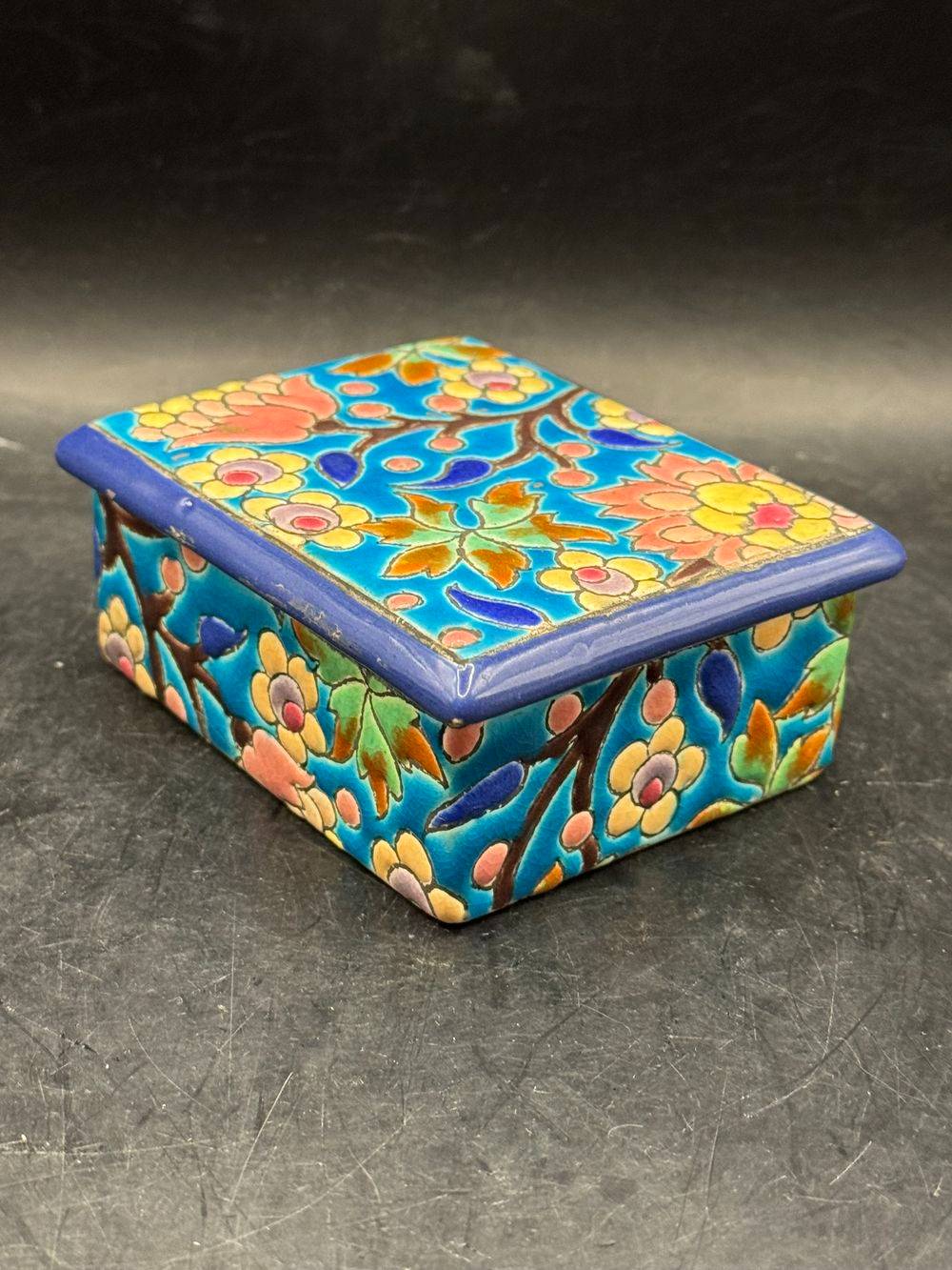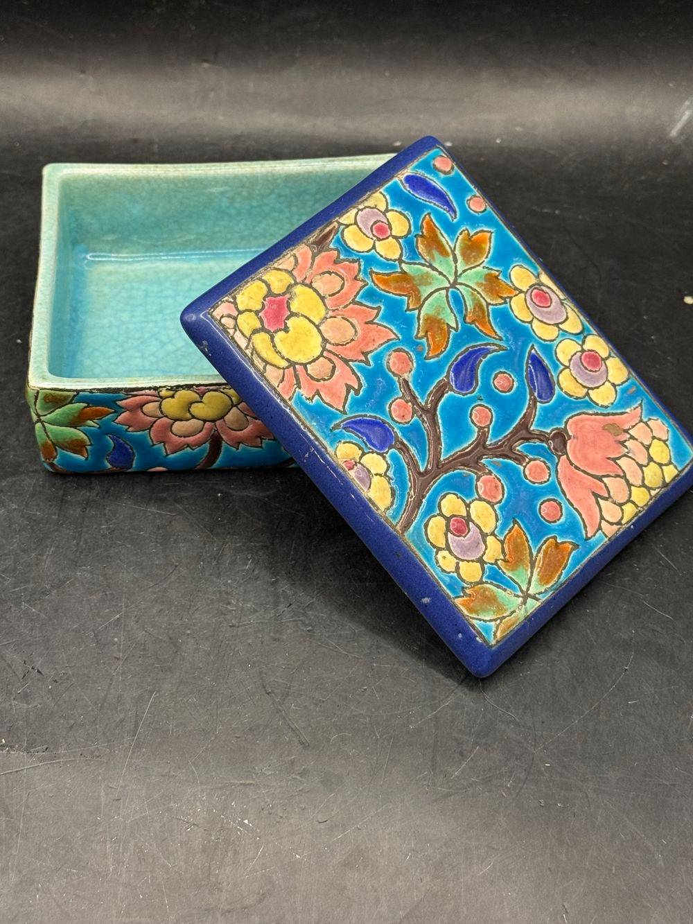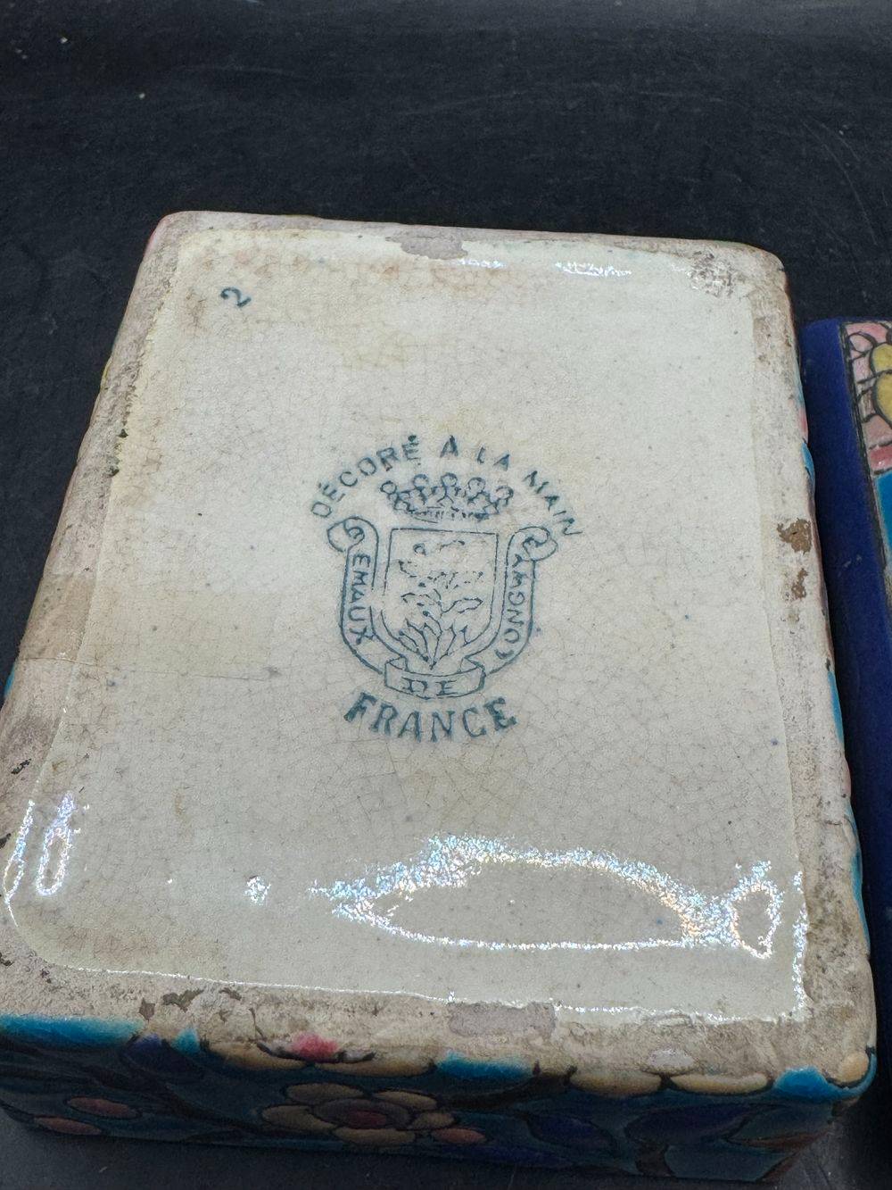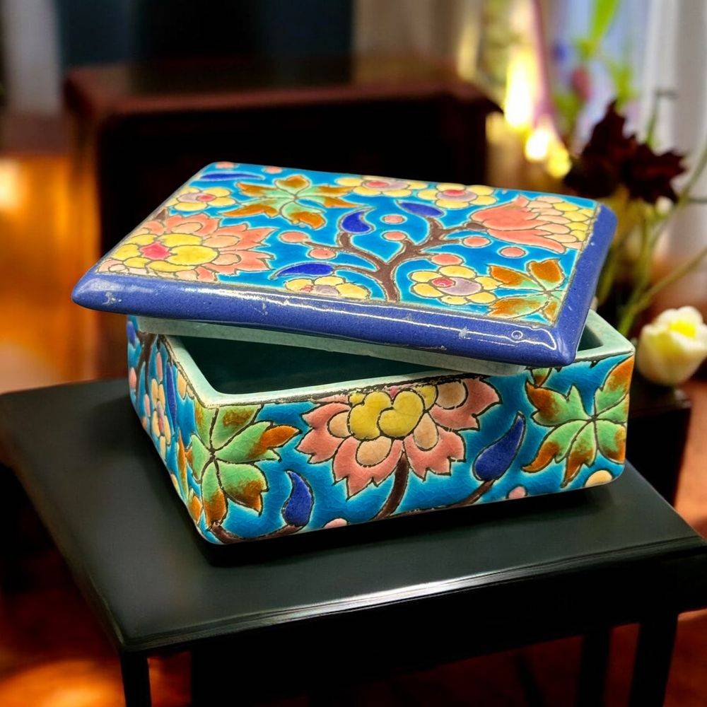 Ancienne et rare bonbonnière/boite à bijoux en faïence et émaux polychromes de Longwy – Estampille des années 1920-1930 – Décoration – Collection