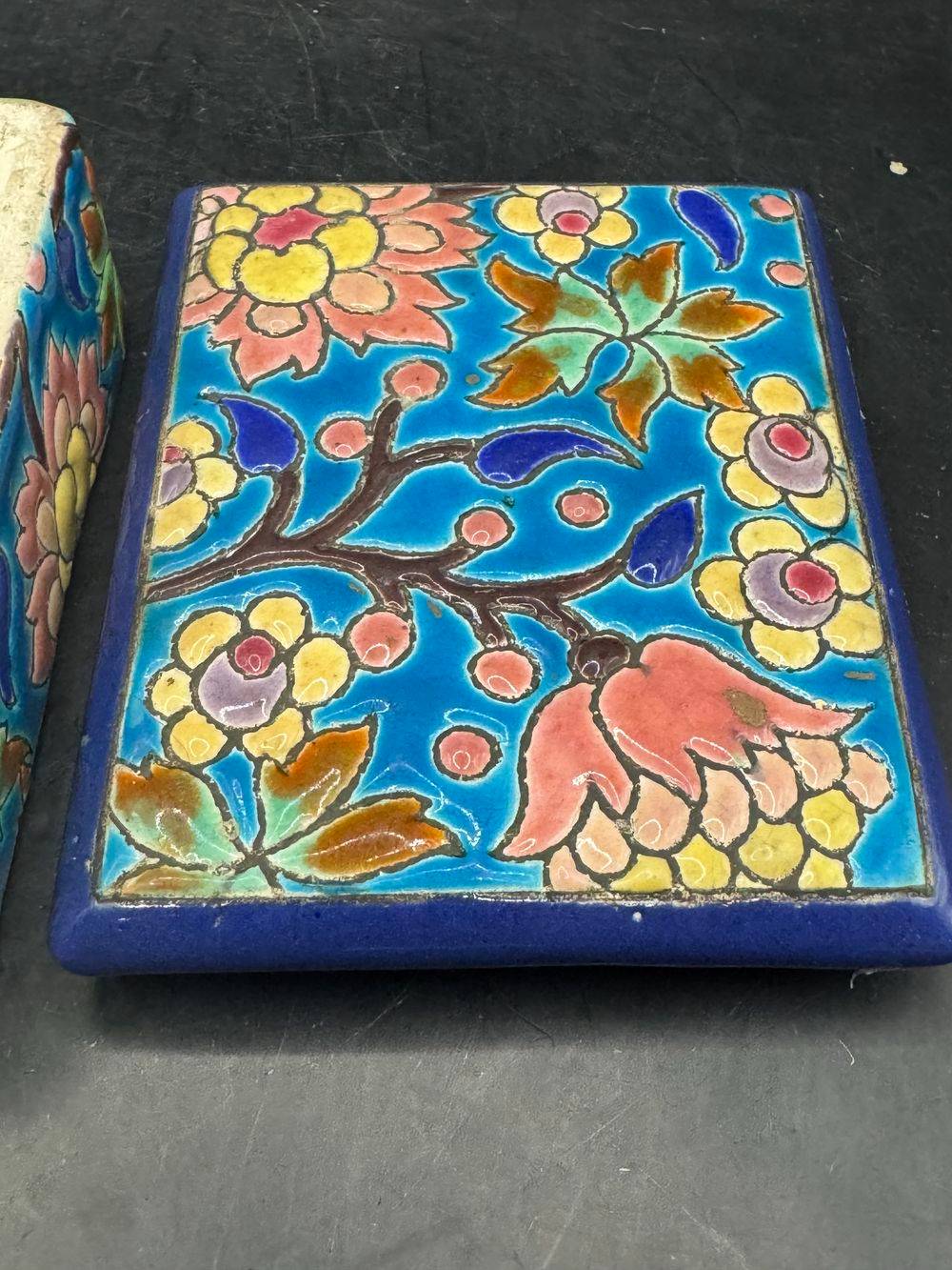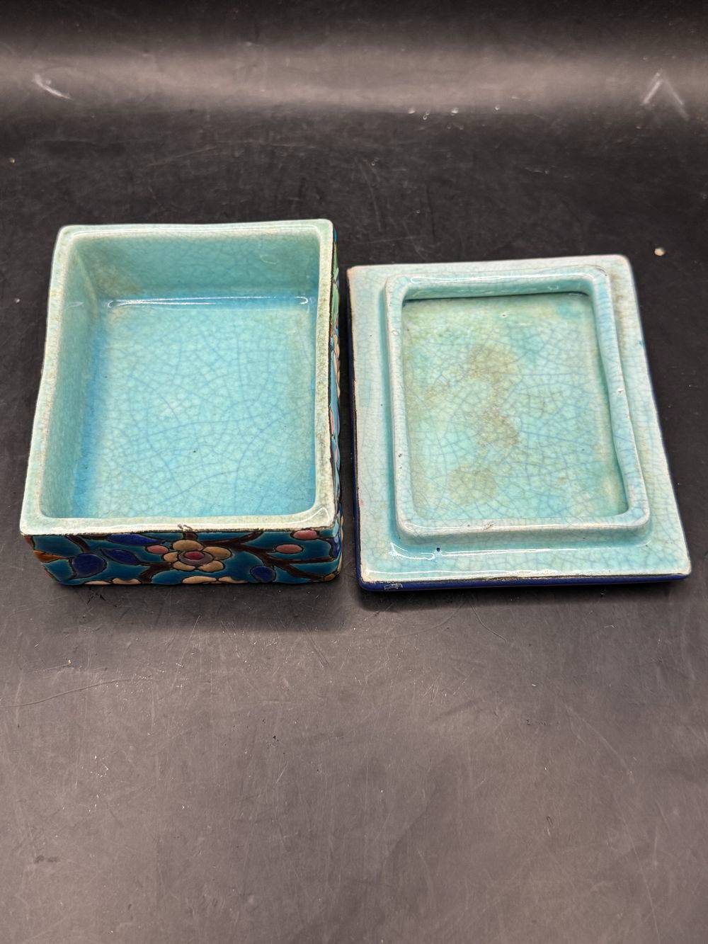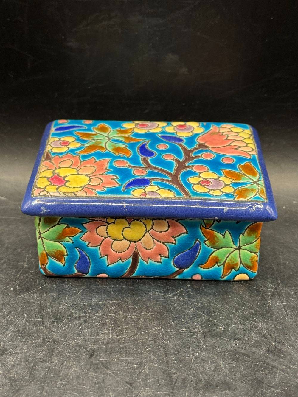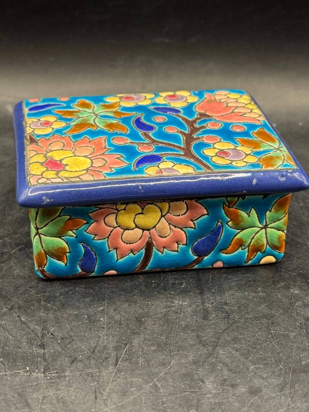 Ancienne et rare bonbonnière/boite à bijoux en faïence et émaux polychromes de Longwy – Estampille des années 1920-1930 – Décoration – Collection