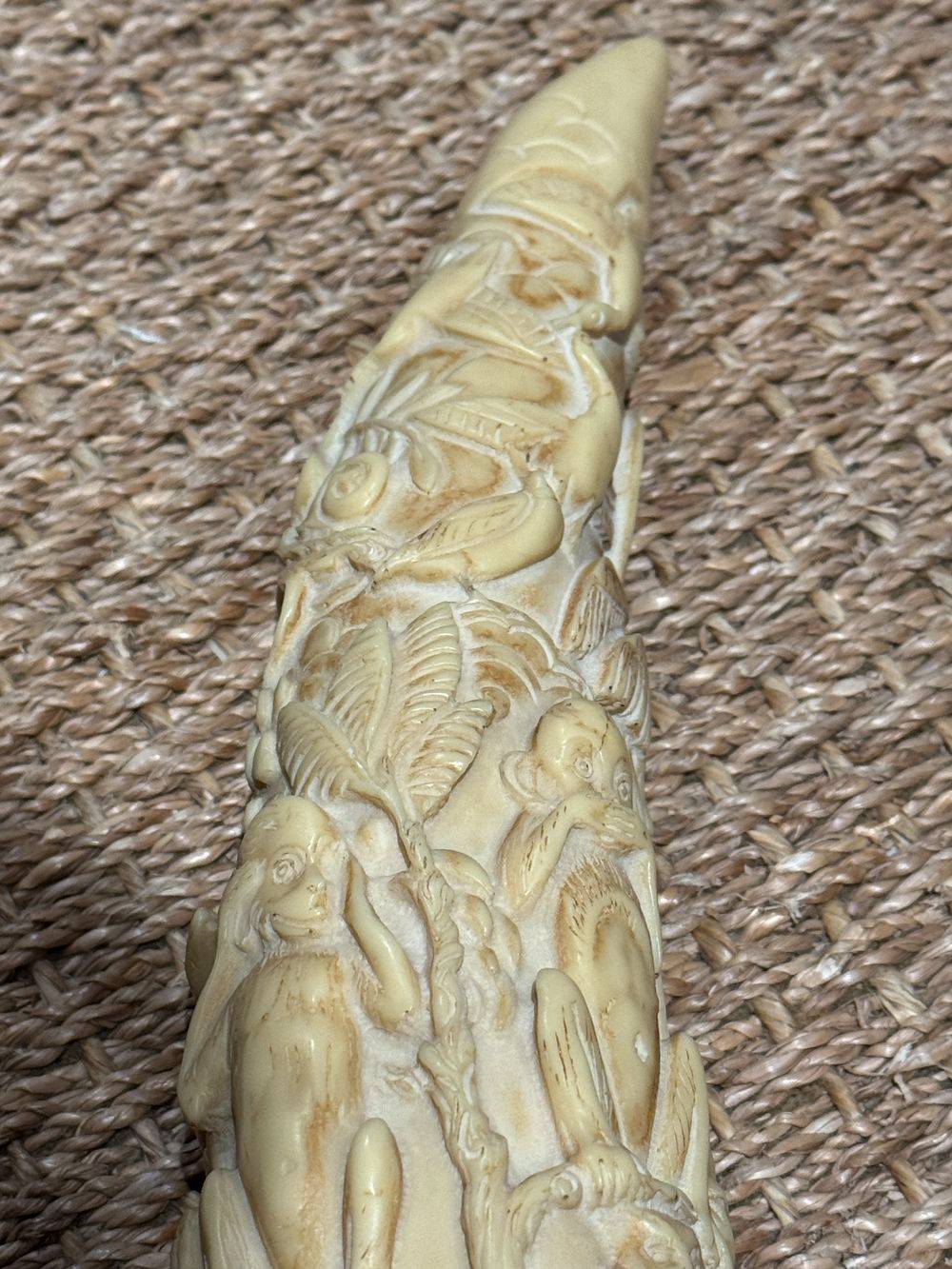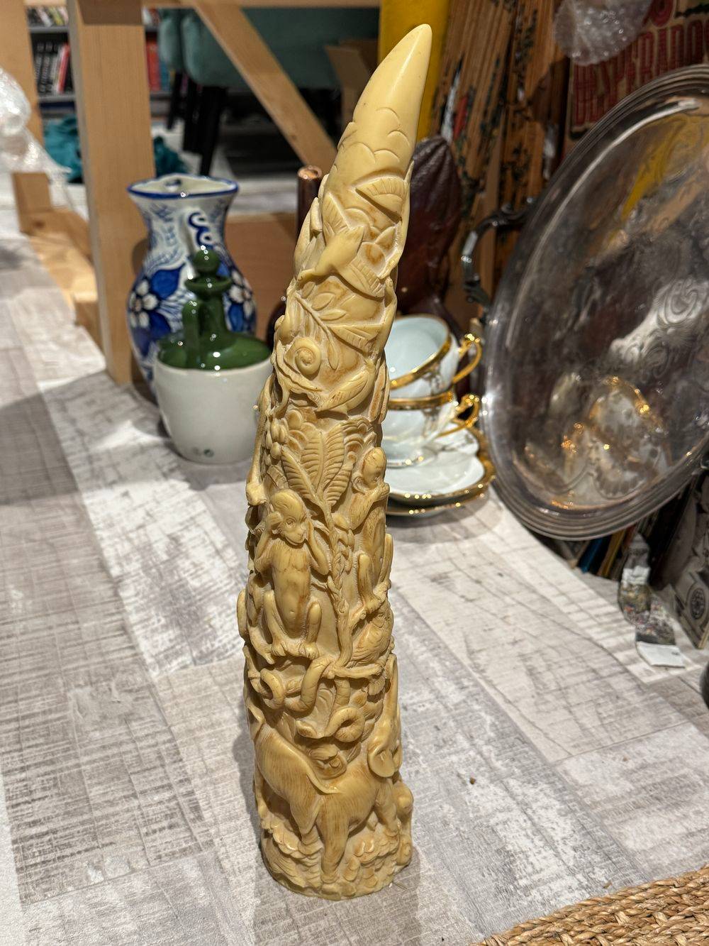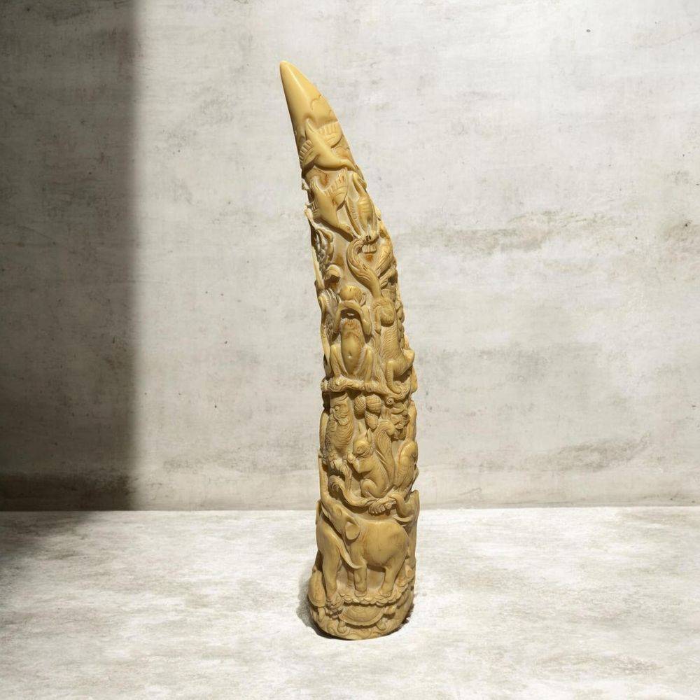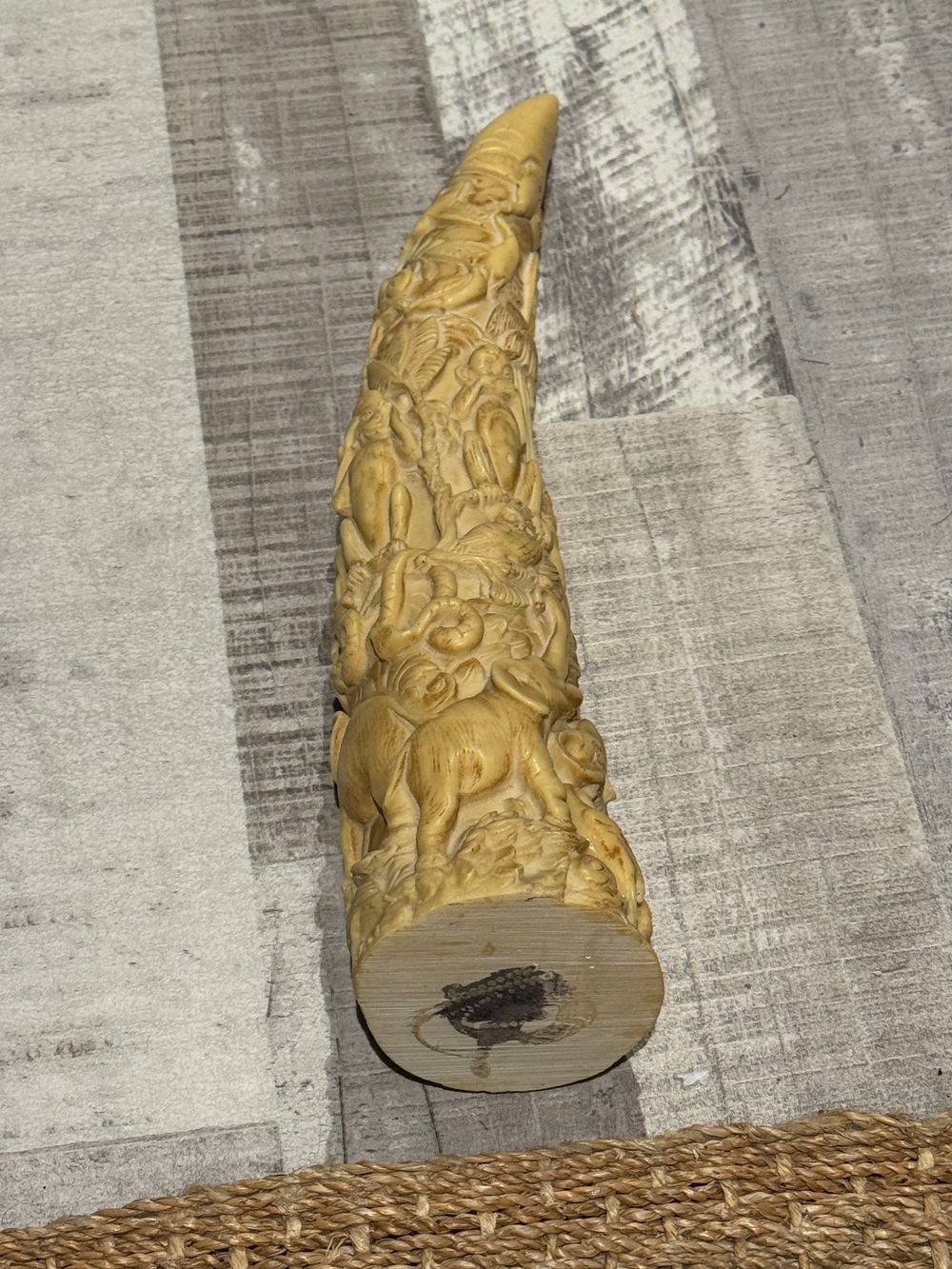 Ancienne Grande Corne / » Défense d’Eléphant ou rhino » en résine sculptée de nombreux animaux – Des années 1960 – Décoration – Collection – Vintage
