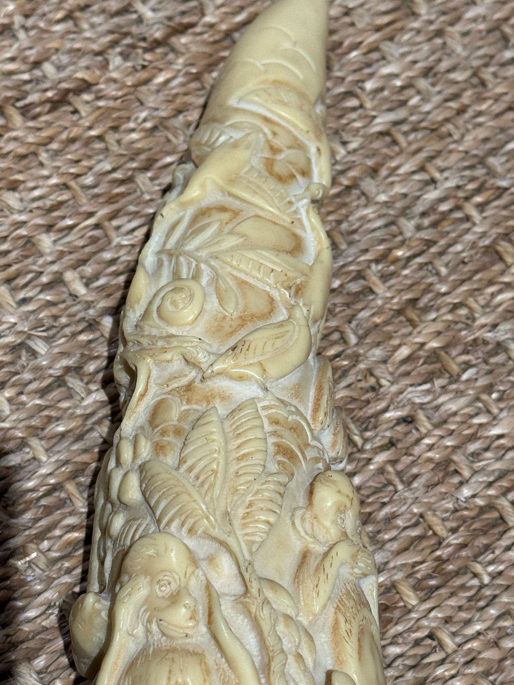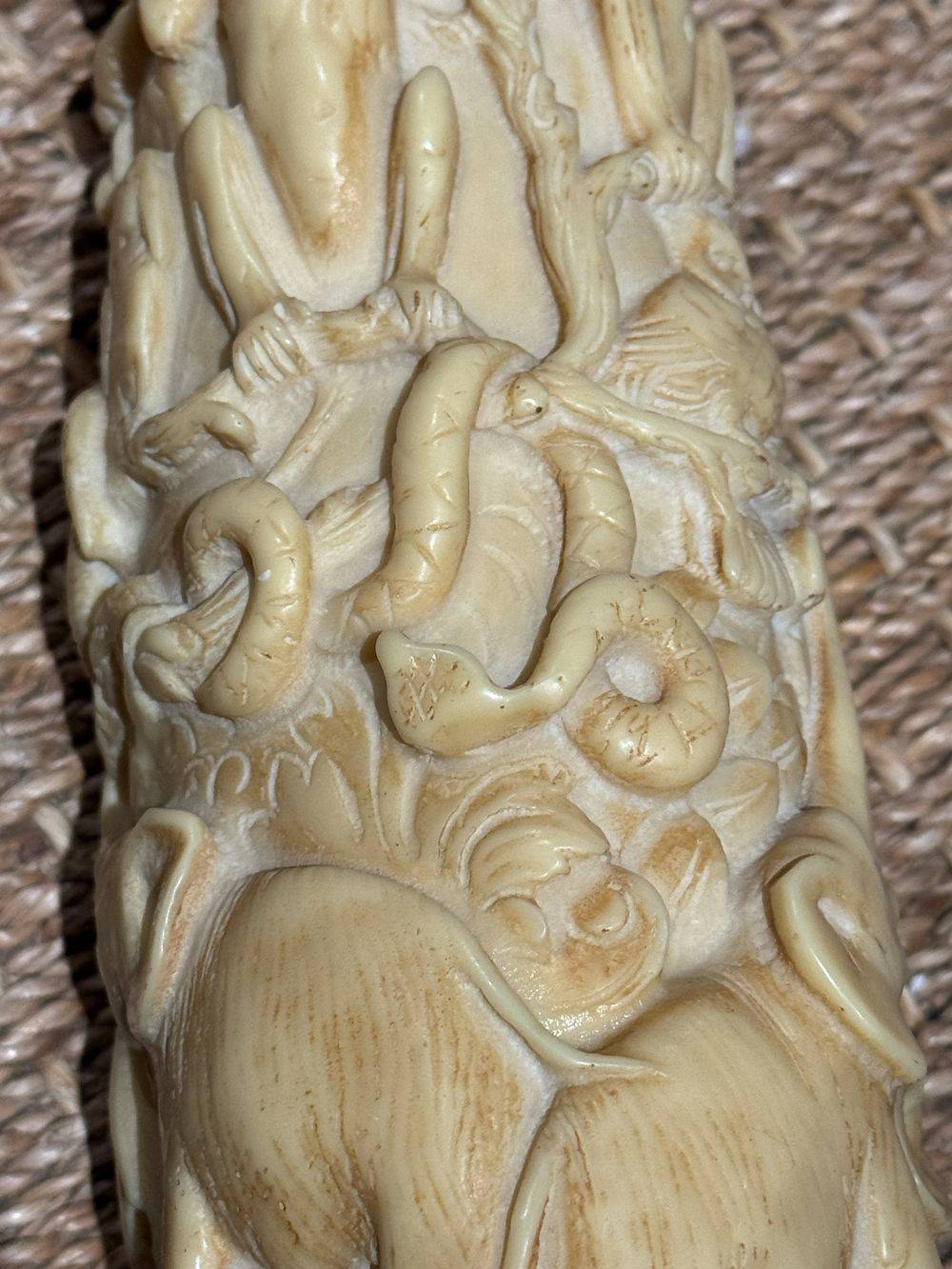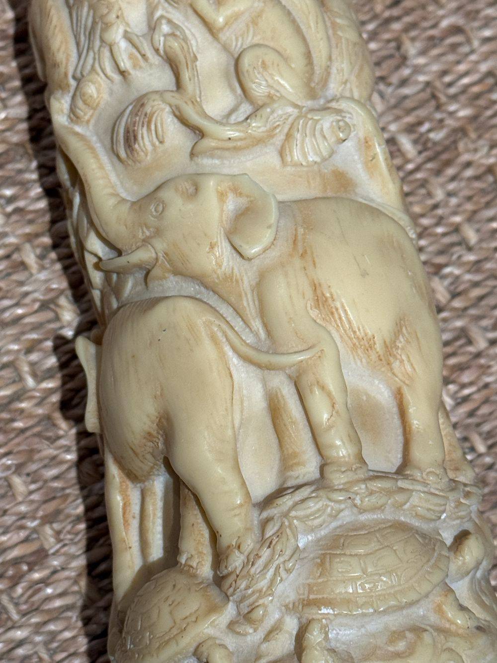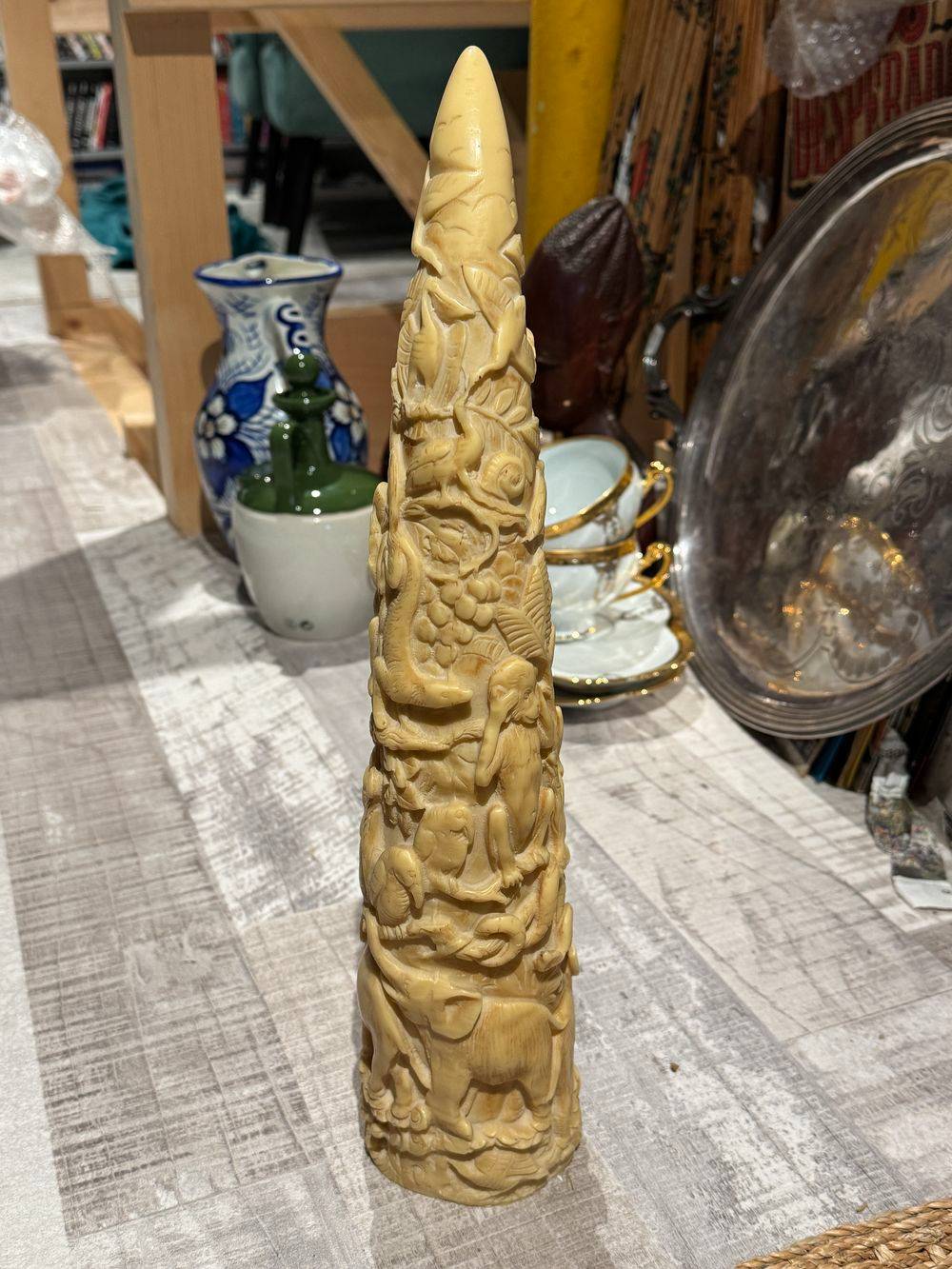 Ancienne Grande Corne / » Défense d’Eléphant ou rhino » en résine sculptée de nombreux animaux – Des années 1960 – Décoration – Collection – Vintage