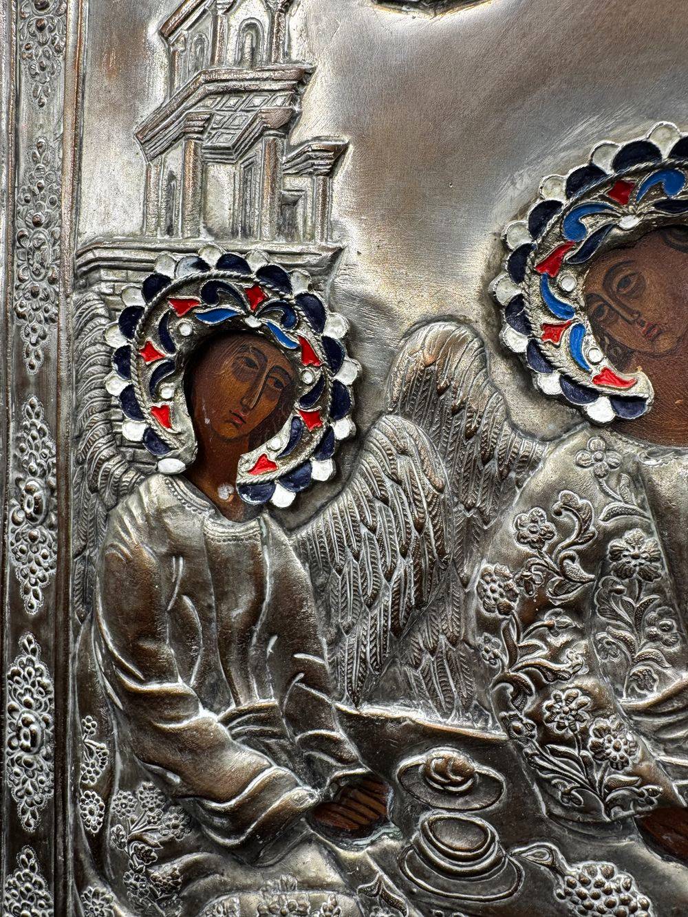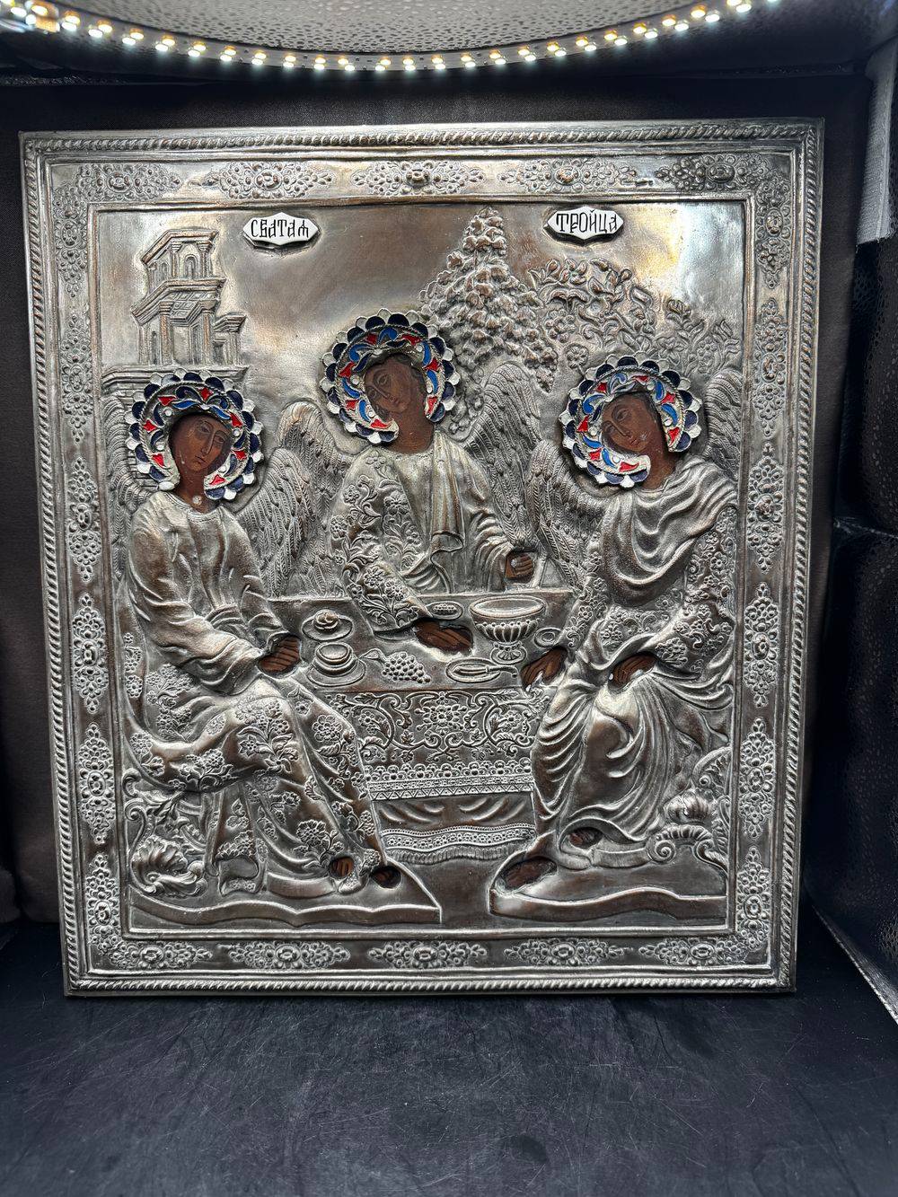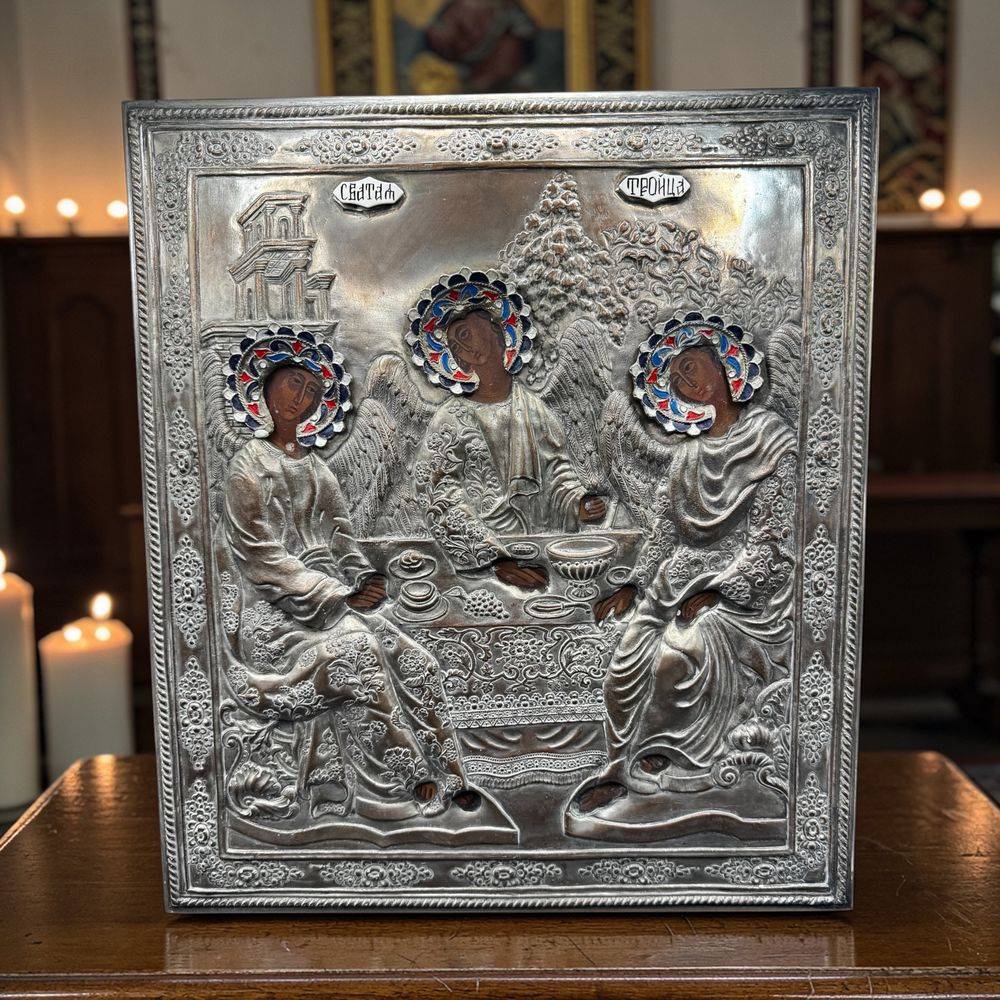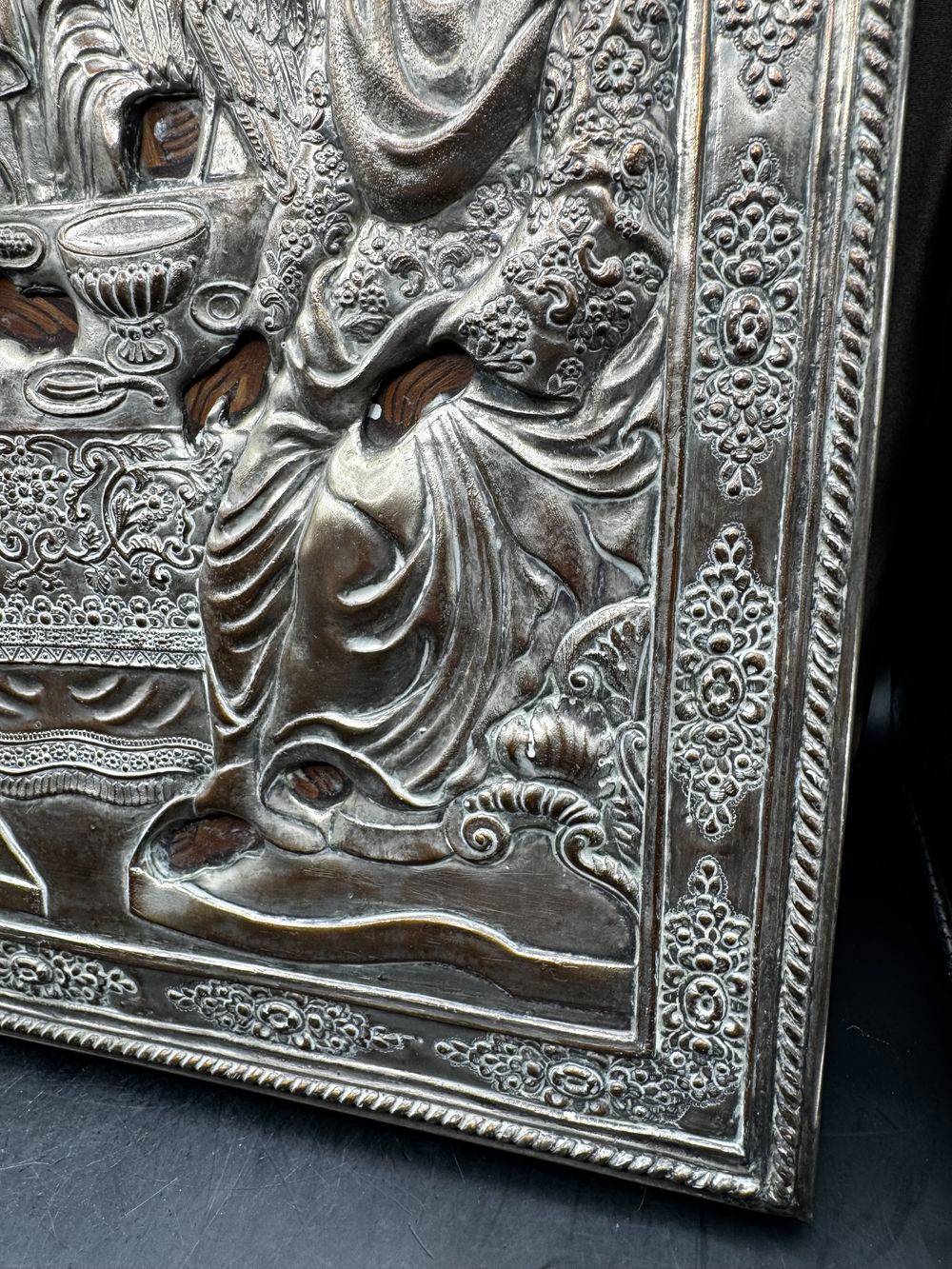 Ancienne, imposante et très rare Icône Orthodoxe grecque peinte à la main sur bois recouverte d’une belle Oklad en métal argenté