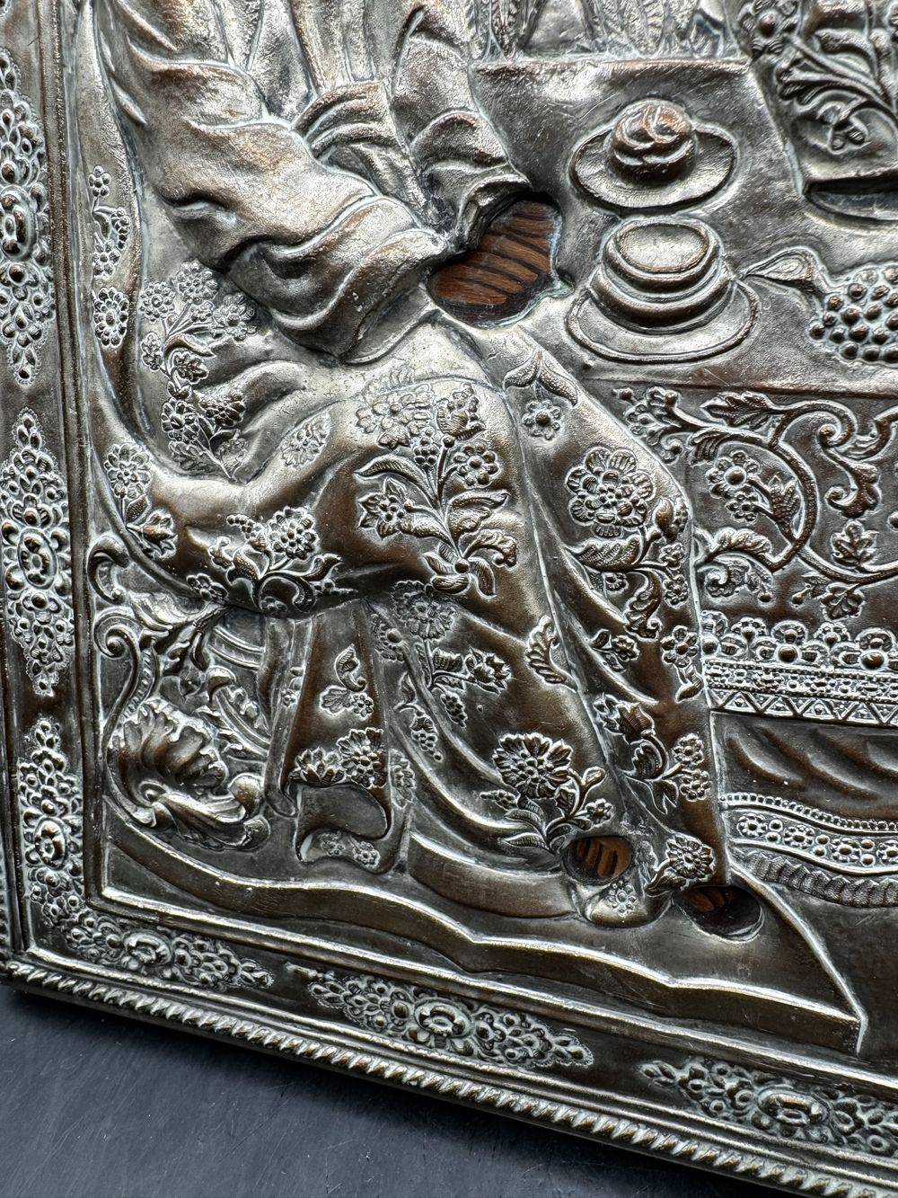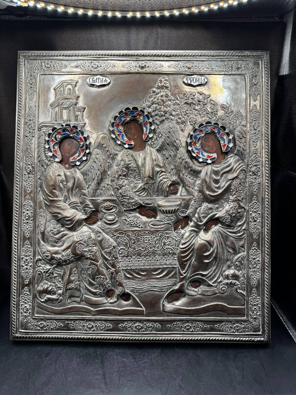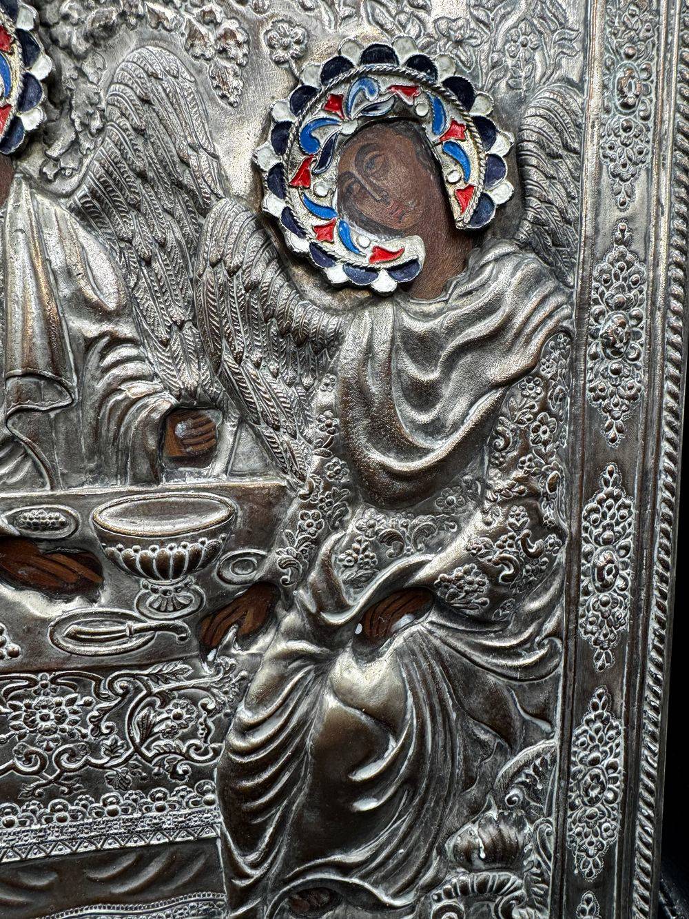 Ancienne, imposante et très rare Icône Orthodoxe grecque peinte à la main sur bois recouverte d’une belle Oklad en métal argenté