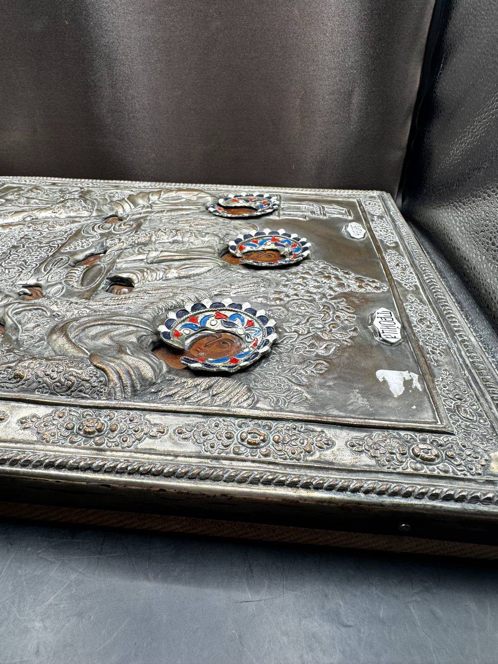 Ancienne, imposante et très rare Icône Orthodoxe grecque peinte à la main sur bois recouverte d’une belle Oklad en métal argenté – Collection – Déco