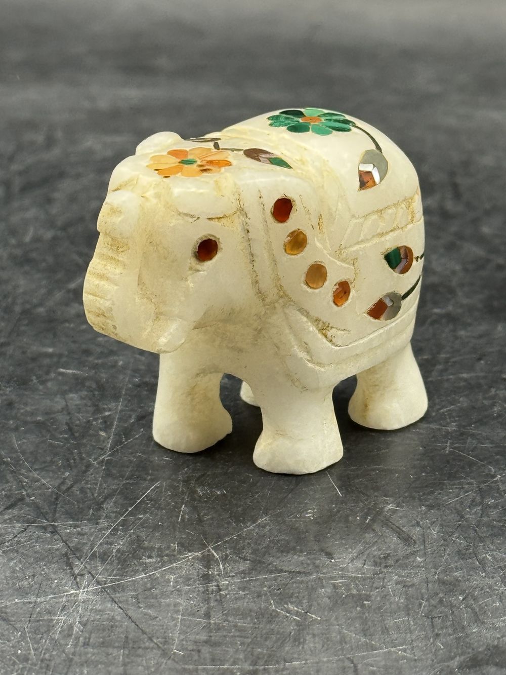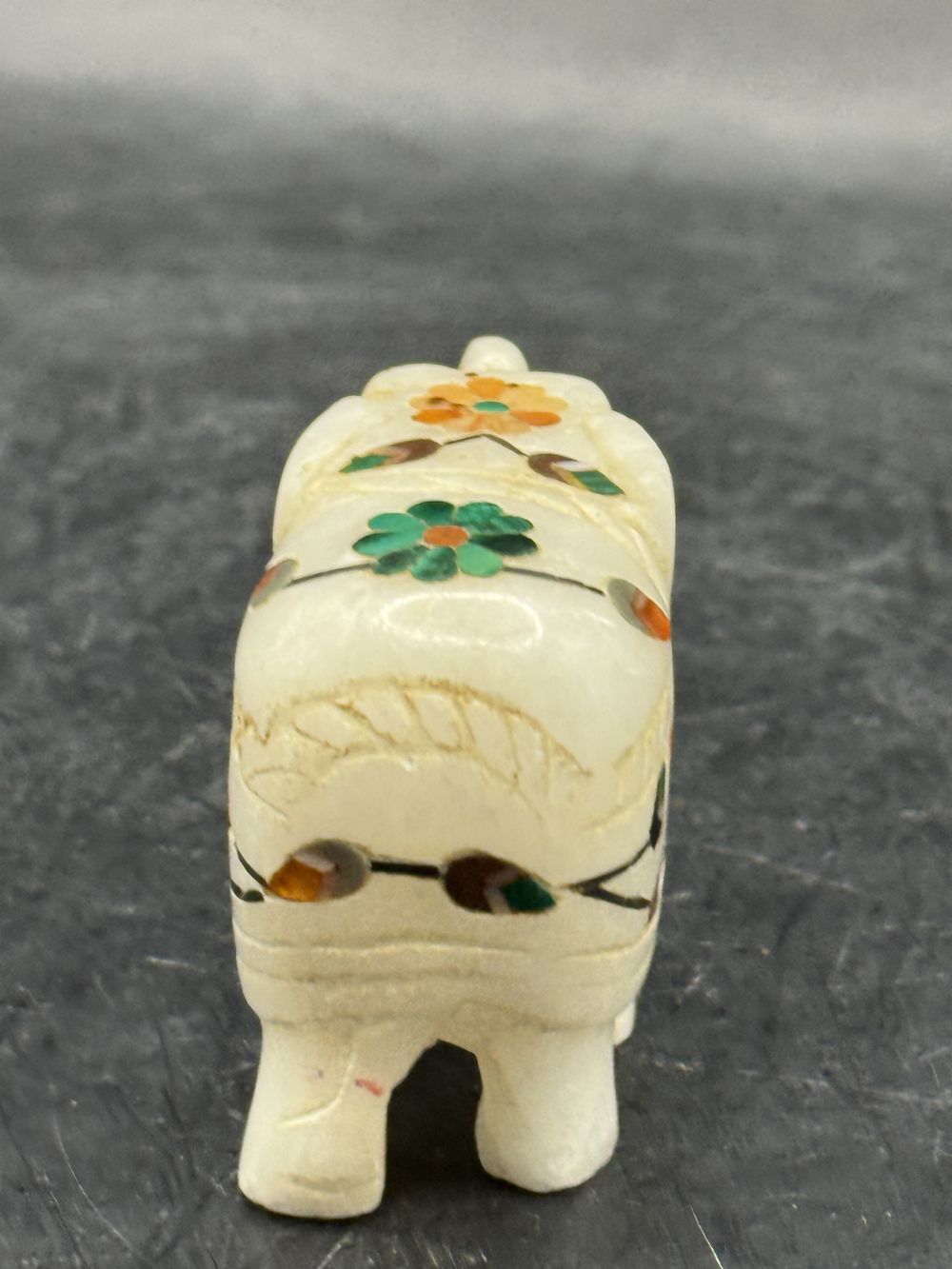 Ancienne miniature d’Eléphant en pierre marbrière incrustée de pierres semi-précieuses (1 fleur verte-1 fleur orange) réalisée et sculptée à la main – Asie – Datant des années 80 – Collection – Décoration – Vintage