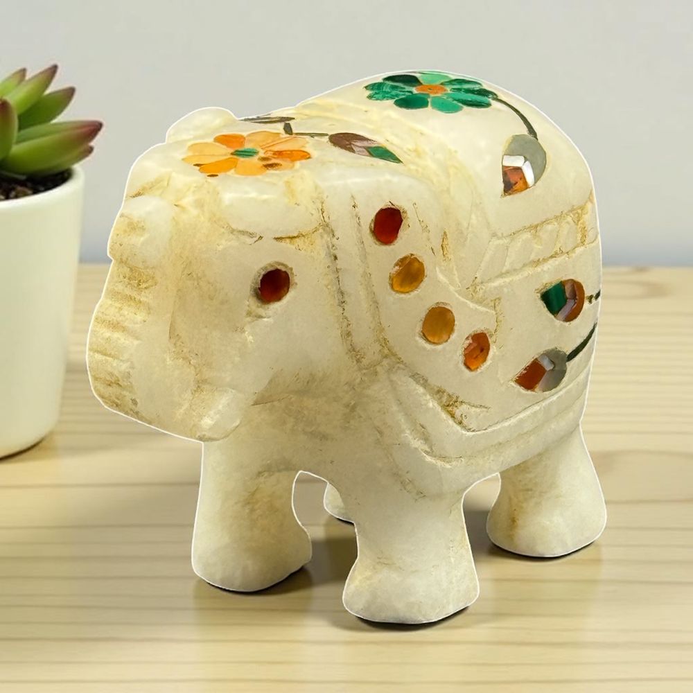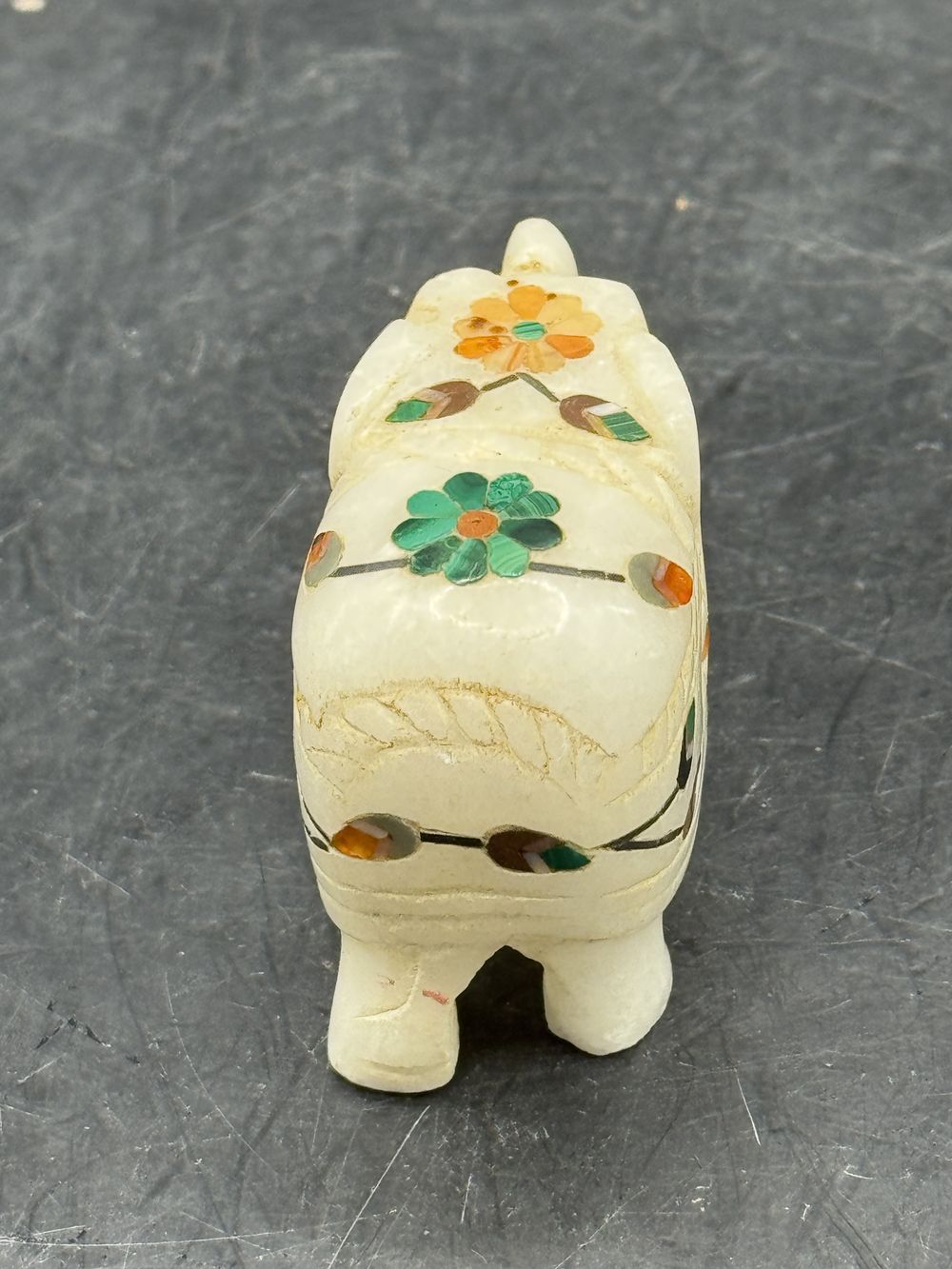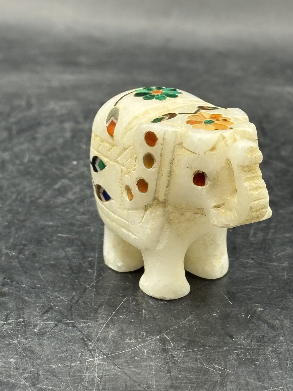 Ancienne miniature d’Eléphant en pierre marbrière incrustée de pierres semi-précieuses (1 fleur verte-1 fleur orange) réalisée et sculptée à la main – Asie