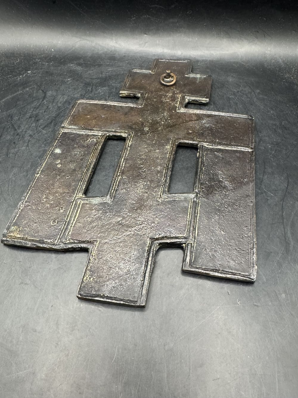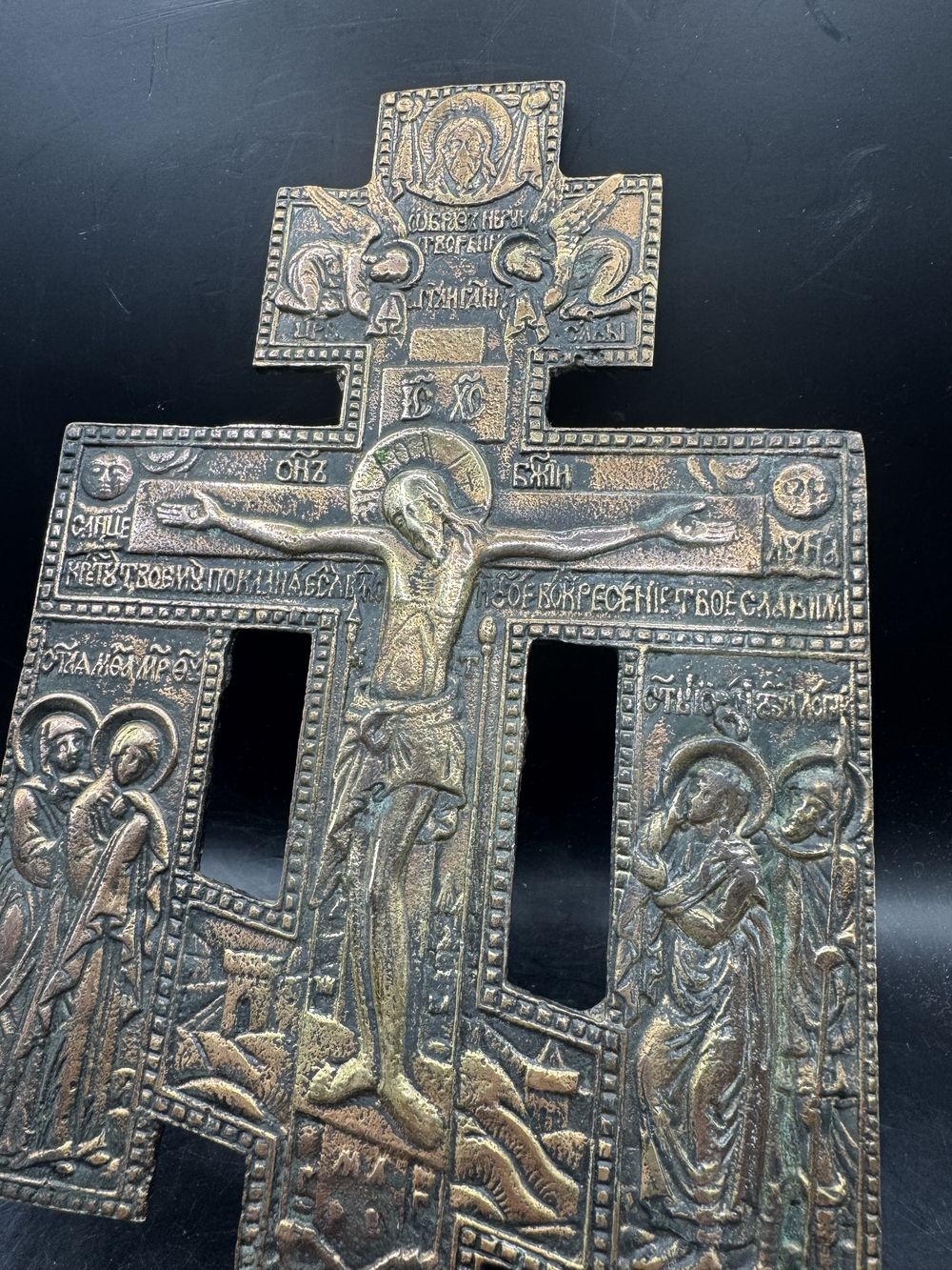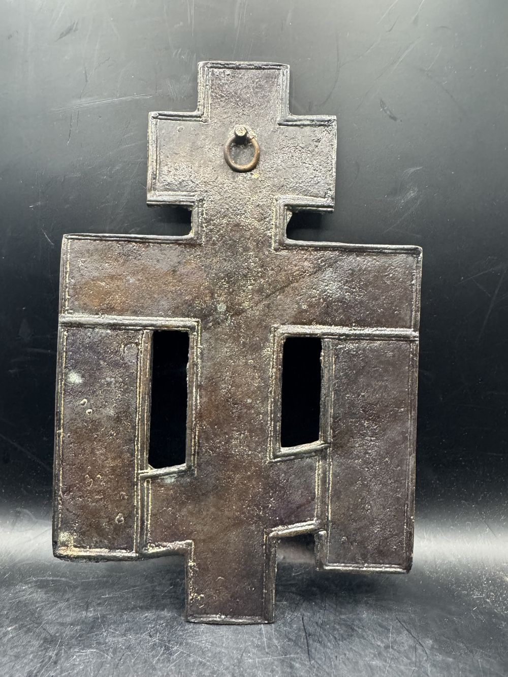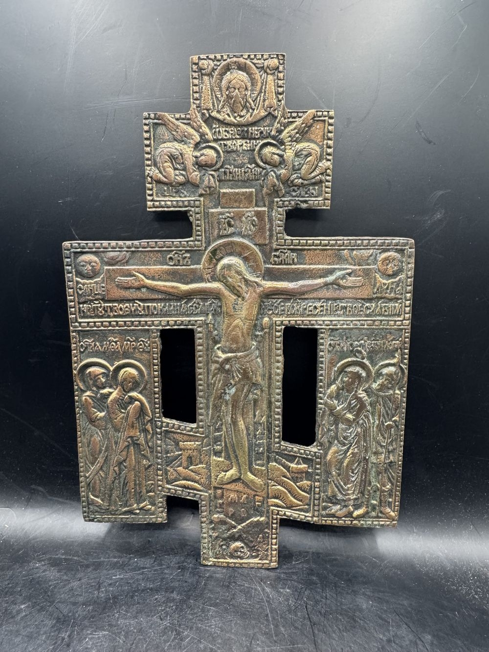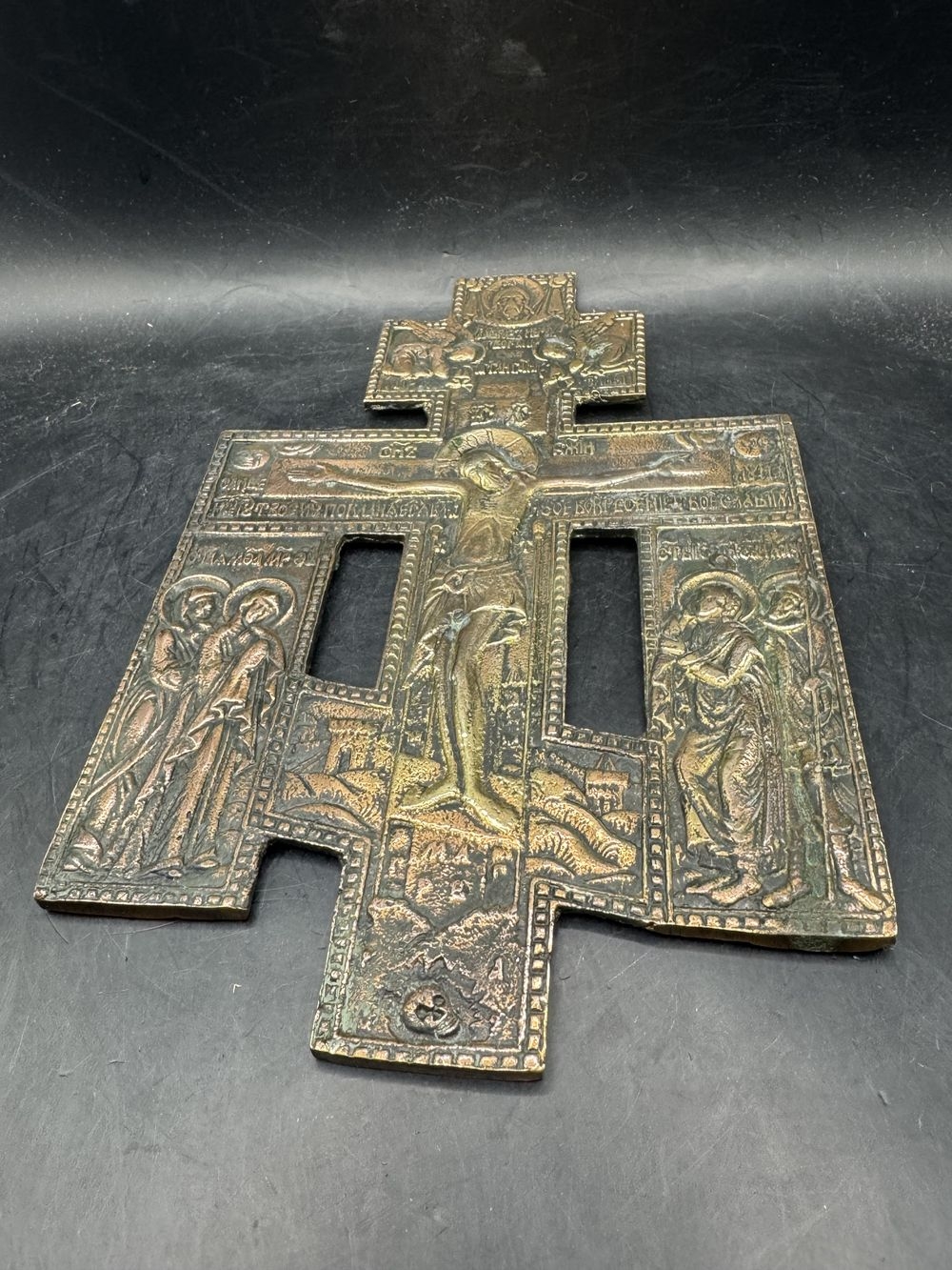 Ancienne rare Antique croix ou crucifix chrétien orthodoxe russe en bronze doré et ornementé – Russie ou Ukraine – Circa 1890/1900 – Décoration – Collection