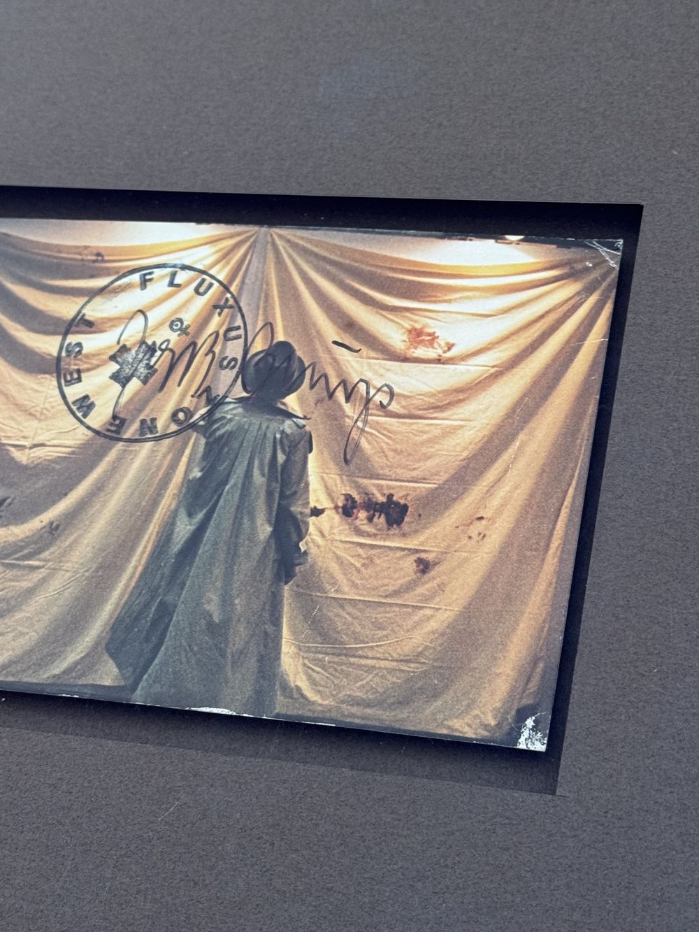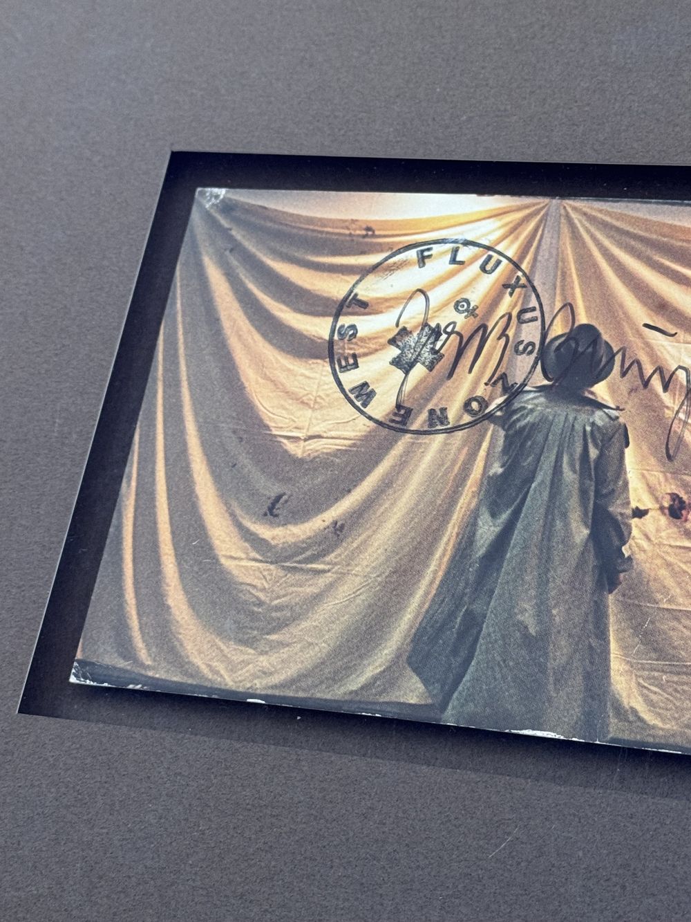 Carte (le représentant) signée au feutre noir par Joseph Heinrich Beuys et recouverte, ce qui est rare, du tampon » FLUXUX ZONE WEST et la fameuse croix «