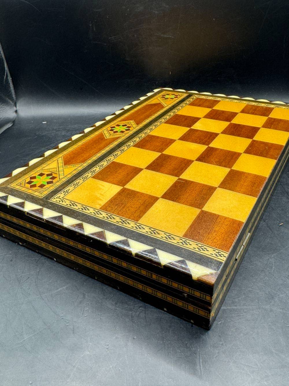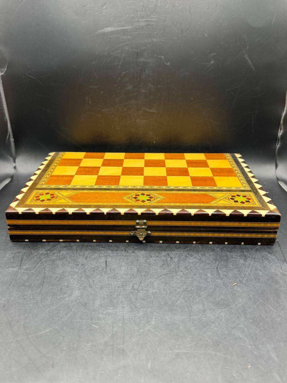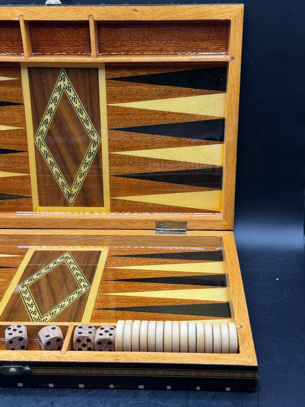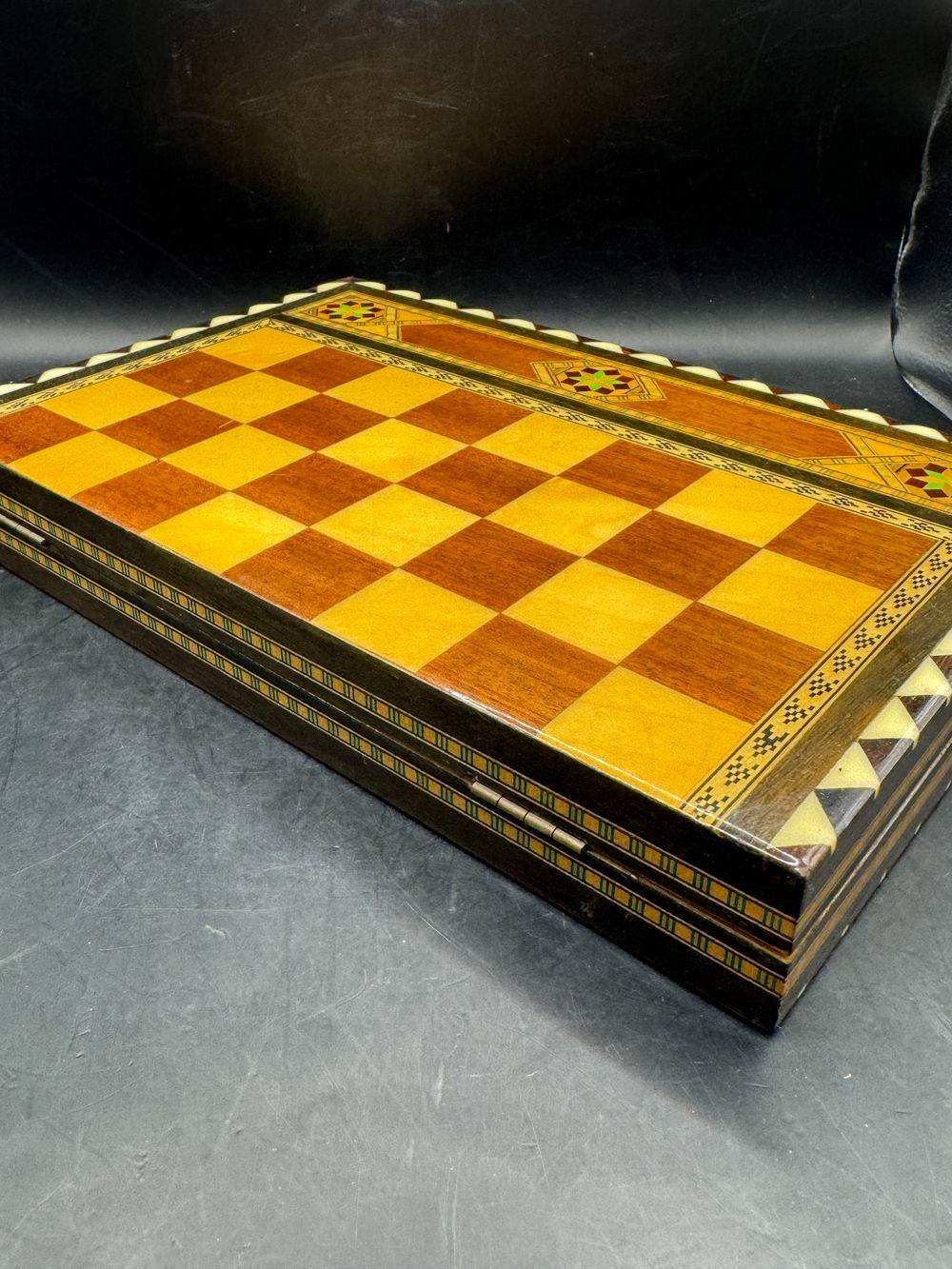 Boite de jeu en bois de dame et de Backgammon – Motifs incrustés et vernis – Décoration – Collection – Vintage des années 80