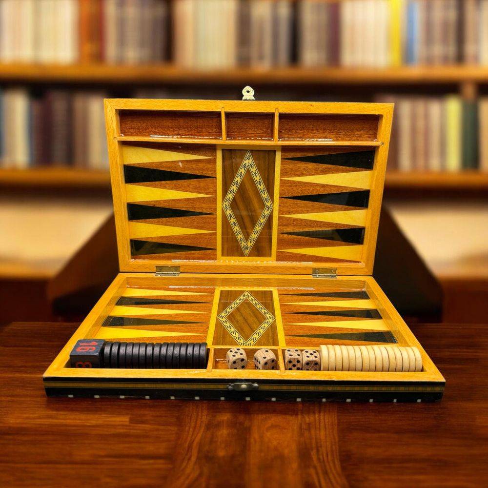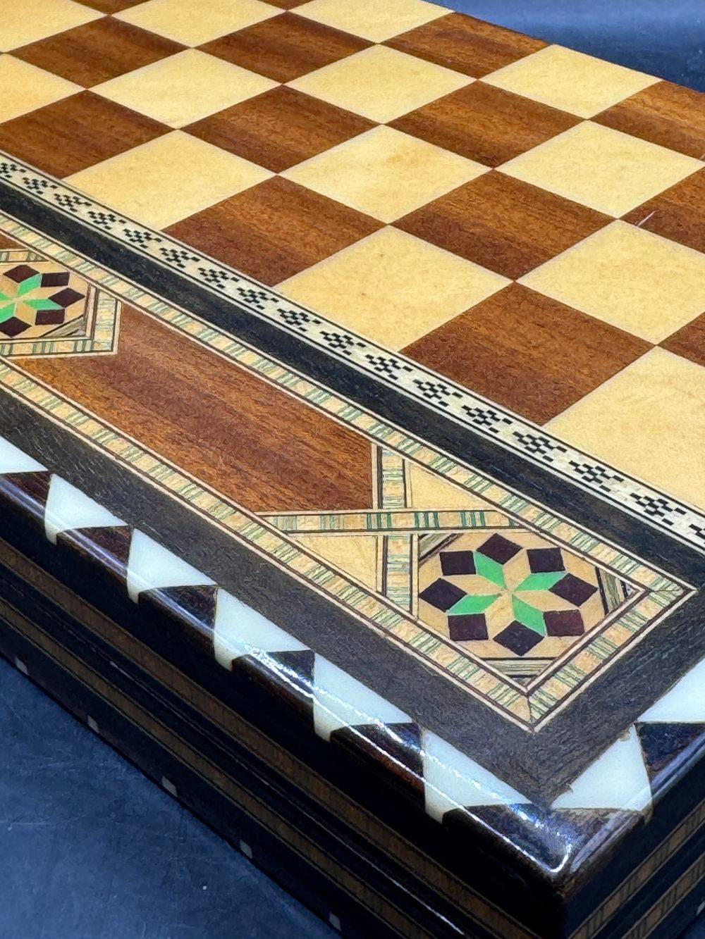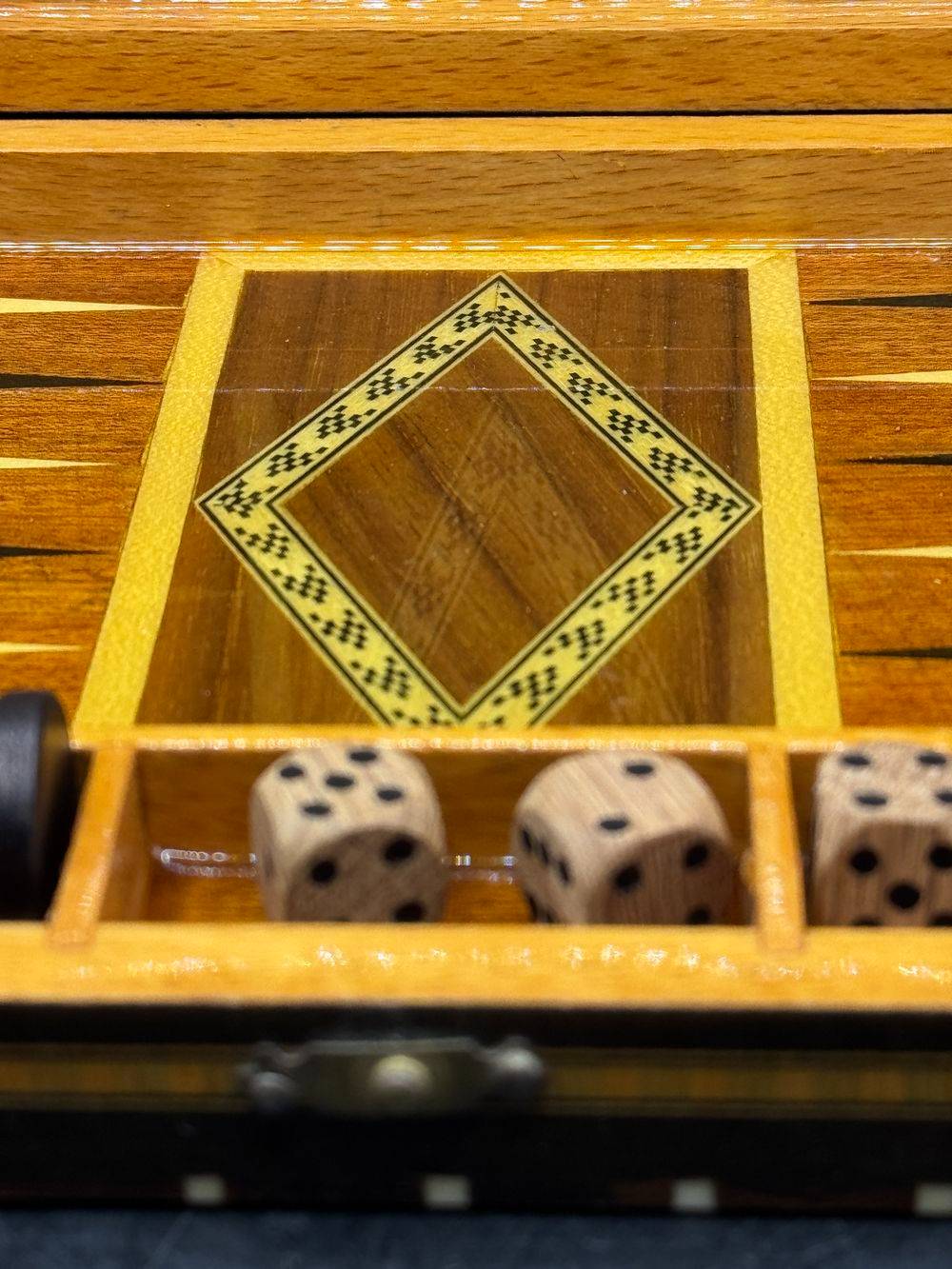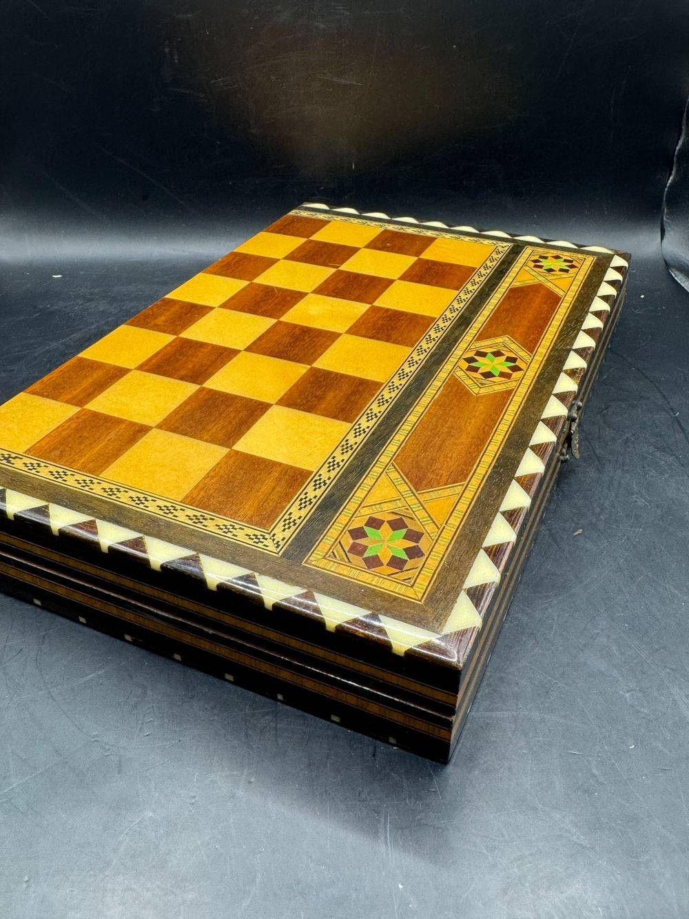Boite de jeu en bois de dame et de Backgammon – Motifs incrustés et vernis – Décoration – Collection – Vintage des années 80