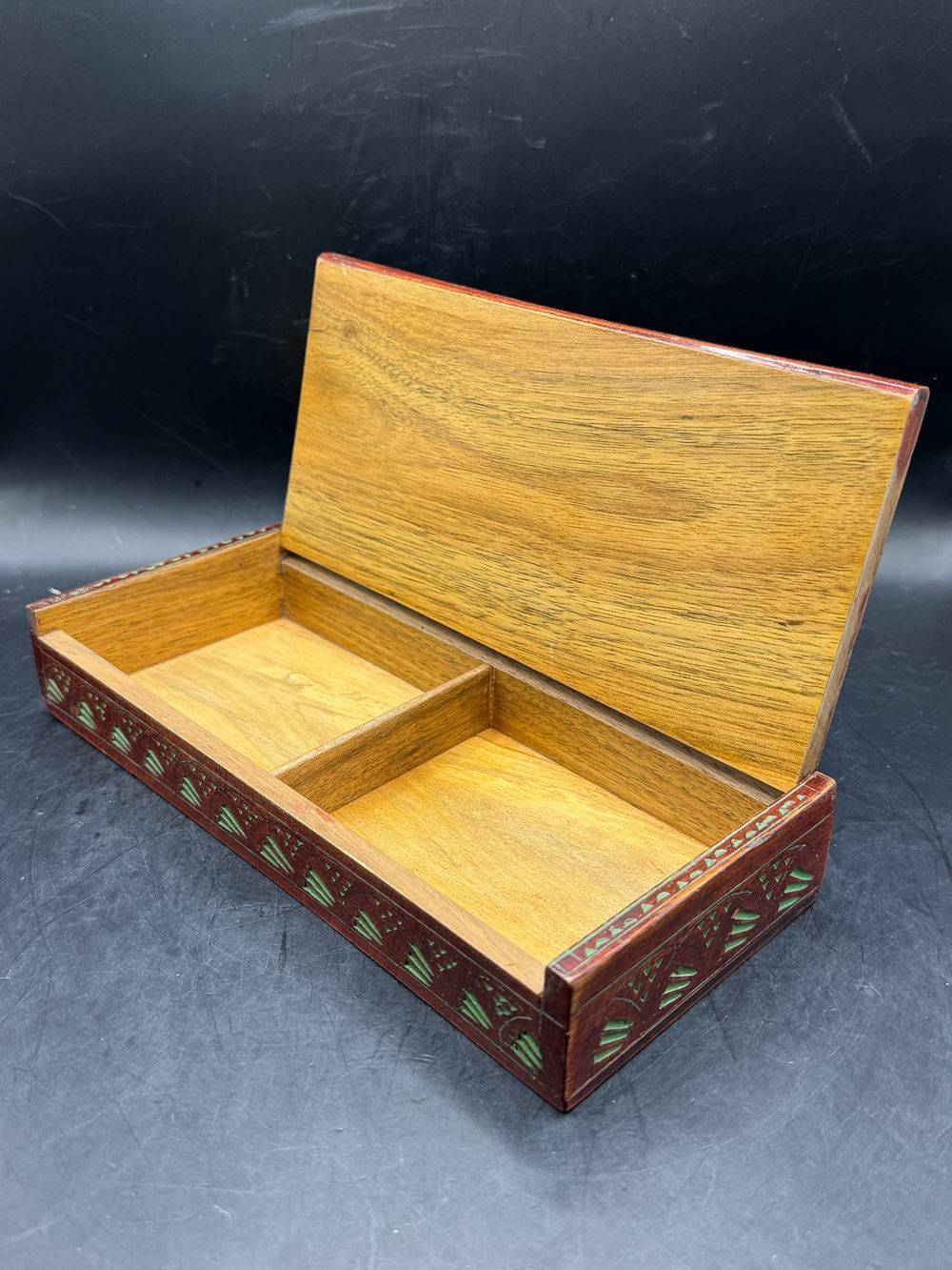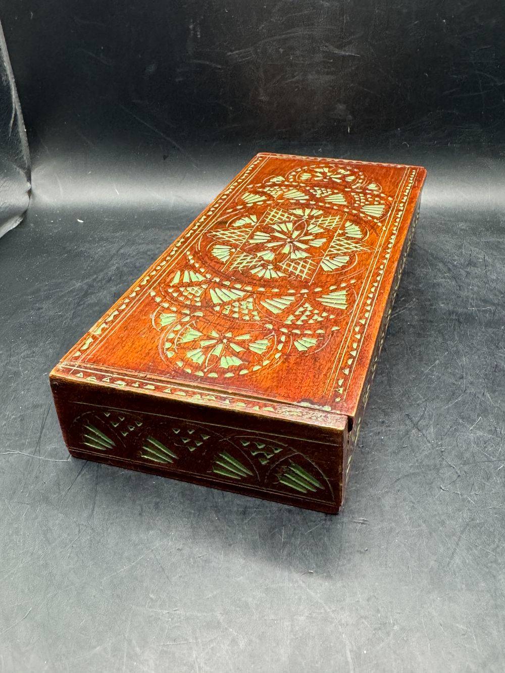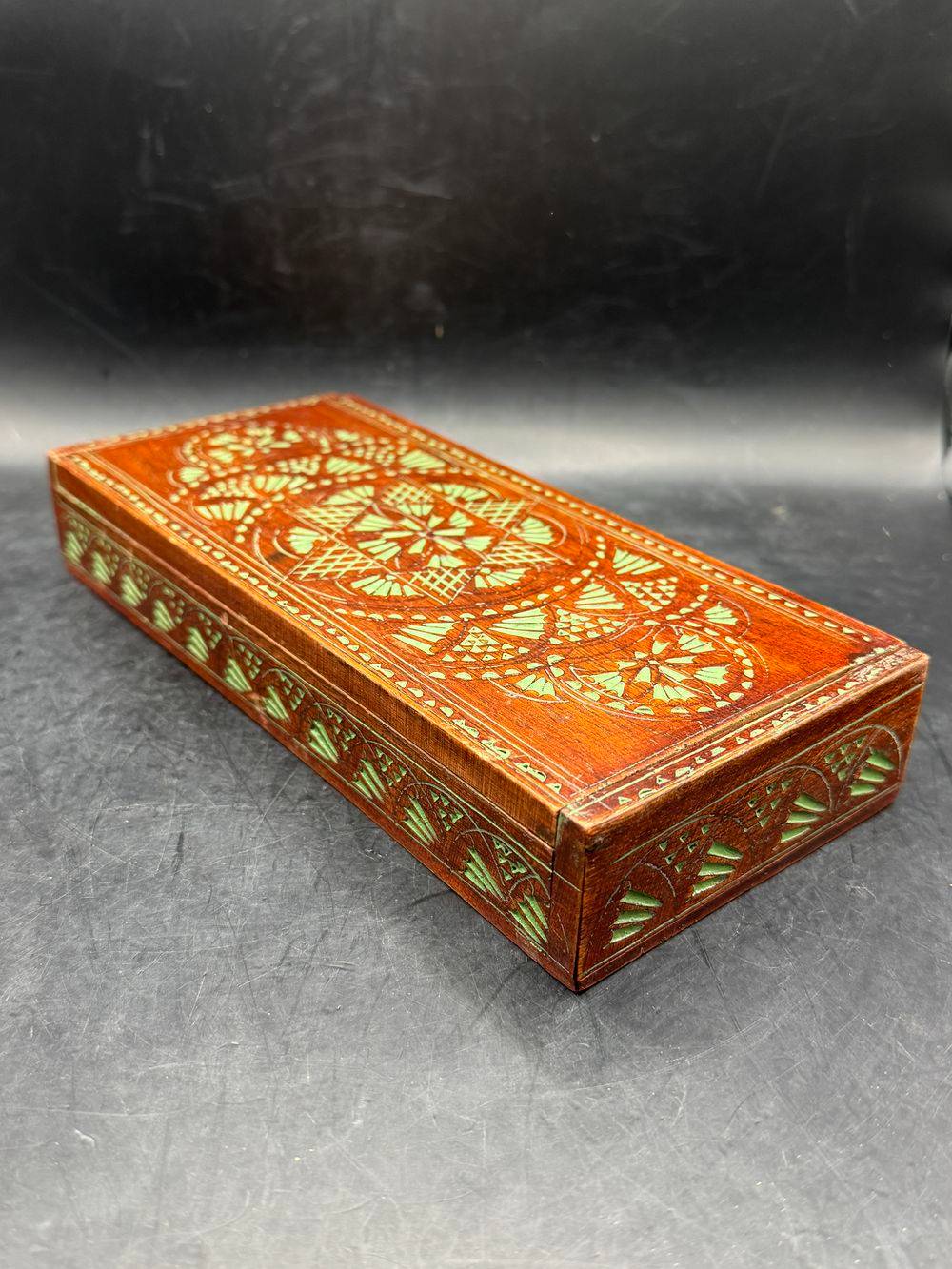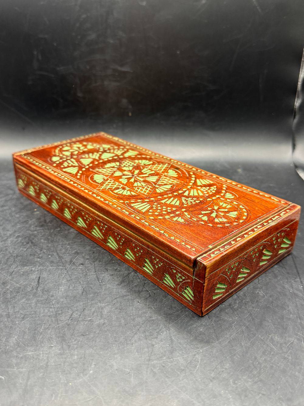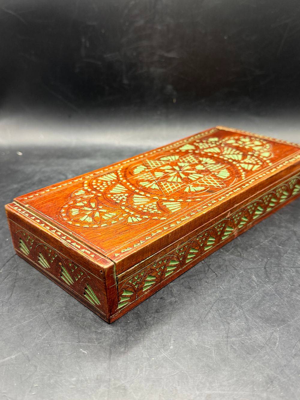 Boite de rangement en bois – Motifs sculptés et peints en vert – Décoration – Collection – Vintage des années 60/70 – Artisanat