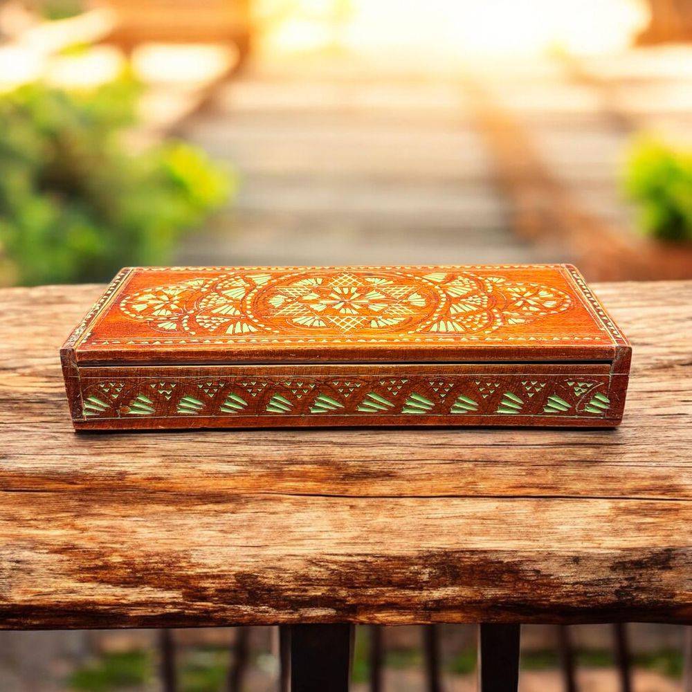 Boite de rangement en bois – Motifs sculptés et peints en vert