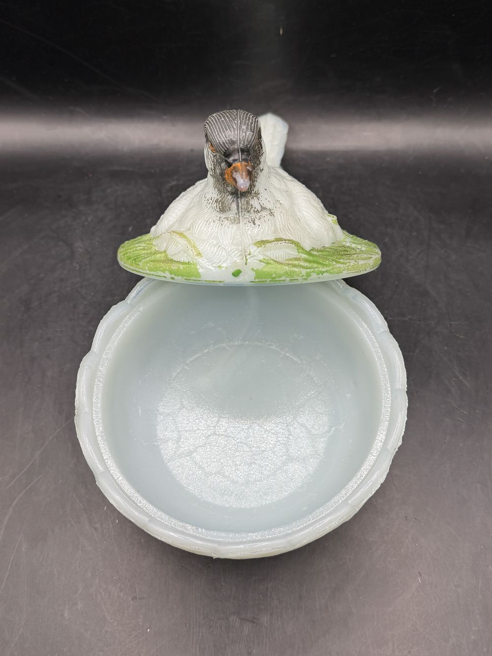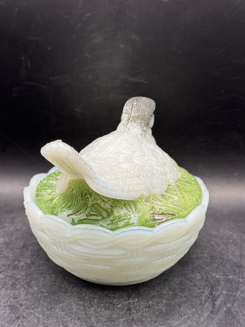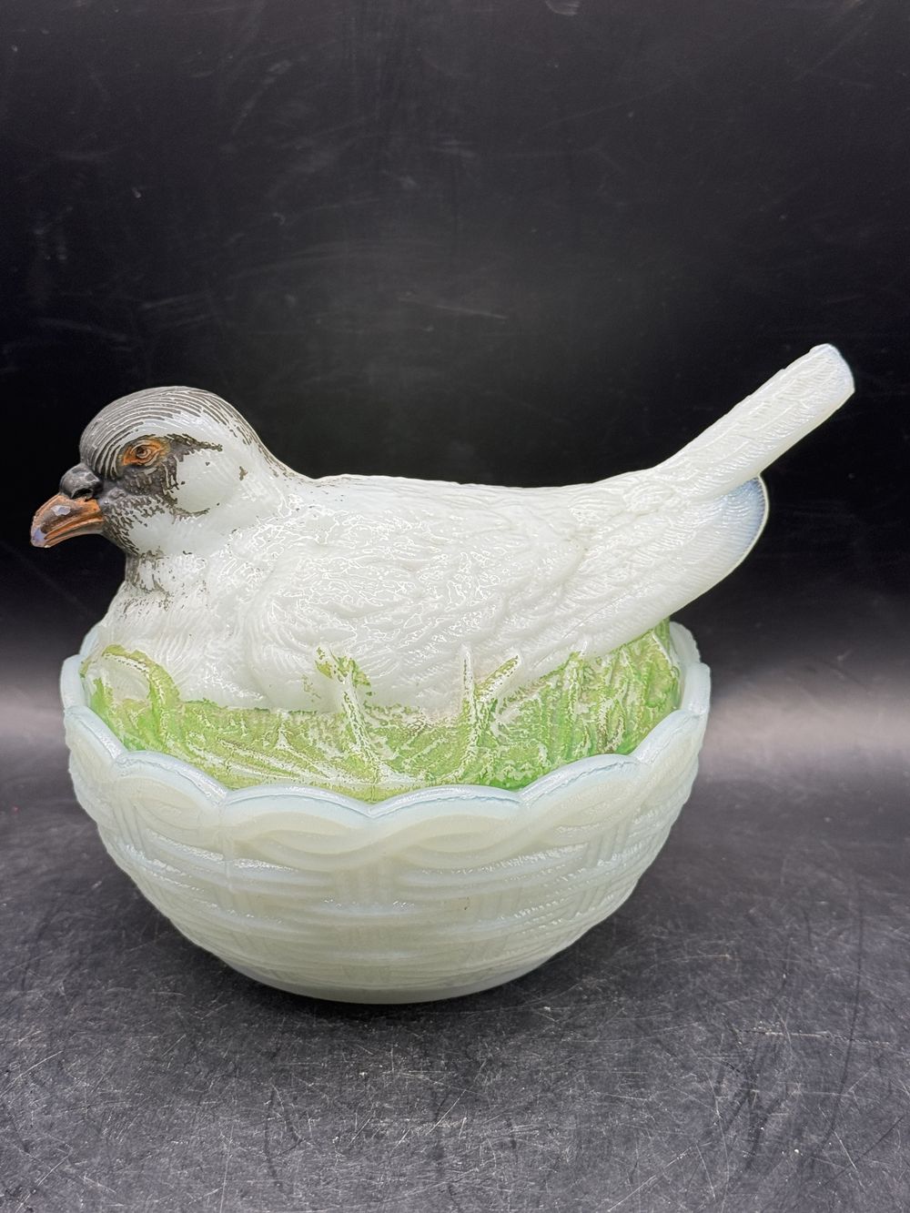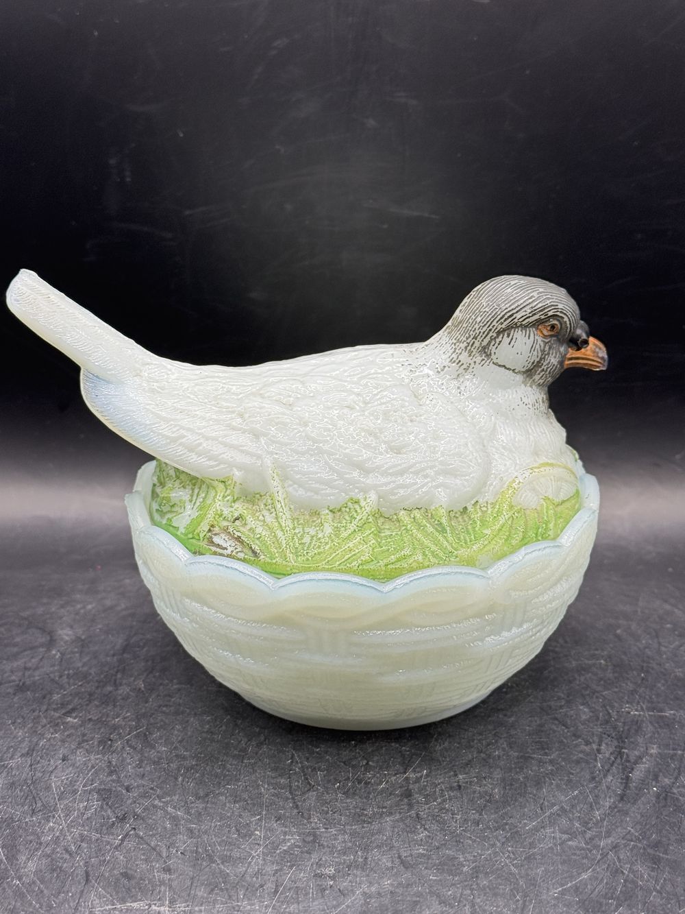 Bonbonnière ronde (ou sucrier ou beurrier) en verre opaline blanche de Porthieux peint à la main représentant un oiseau/pigeon sur son nid d’osier tressé – Décoration – Collection