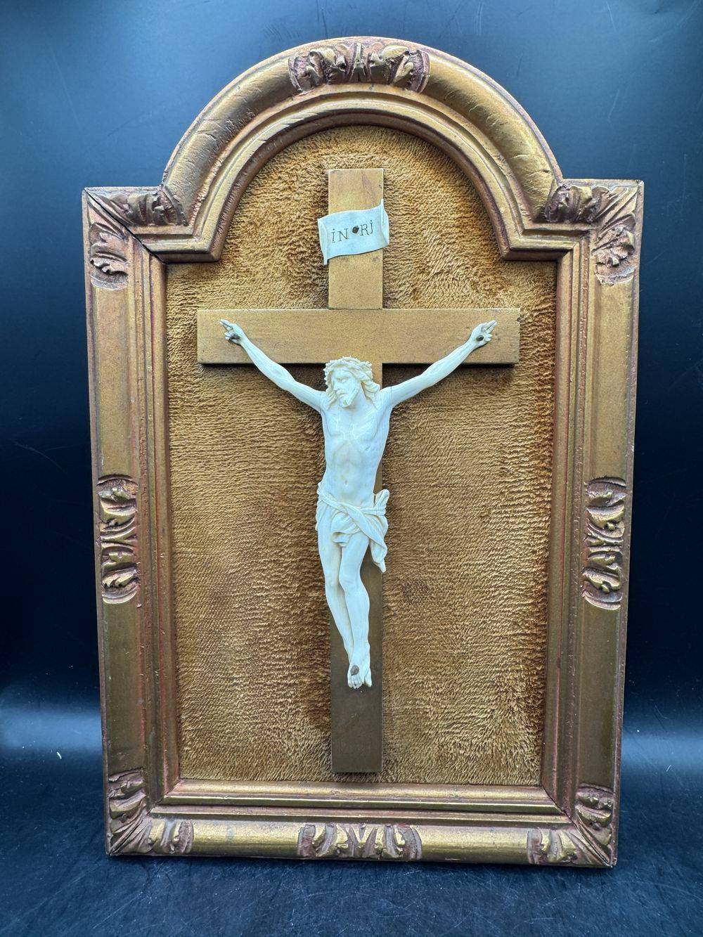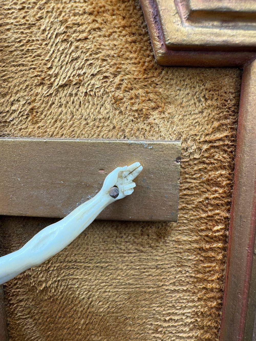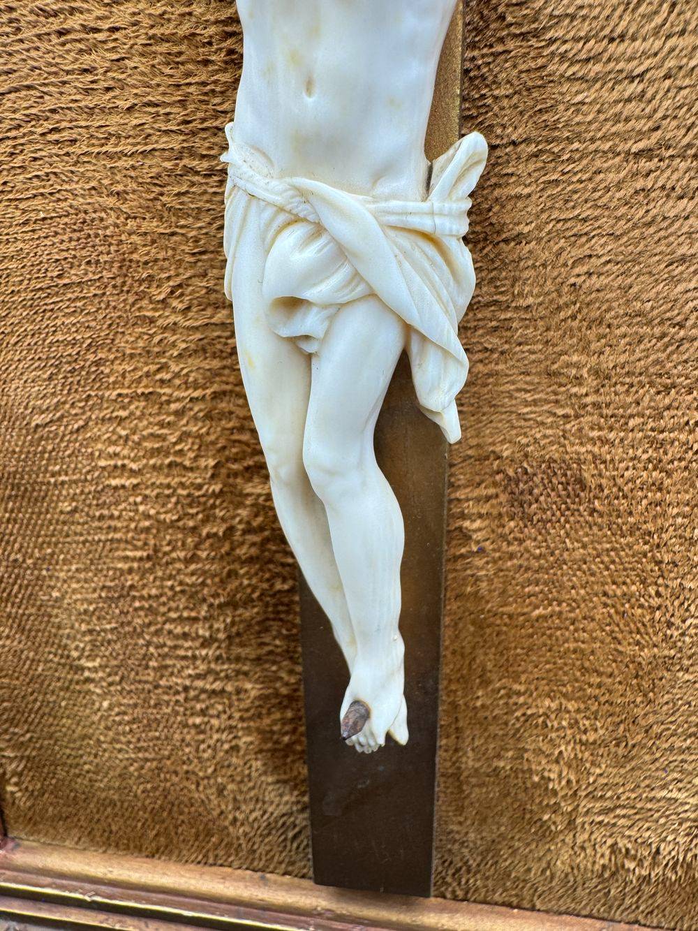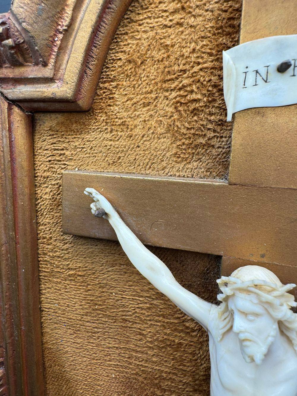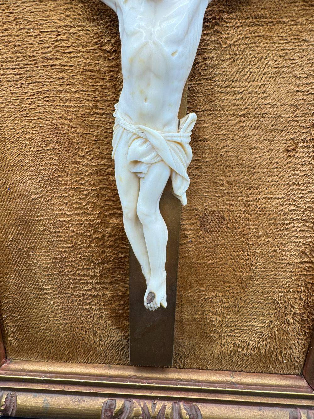 Christ de bout de lit dit crucifix en ivoire de morse sculpté d’époque fin 18ème début 19ème – Sur une croix en bois doré, placé sur un fond de velours (cadre d’époque) – Collection