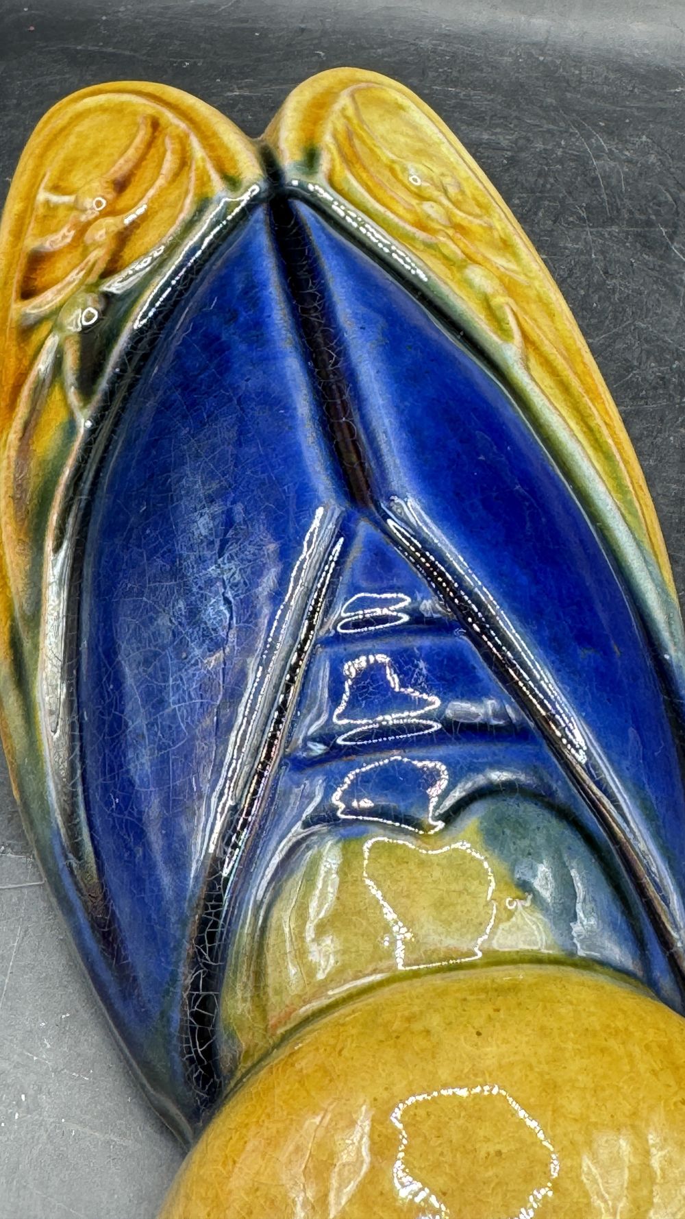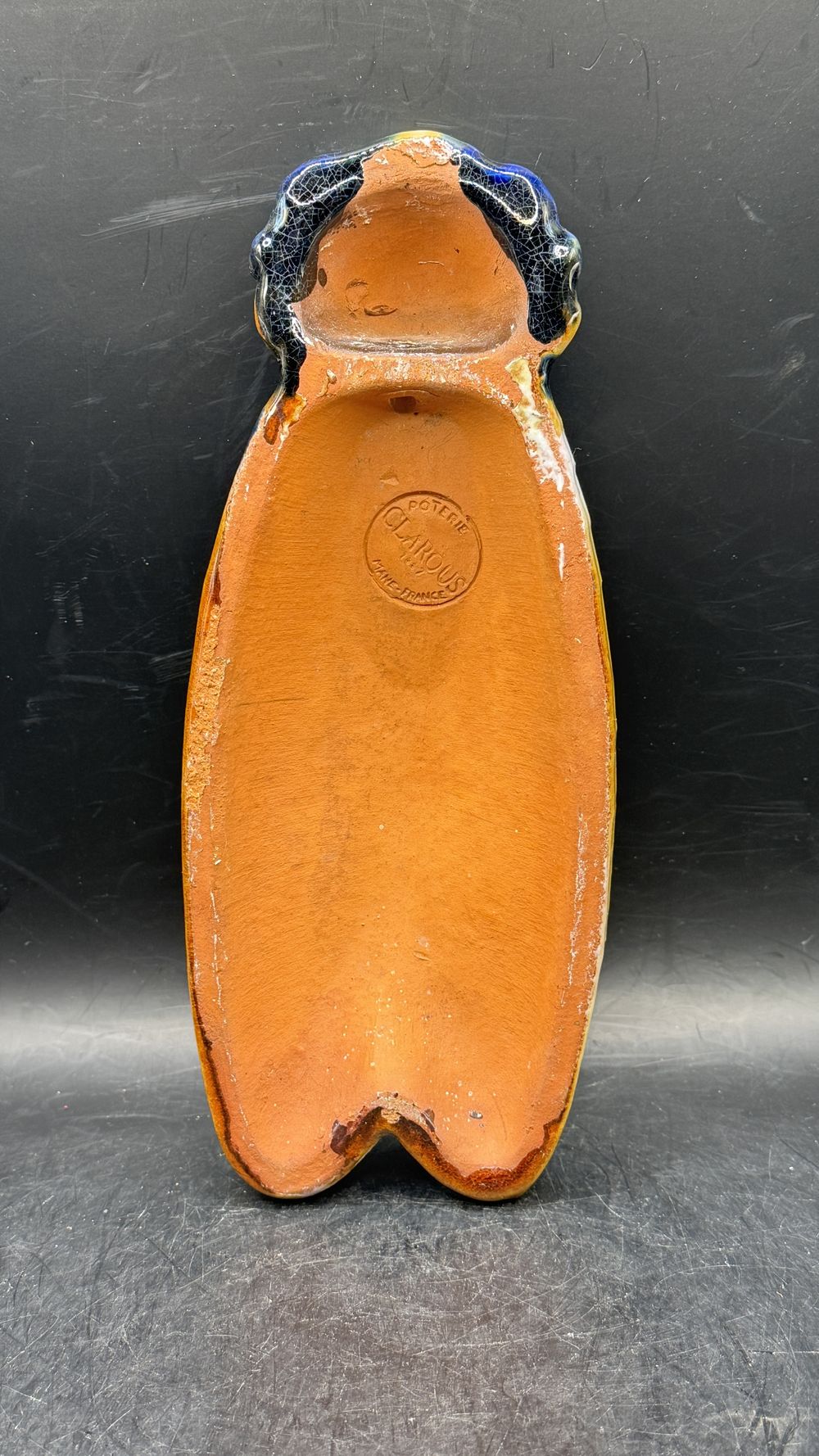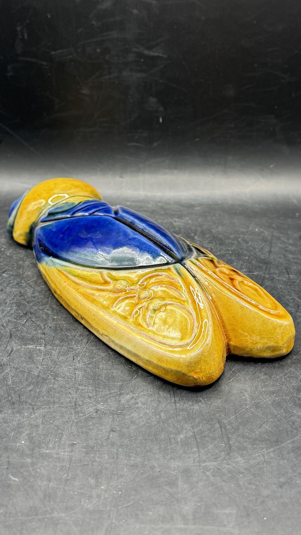 Cigale provençale grand modèle en terre cuite vernissée bleue et jaune – Pièce unique de chez Clarous – Made in France – Collection – Décoration