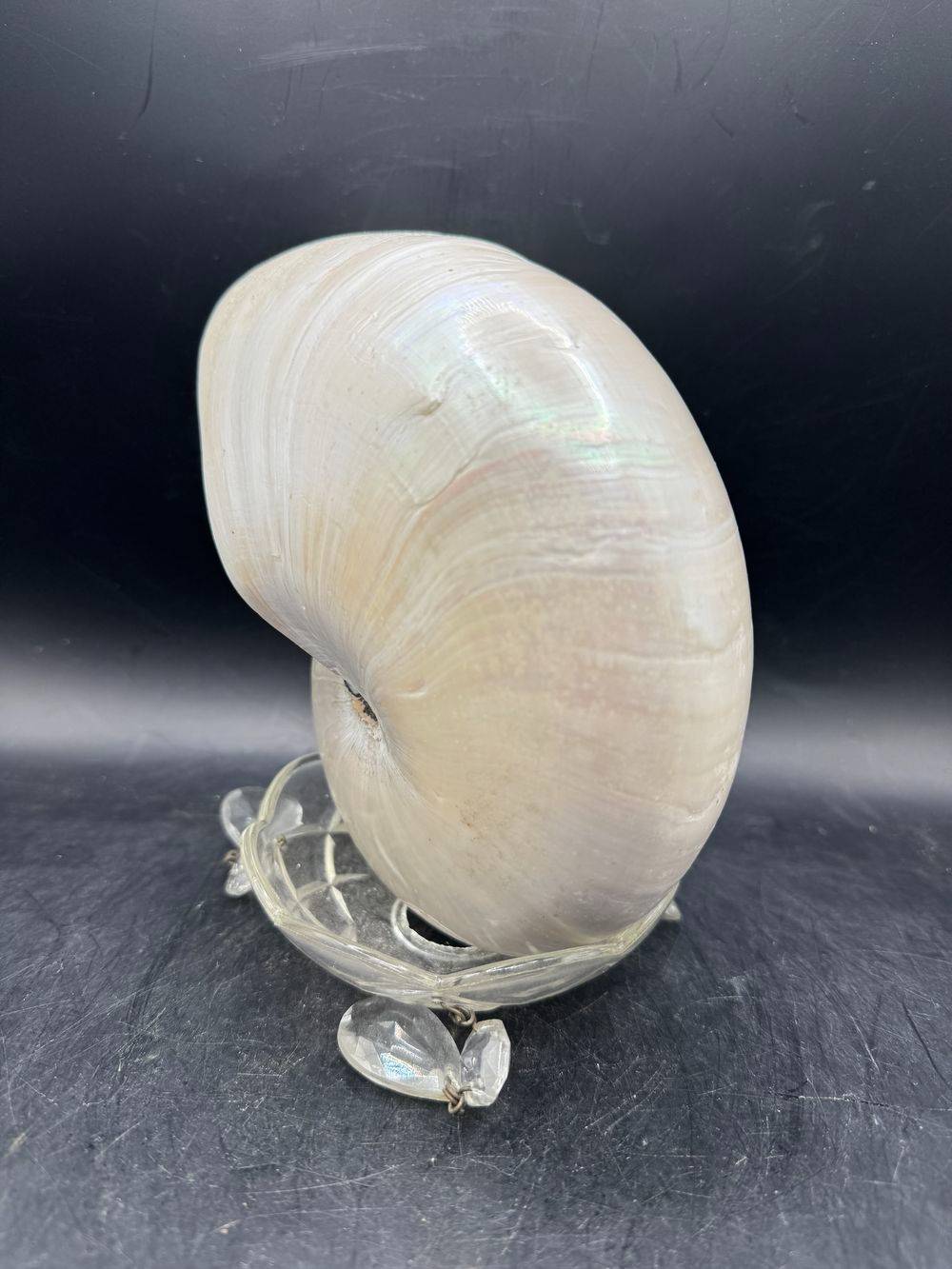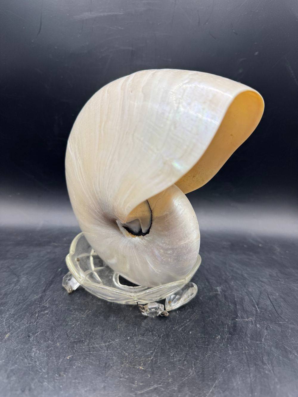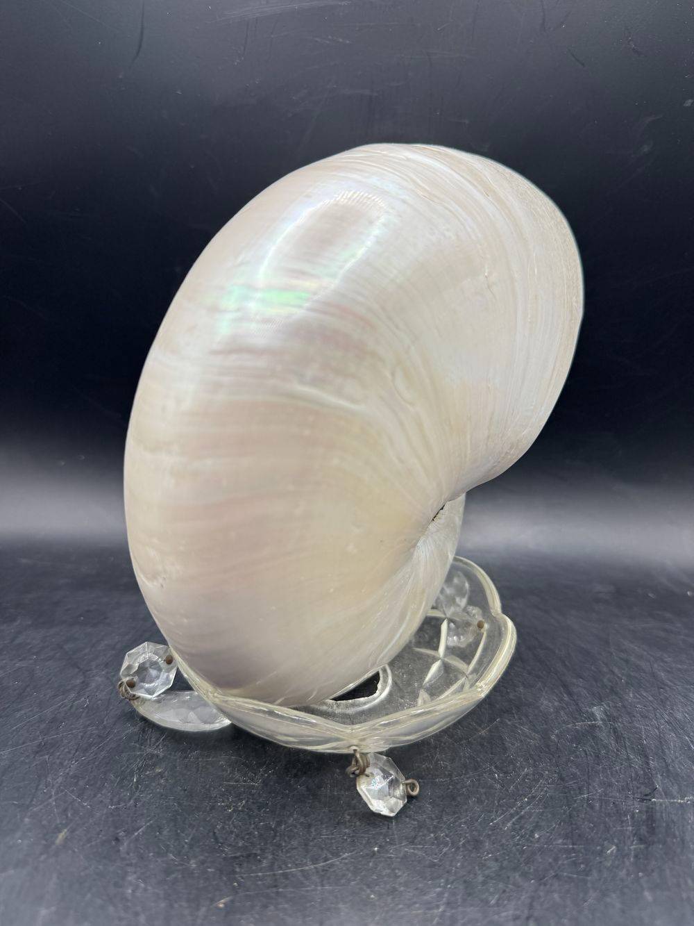 Nautile nacré. Ce coquillage, le Nautilus pompilius, est entièrement nacré car il a simplement été poli, et cette belle couleur est la couche inférieure de la coquille. Ce Nautile est exceptionnellement gros, il se remarquera dans tous les décors.