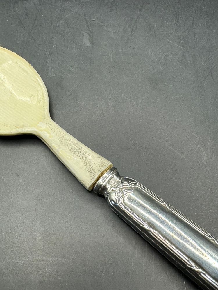 Cuillère à bouillie en argent – Poinçonnée et finement ciselée – Cuilleron en Bakélite ou Ivoire, l’ensemble d’époque début XXème siècle –