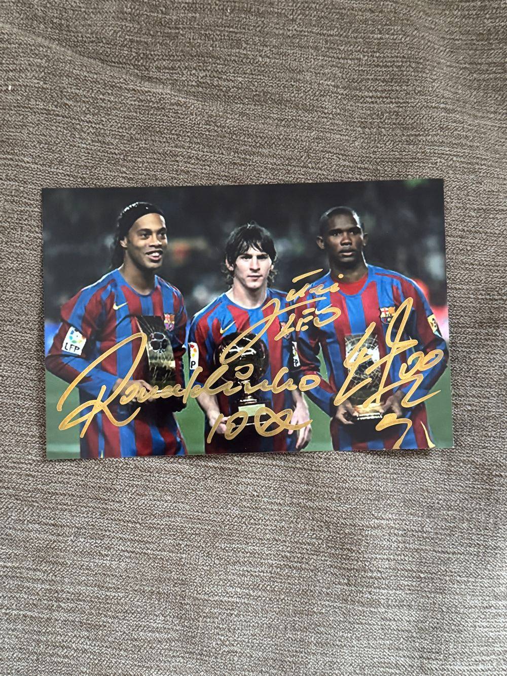 Dédicace – Autographe – Très rare photo signée en trio, au feutre doré, par Lionel Léo Messi – Ronaldinho – Samuel Eto’o