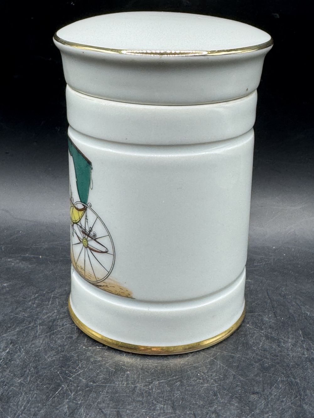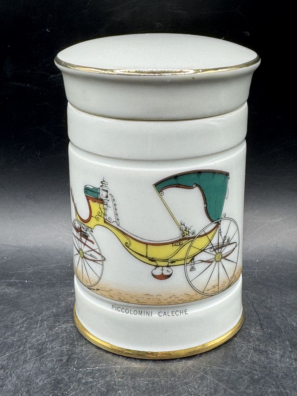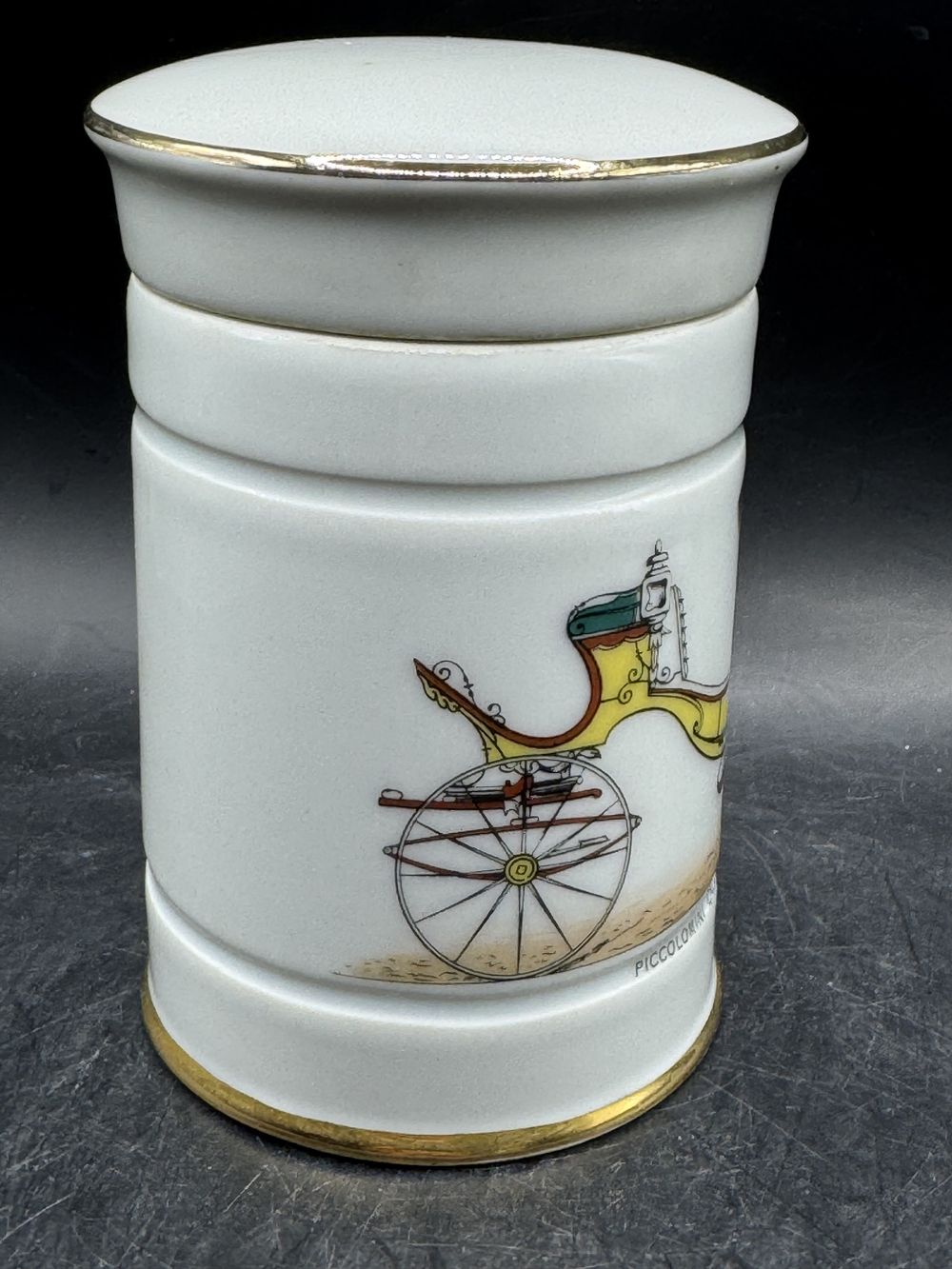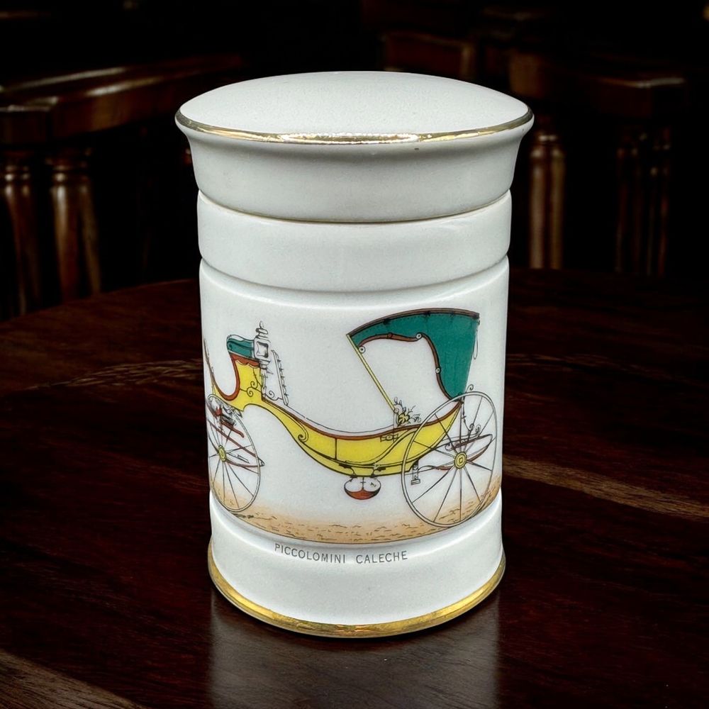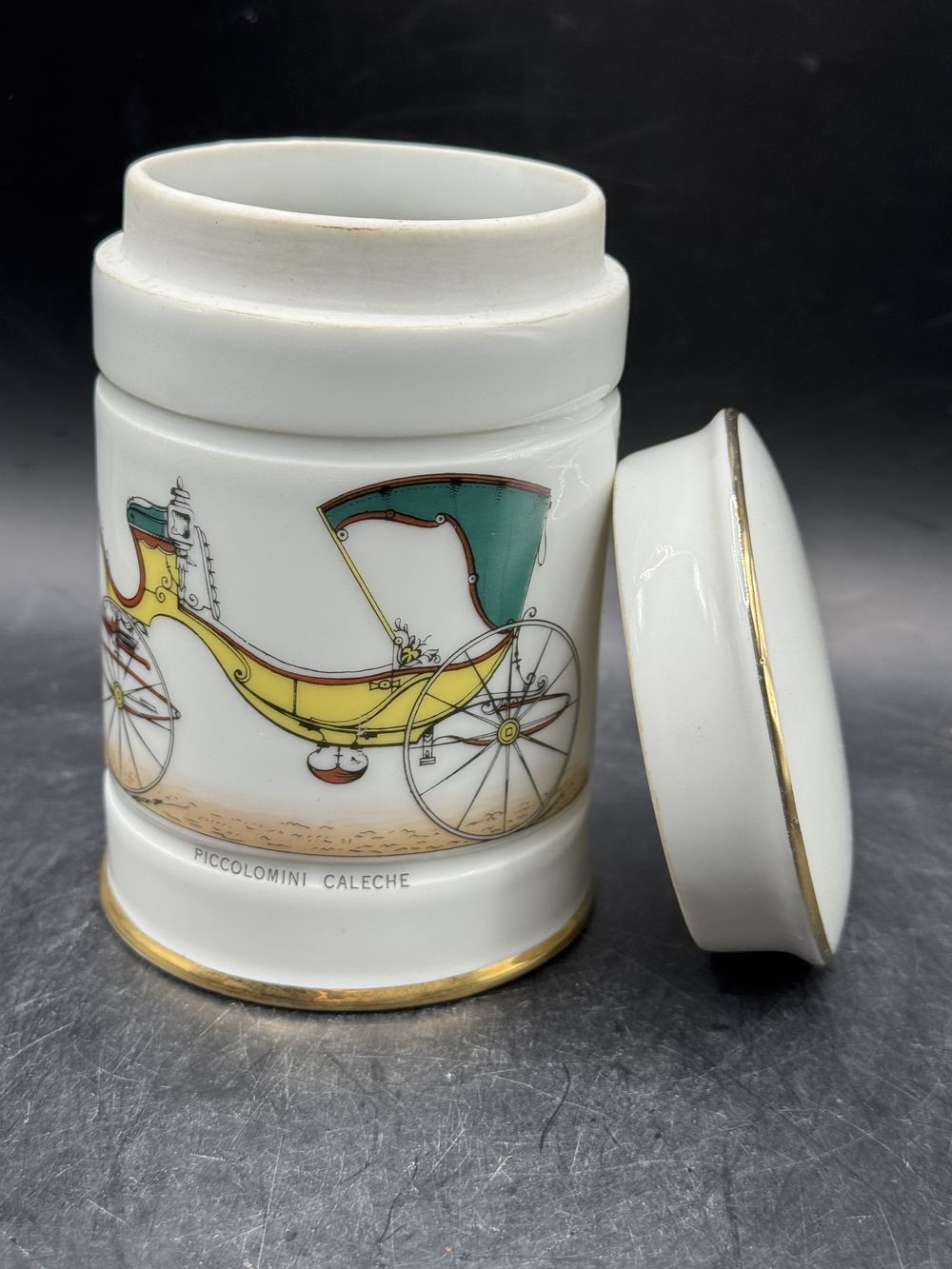 Élégant pot ancien en porcelaine blanche de Paris France – Orné d’un charmant dessin de calèche ancienne « Piccolomini Calèche » – Pour la société Raymond – Signé – Collection – Décoration