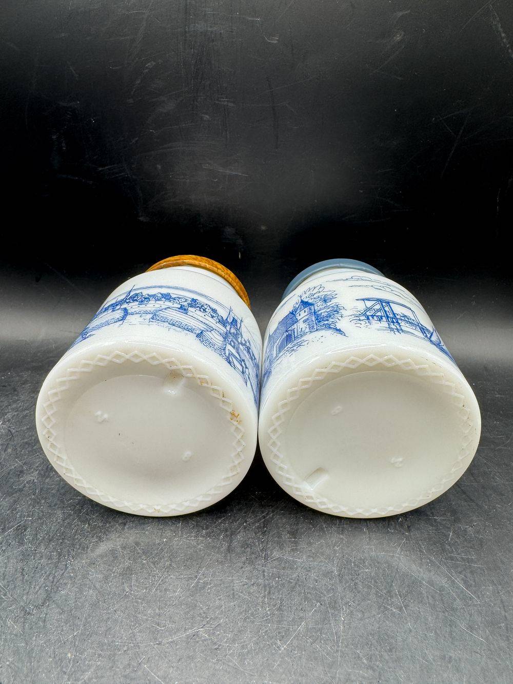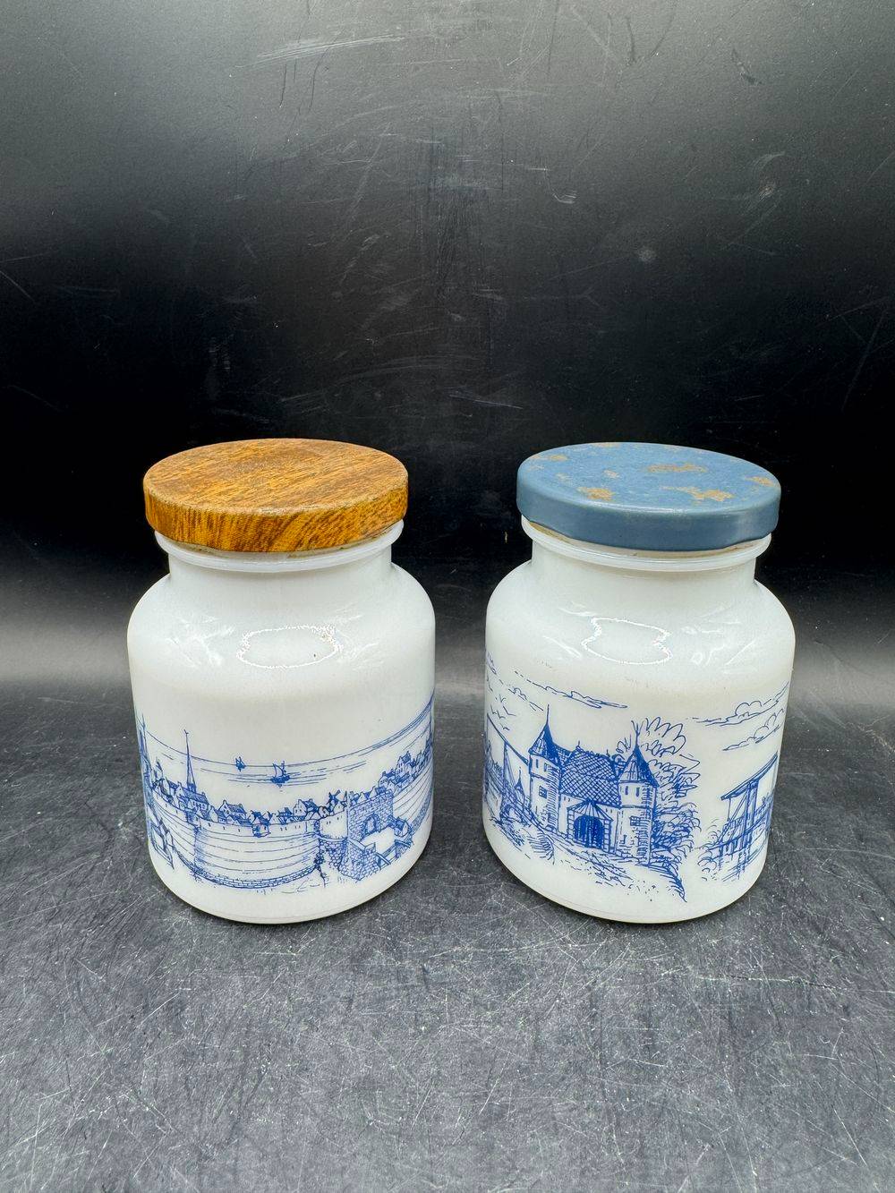 Ensemble / Lot de deux anciens pots à moutarde en opaline blanche – Décors bleu différents – Circa 1970