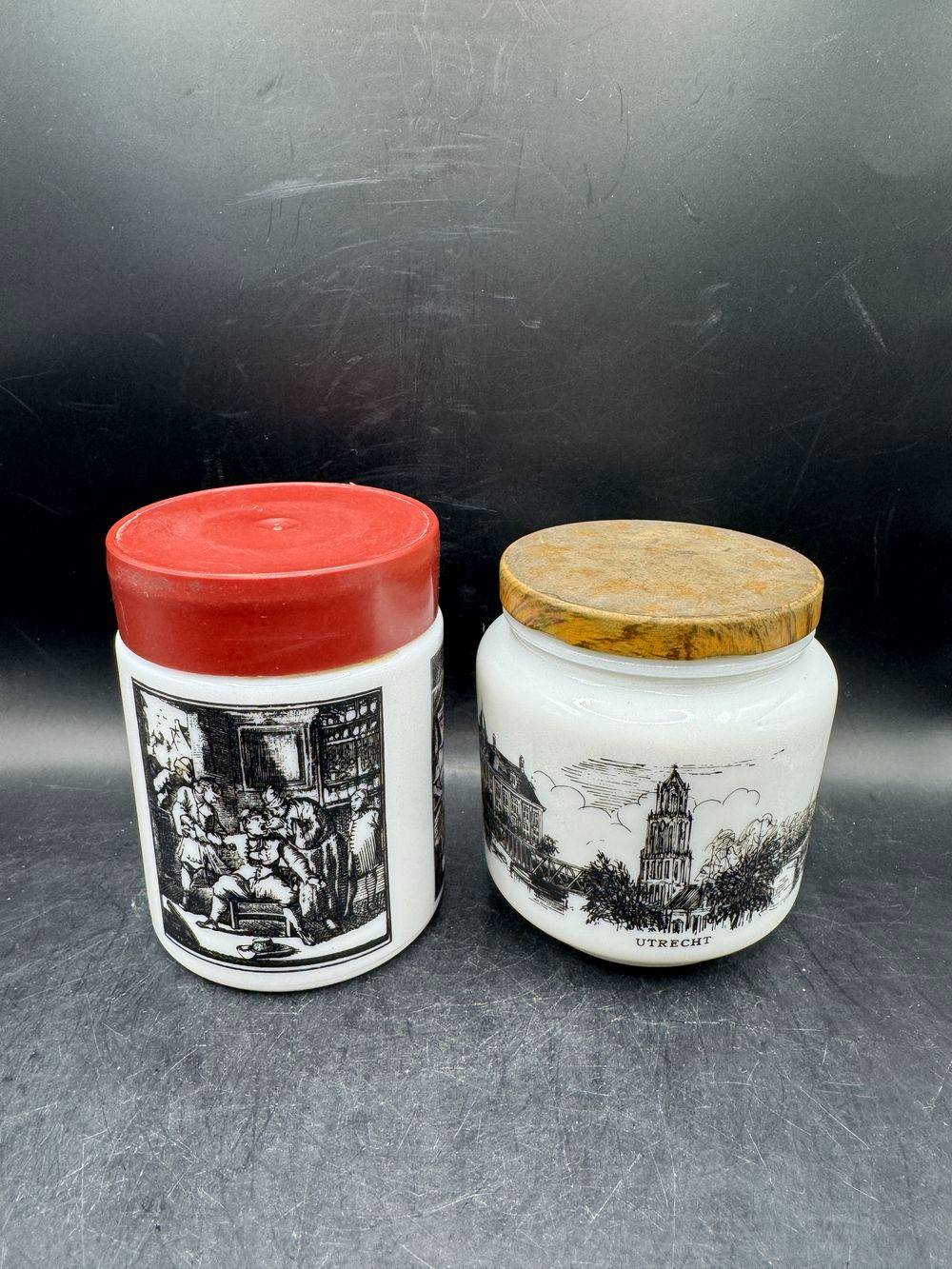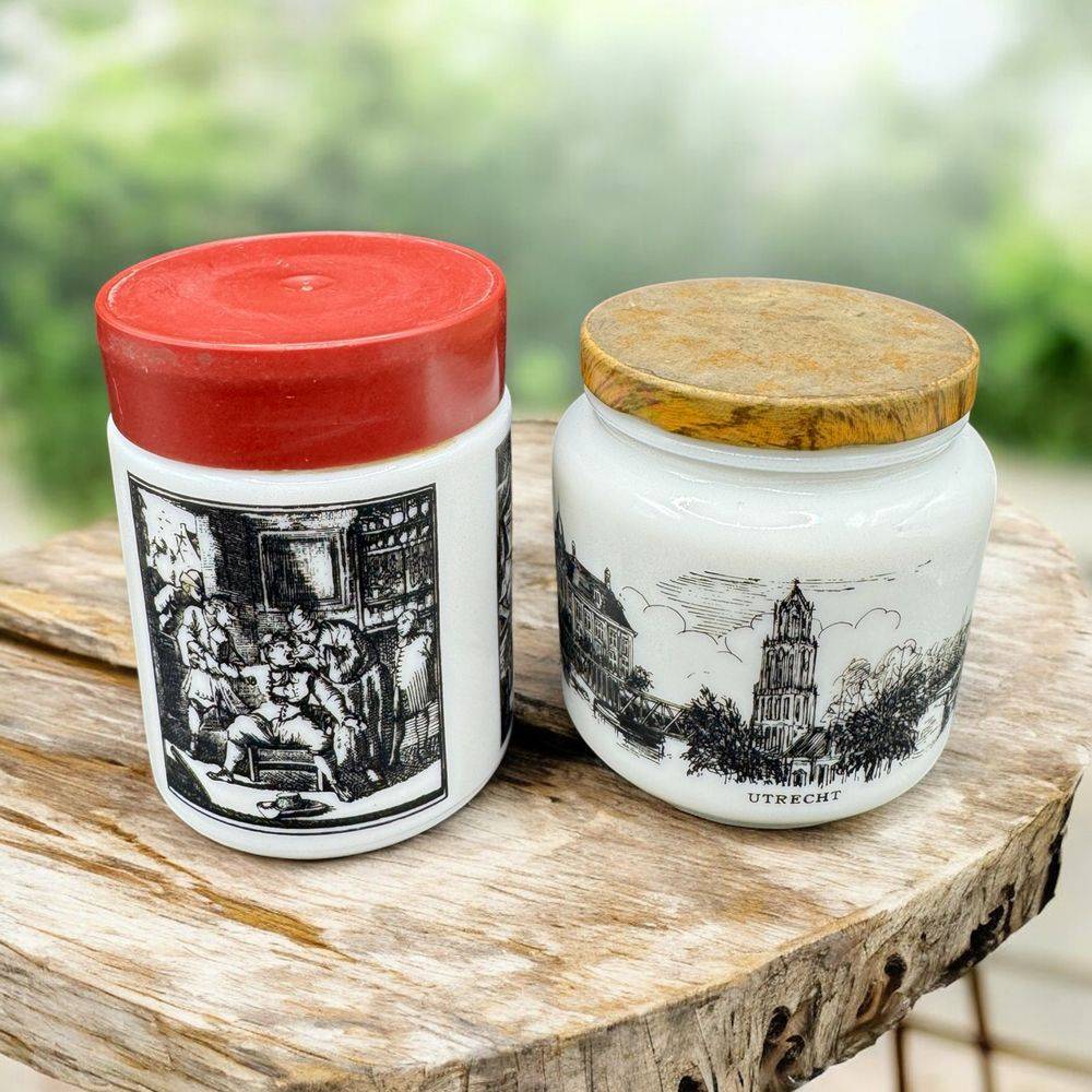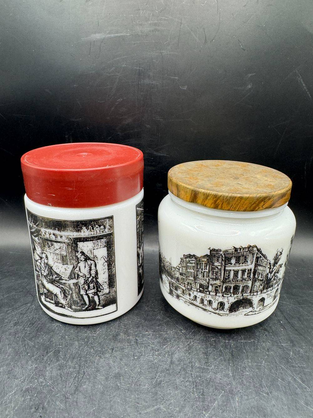 Ensemble / Lot de deux anciens pots à moutarde en opaline blanche – Décors noirs différents – Circa 1970 – Décoration – Collection – Vintage