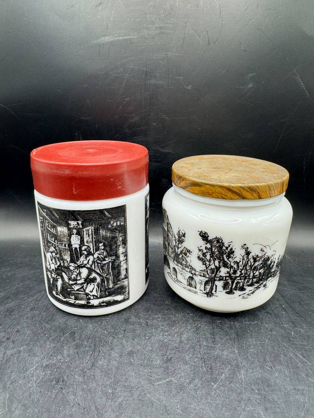 Ensemble / Lot de deux anciens pots à moutarde en opaline blanche – Décors noirs différents – Circa 1970