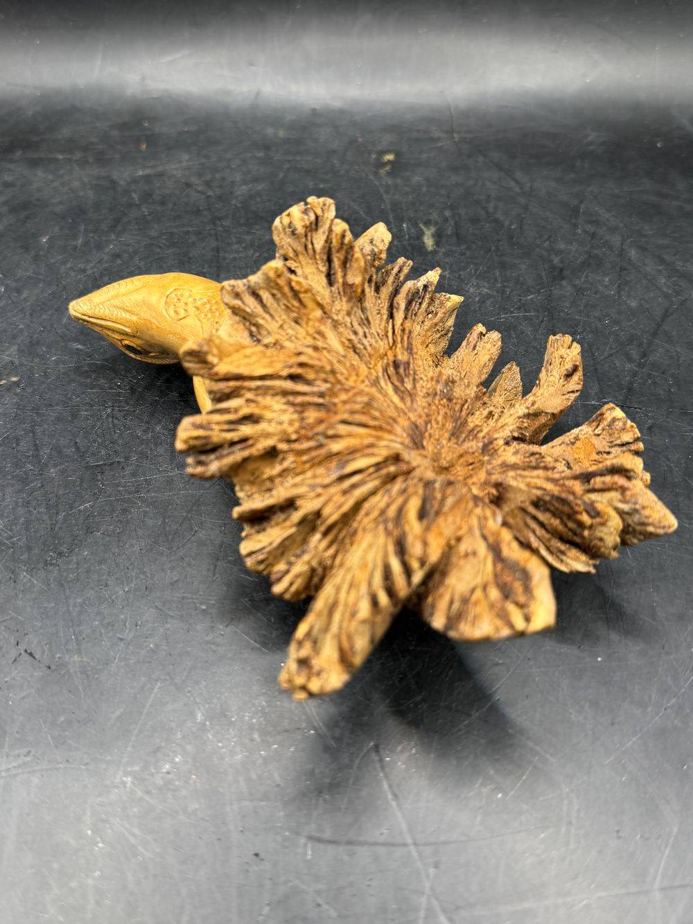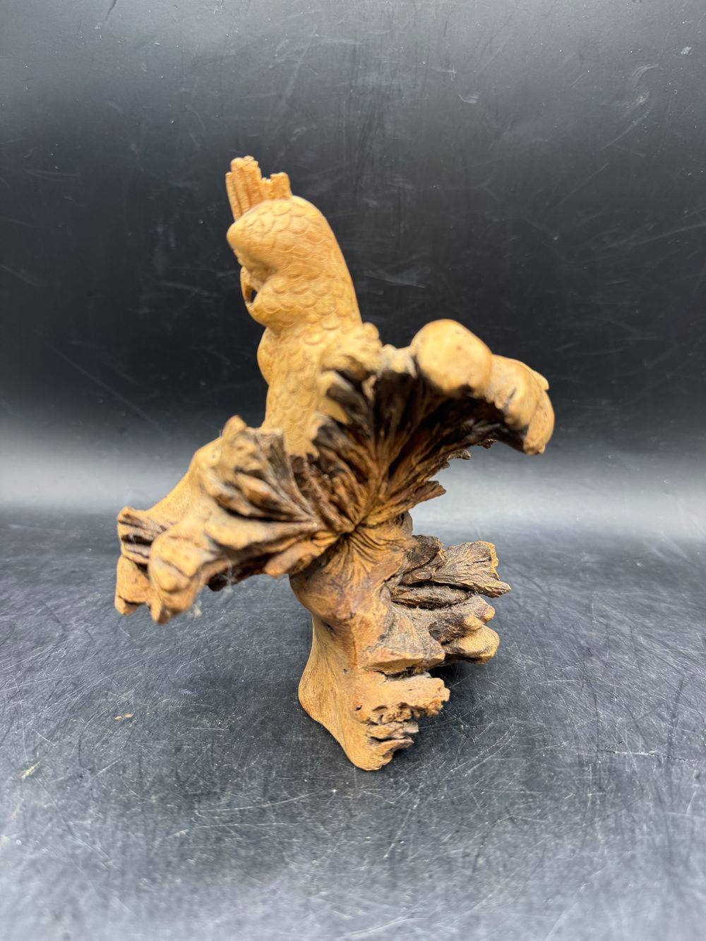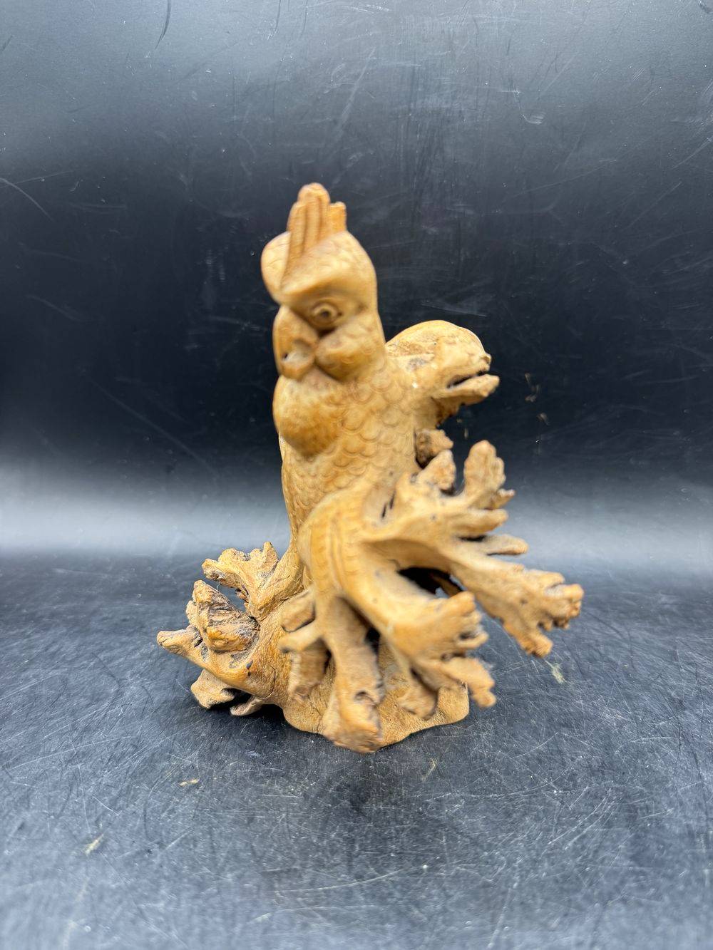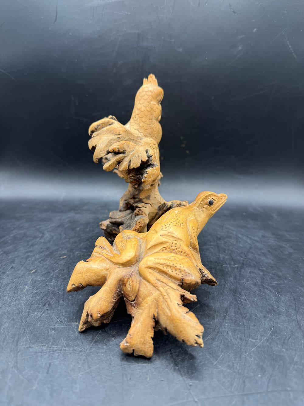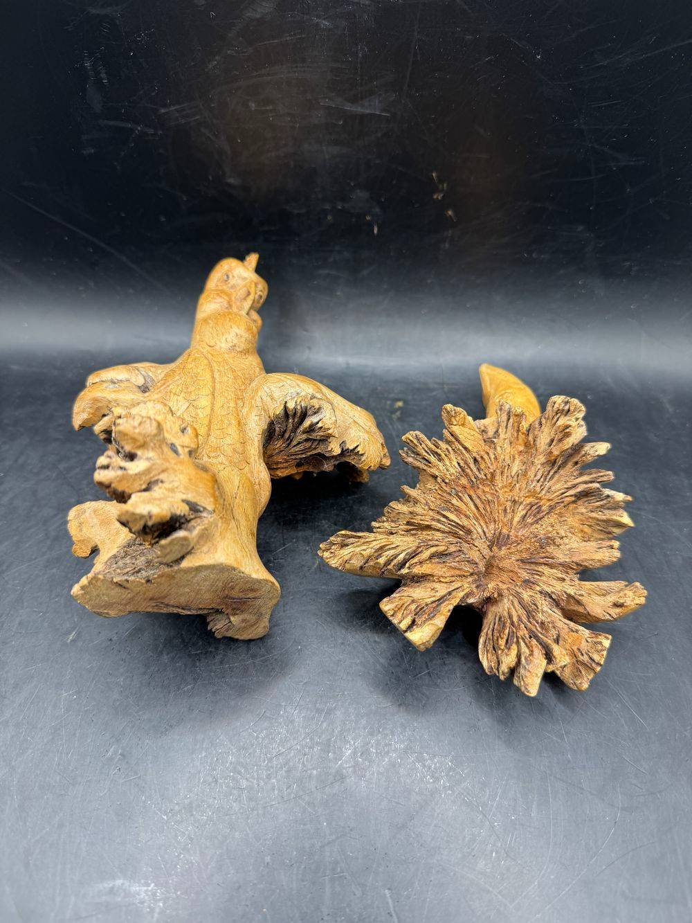 Ensemble / Lot de deux uniques pièces sculptées à la main à partir d’une seule pièce de bois parasite représentant ici un oiseau (perroquet) et une grenouille