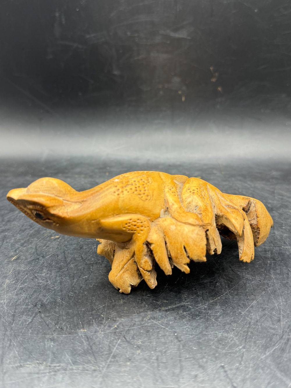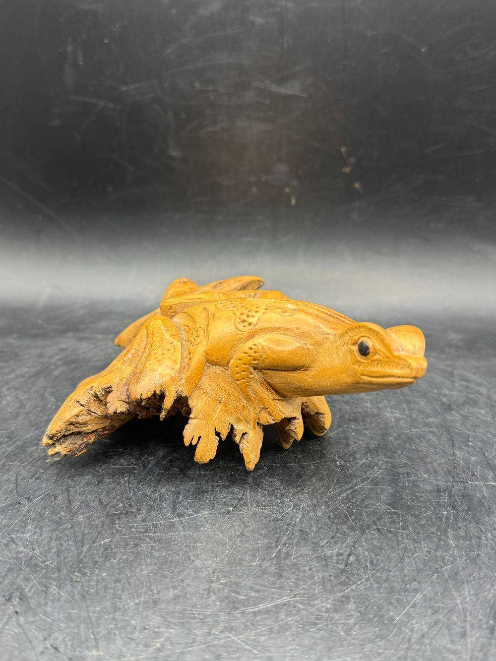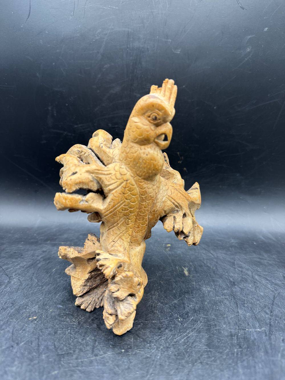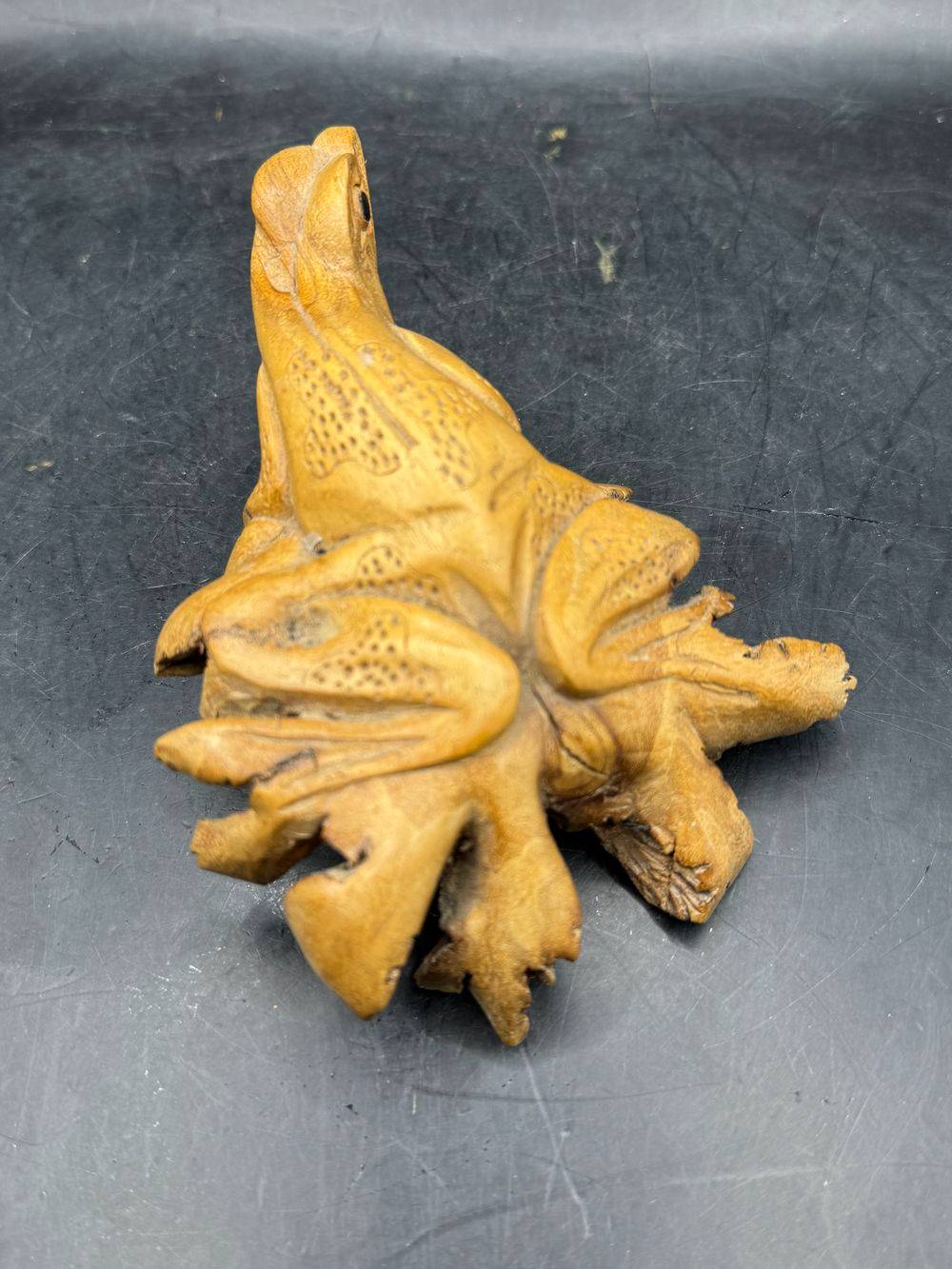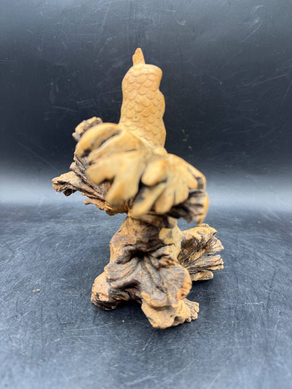 Ensemble / Lot de deux uniques pièces sculptées à la main à partir d’une seule pièce de bois parasite représentant ici un oiseau (perroquet) et une grenouille