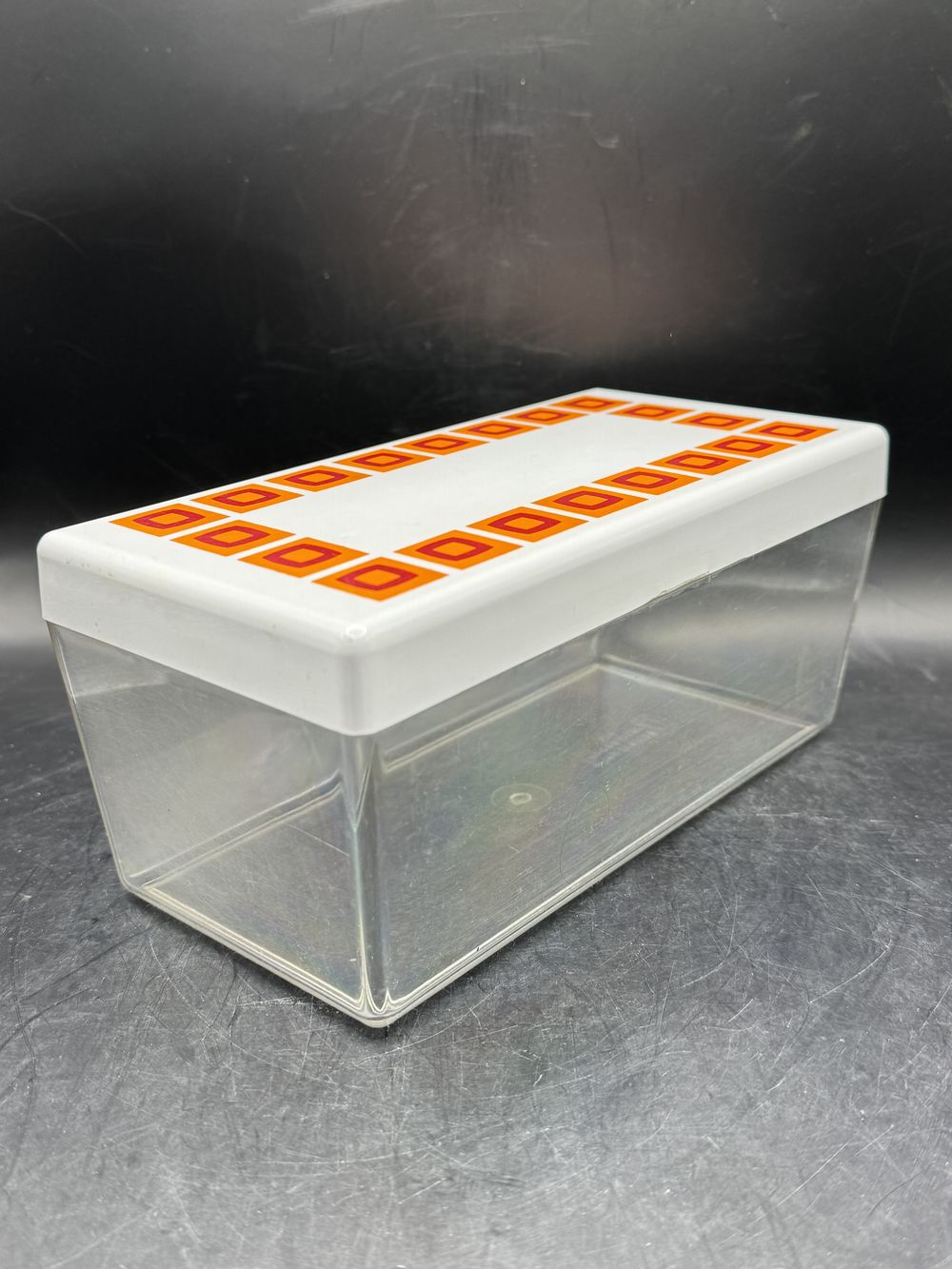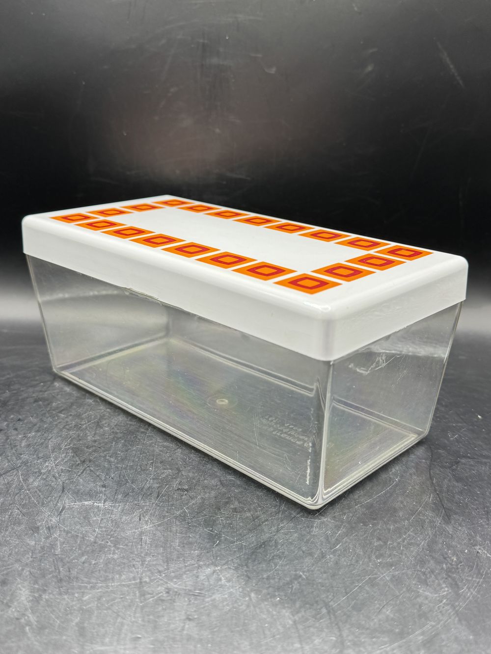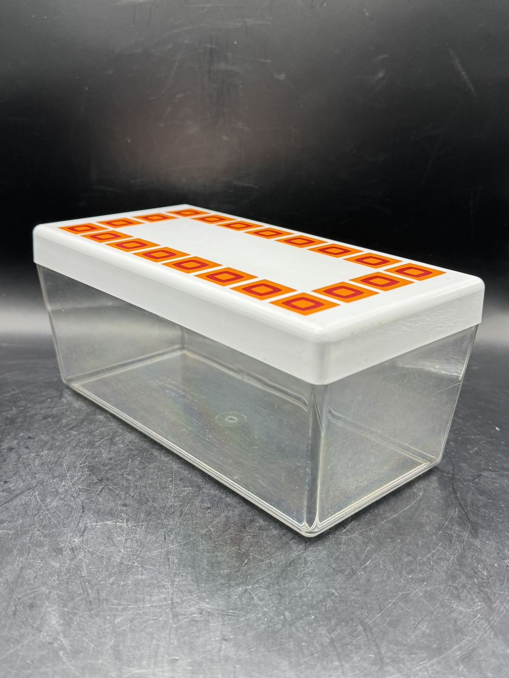 Grande boite en plastique de rangement de cuisine – Des années 70 – Transparente, blanche, rouge et orange – Déco Vintage