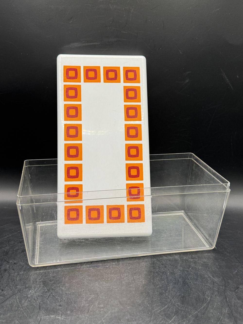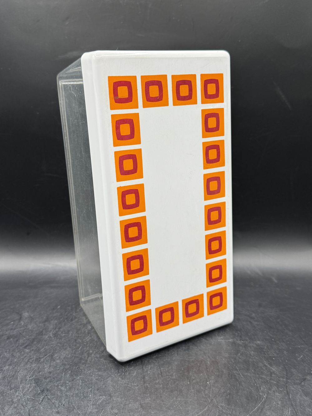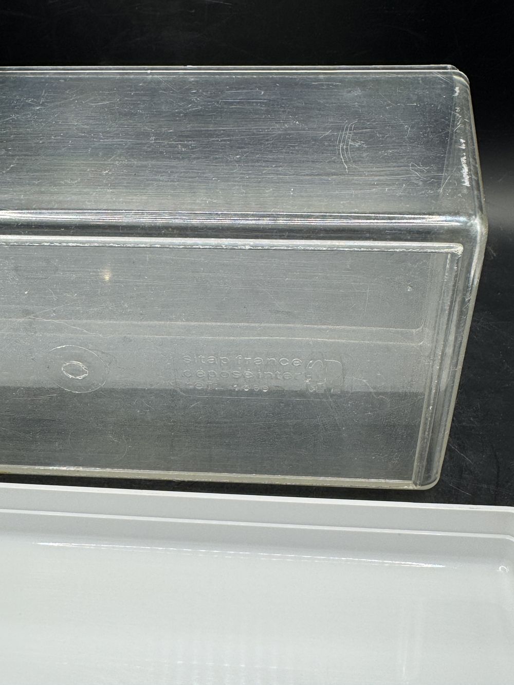 Grande boite en plastique de rangement de cuisine – Des années 70 – Transparente, blanche, rouge et orange – Déco Vintage
