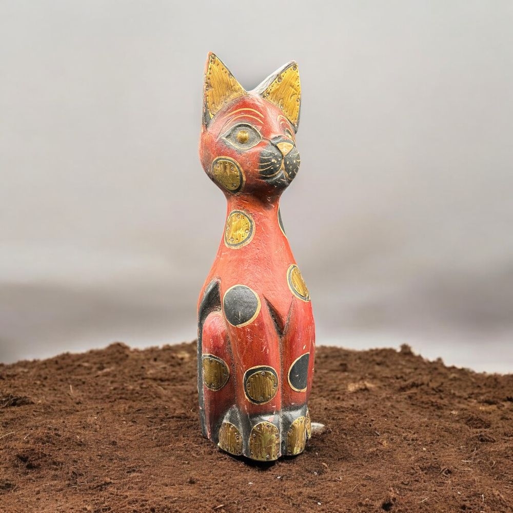 Grande statuette en bois d’un chat – Sculptée et peinte main, teinte rouge dominante, avec décor laiton