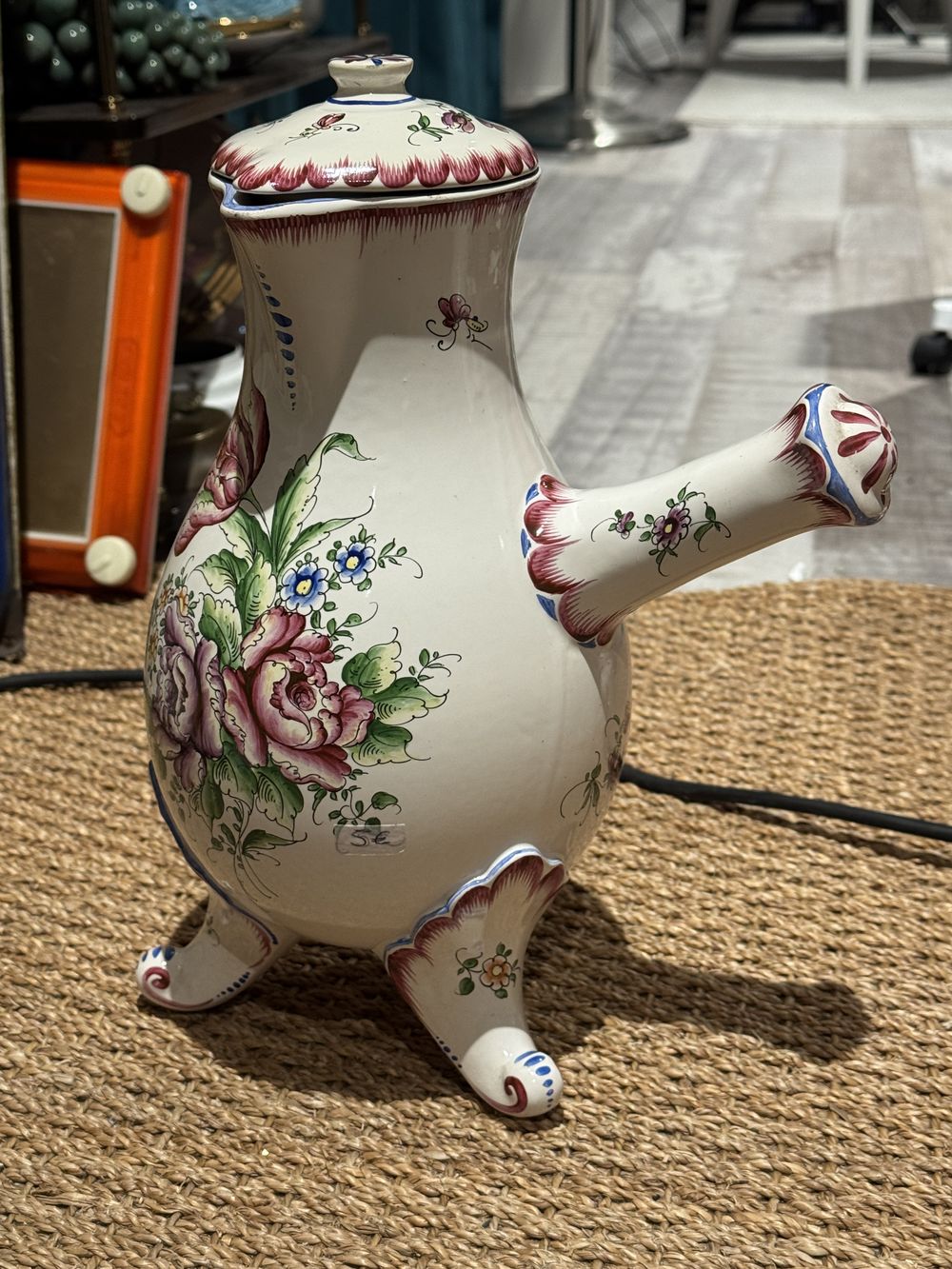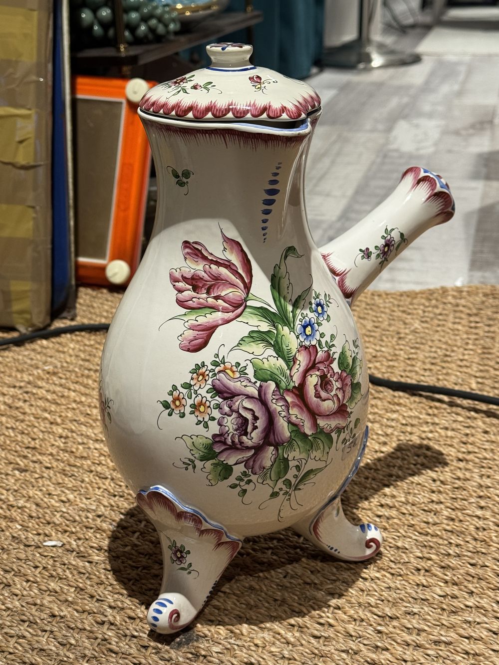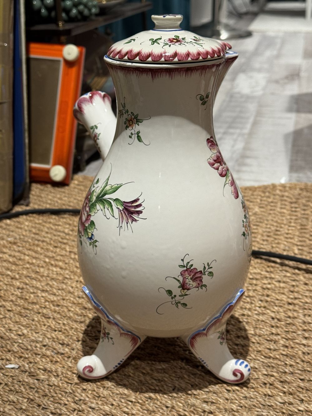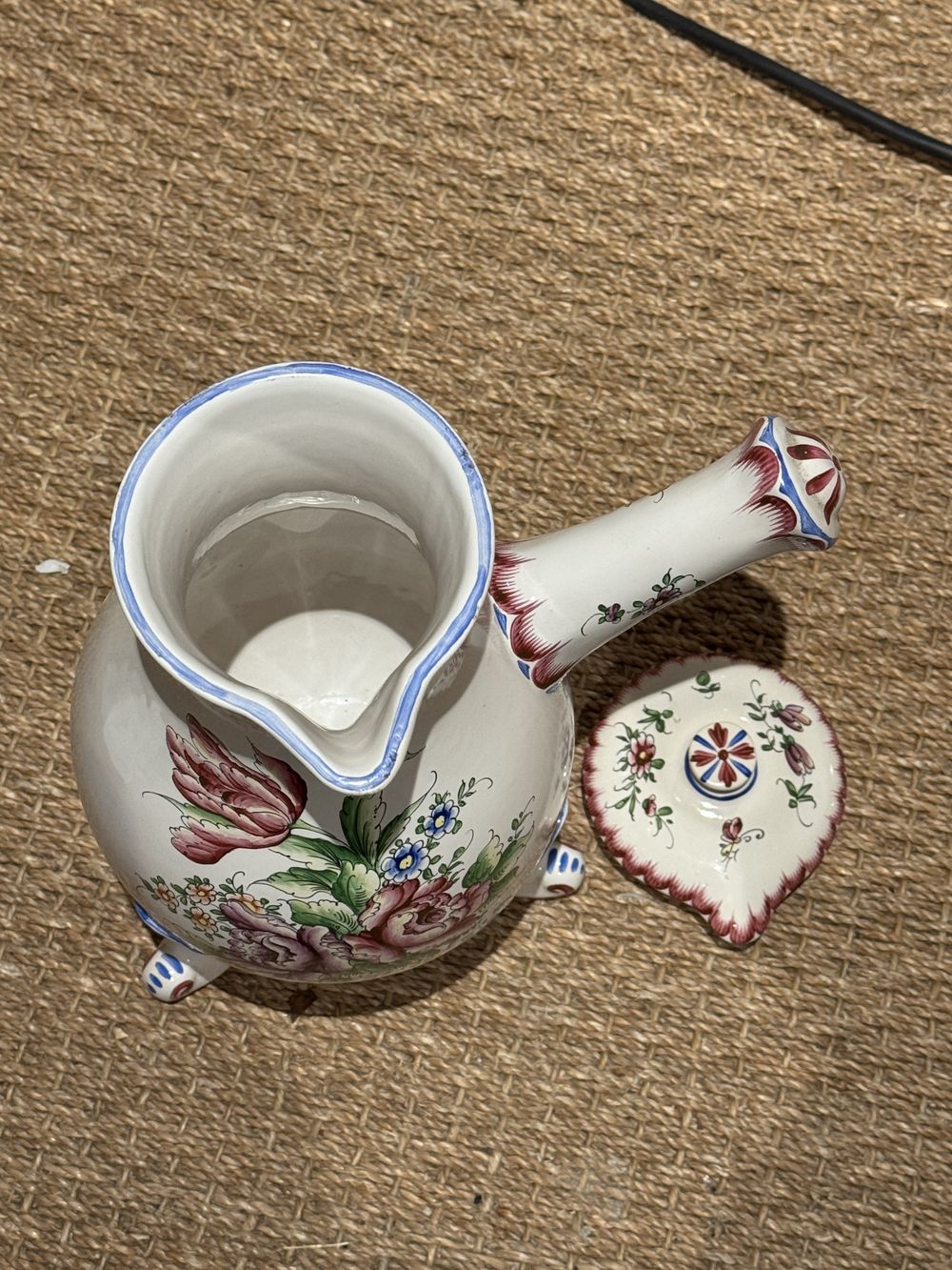 Imposante (par sa taille) Chocolatière en faïence fine de Clamecy à décor floral polychrome émaillé peint de couleurs fraiches