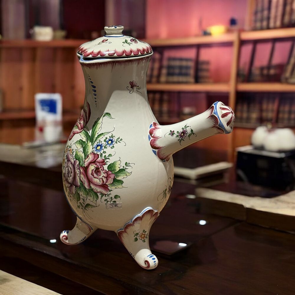 Imposante (par sa taille) Chocolatière en faïence fine de Clamecy à décor floral polychrome émaillé peint de couleurs fraiches – Fin 19ème – Made in France – Signée – Collection – Décoration