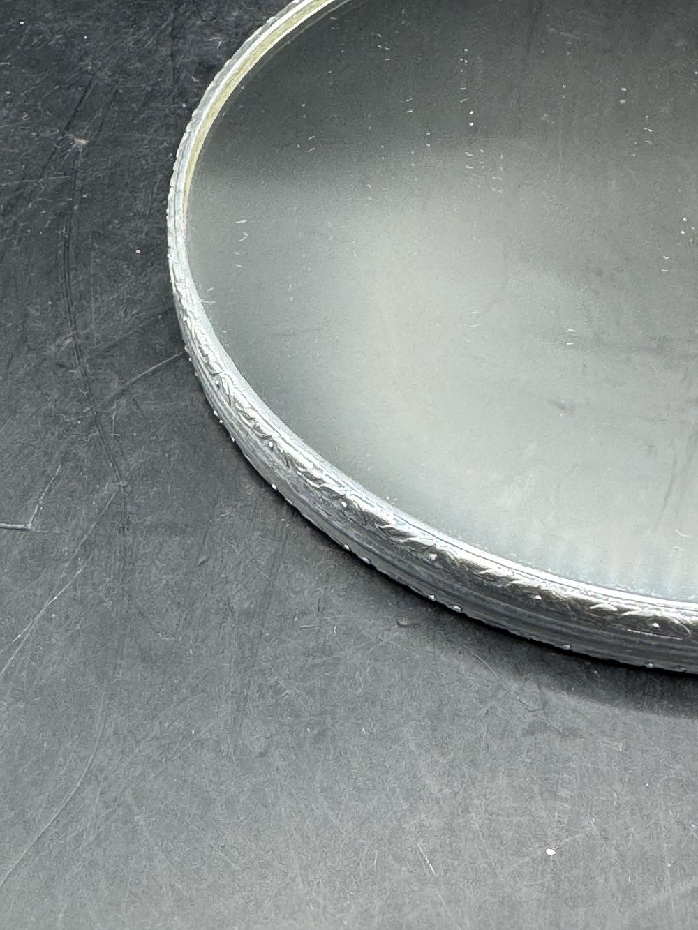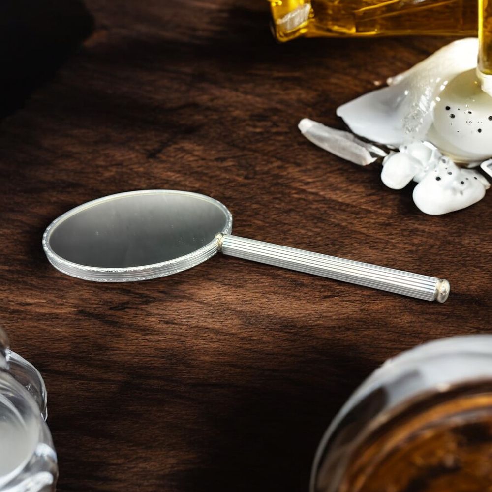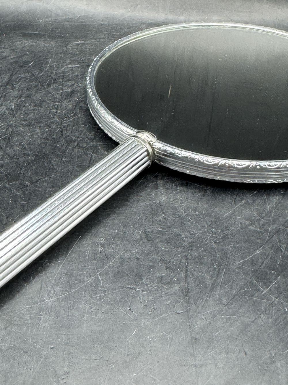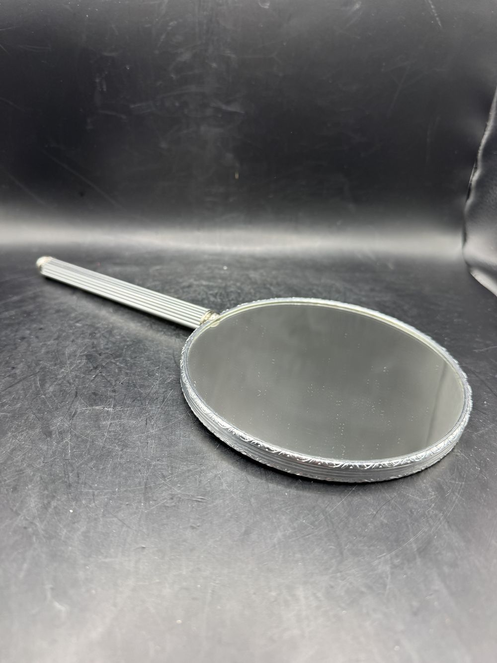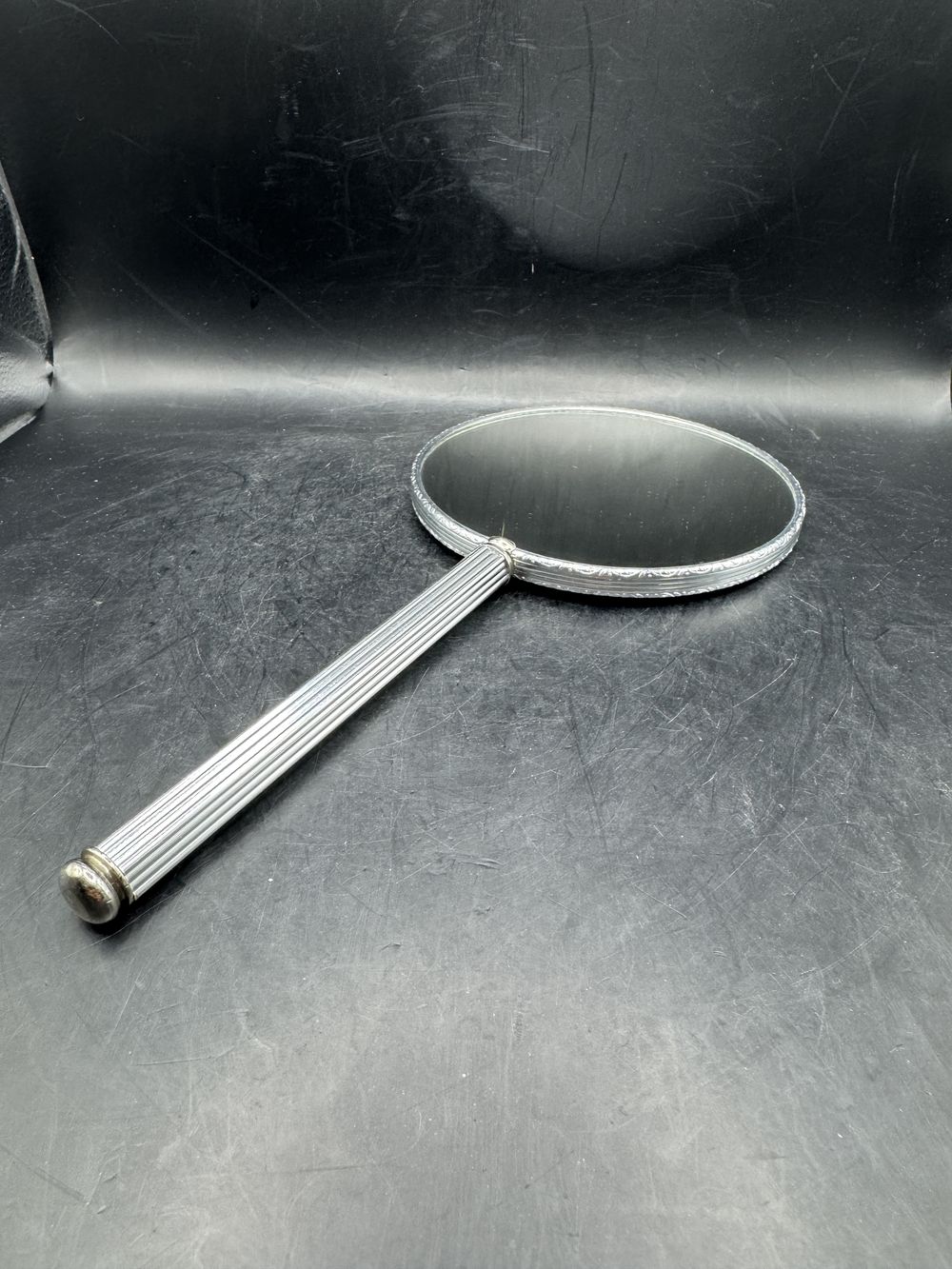 Joli et rare miroir (recto verso) à main en métal chromé – Décor travaillé sur le pourtour